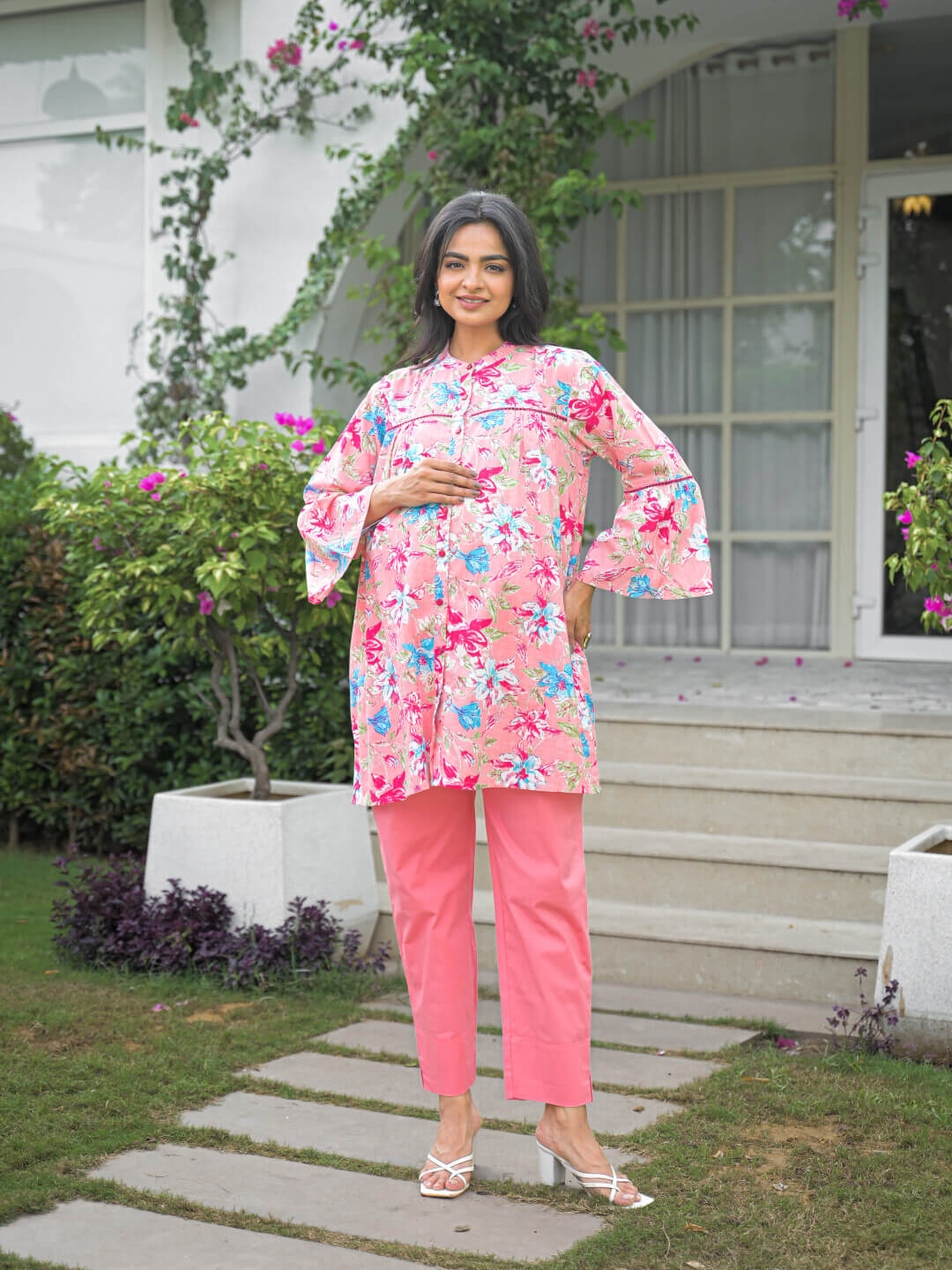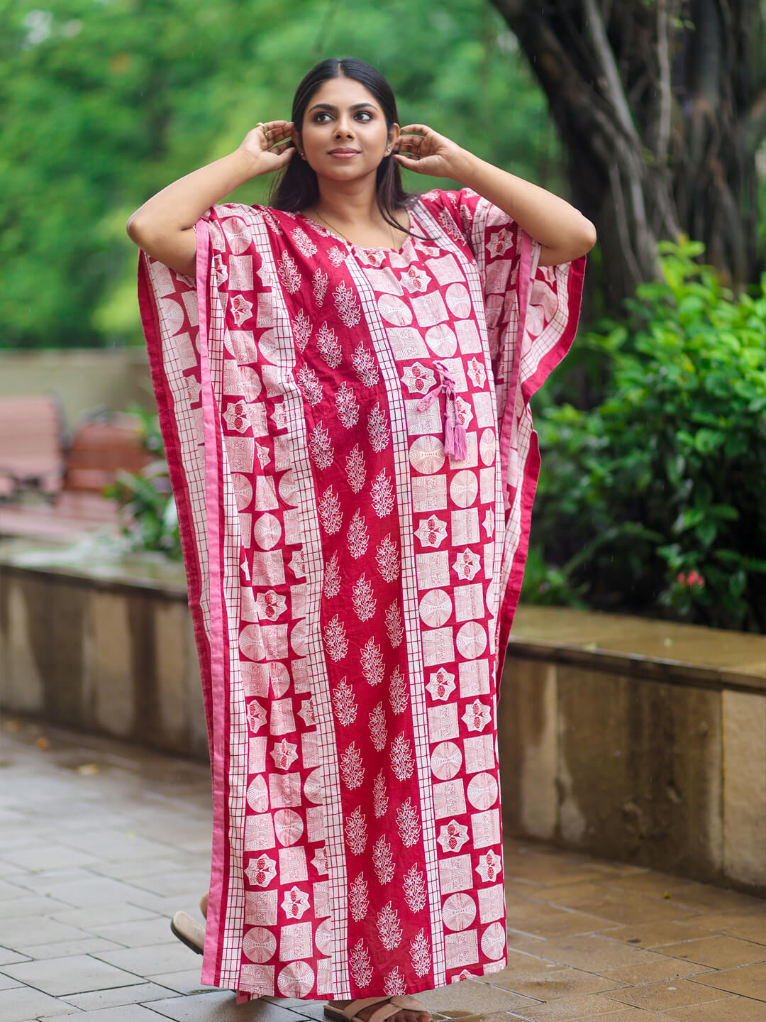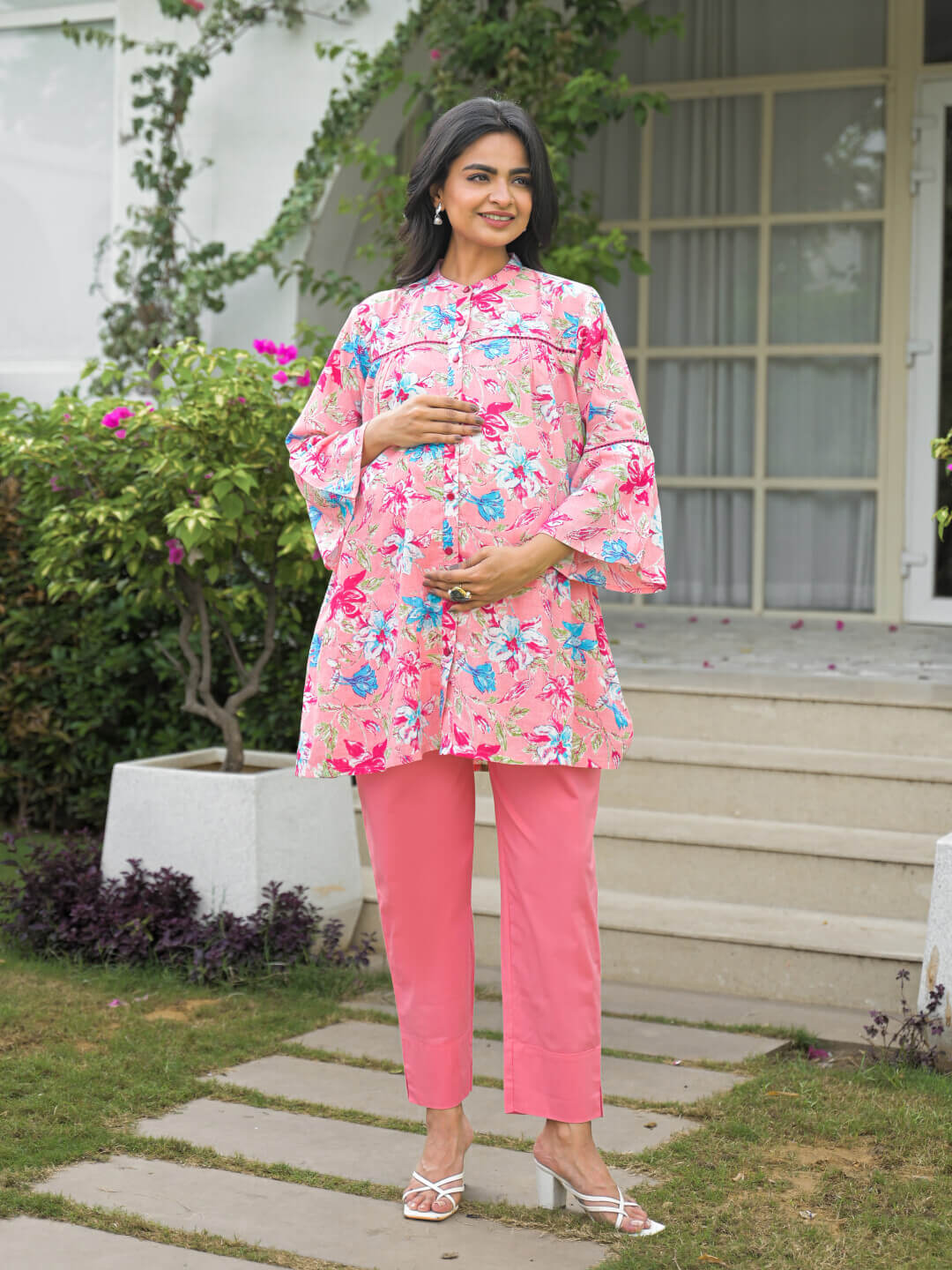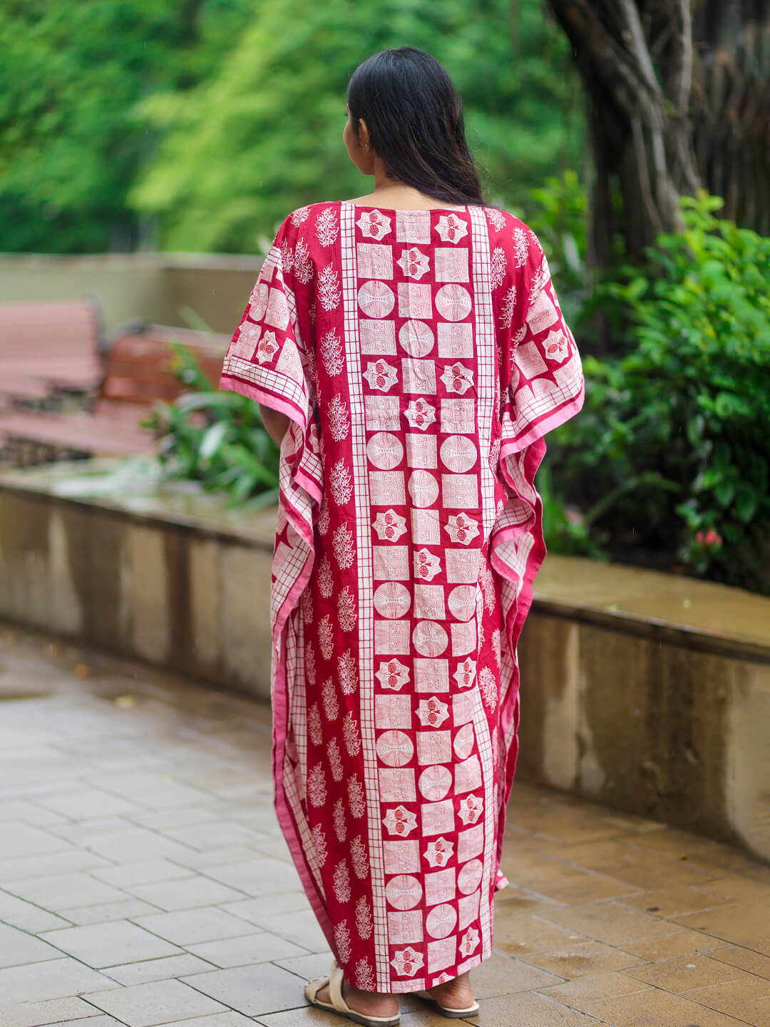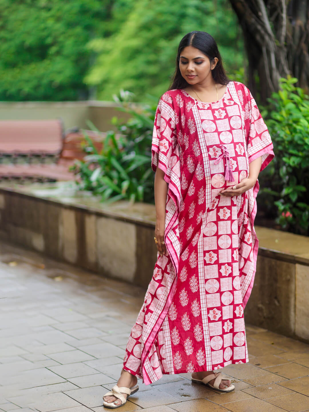 Maroon Printed Front Zipper Maternity Feeding Kaftan