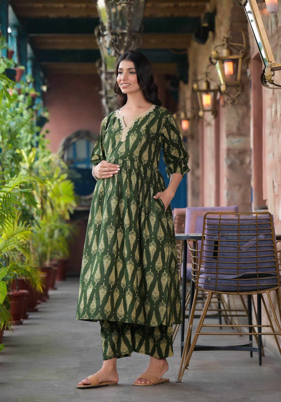 Bottle Green Cotton Printed Maternity Feeding Kurta Set