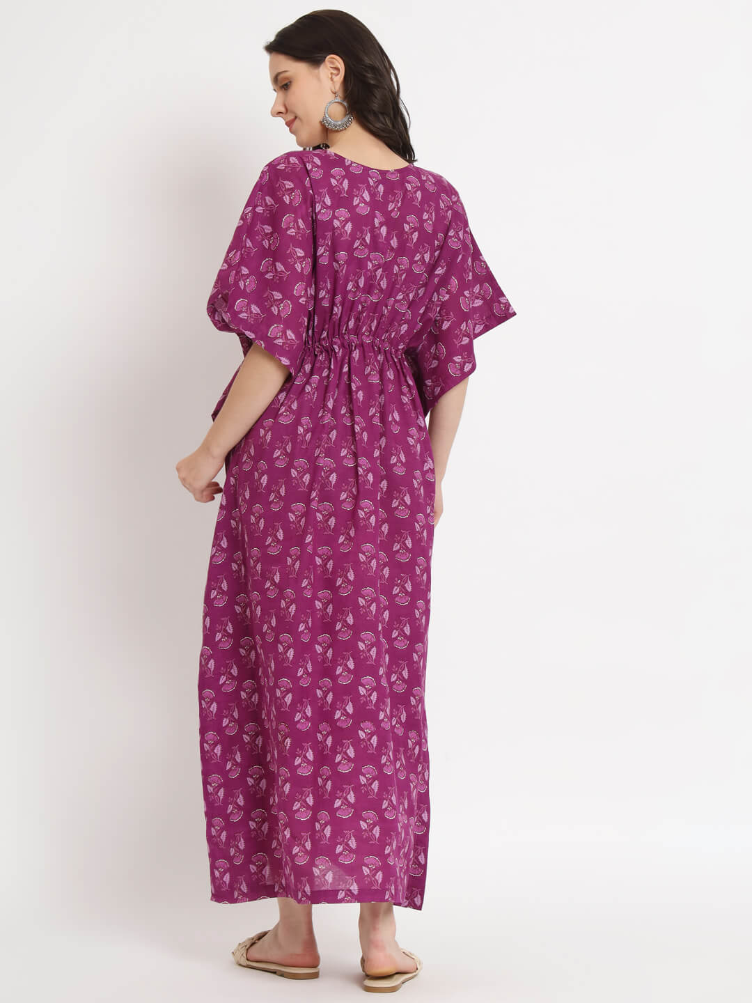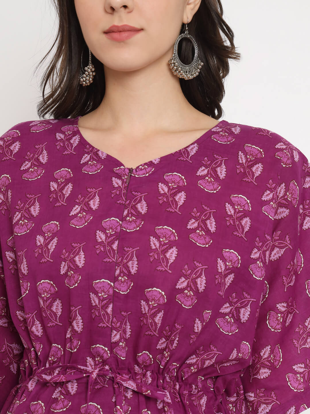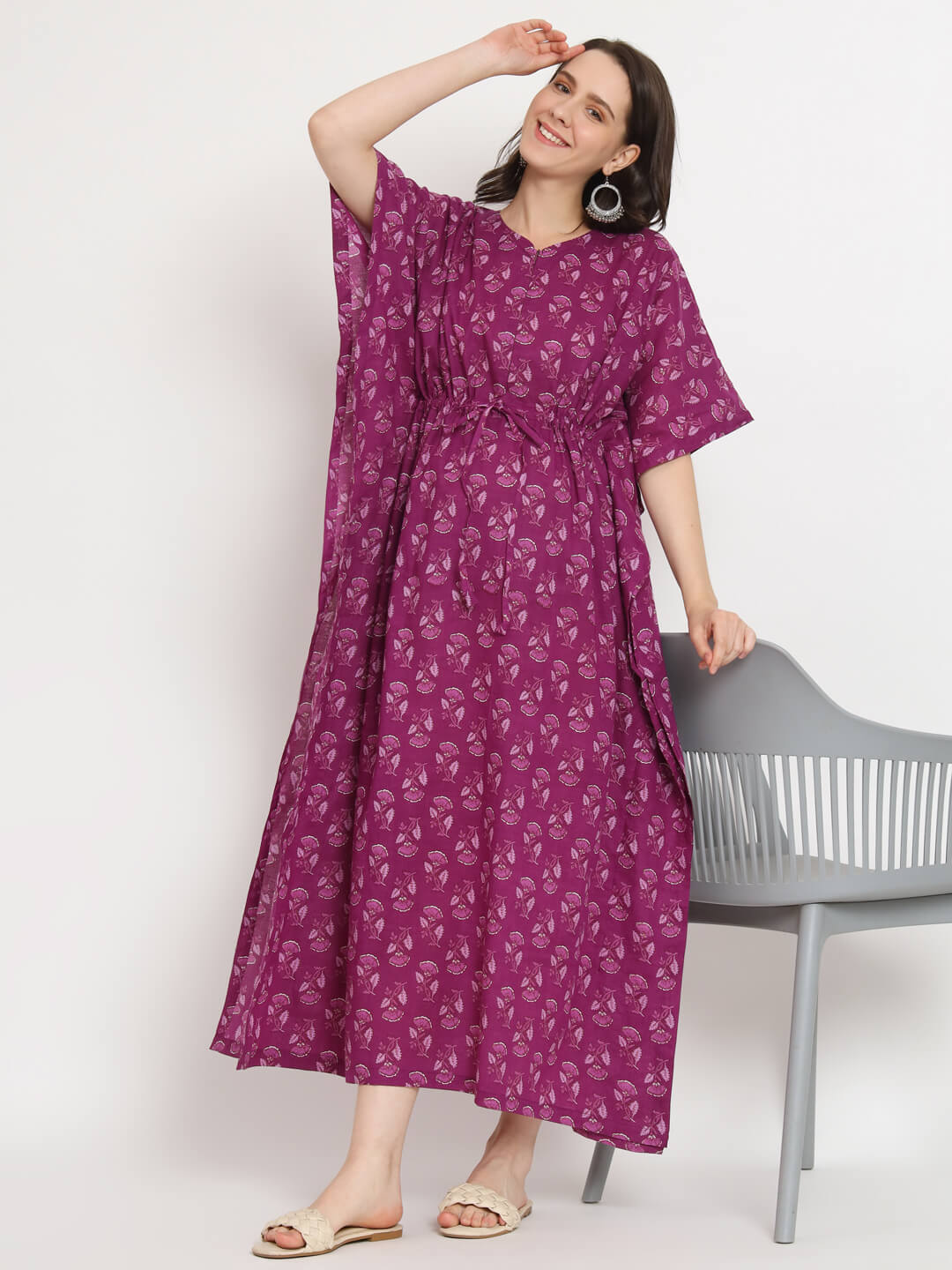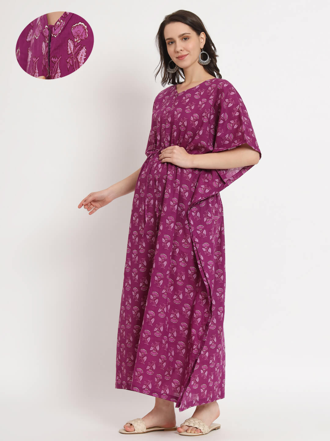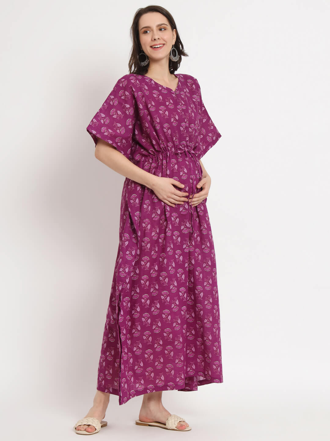 Purple Printed Front Zipper Maternity Feeding Kaftan