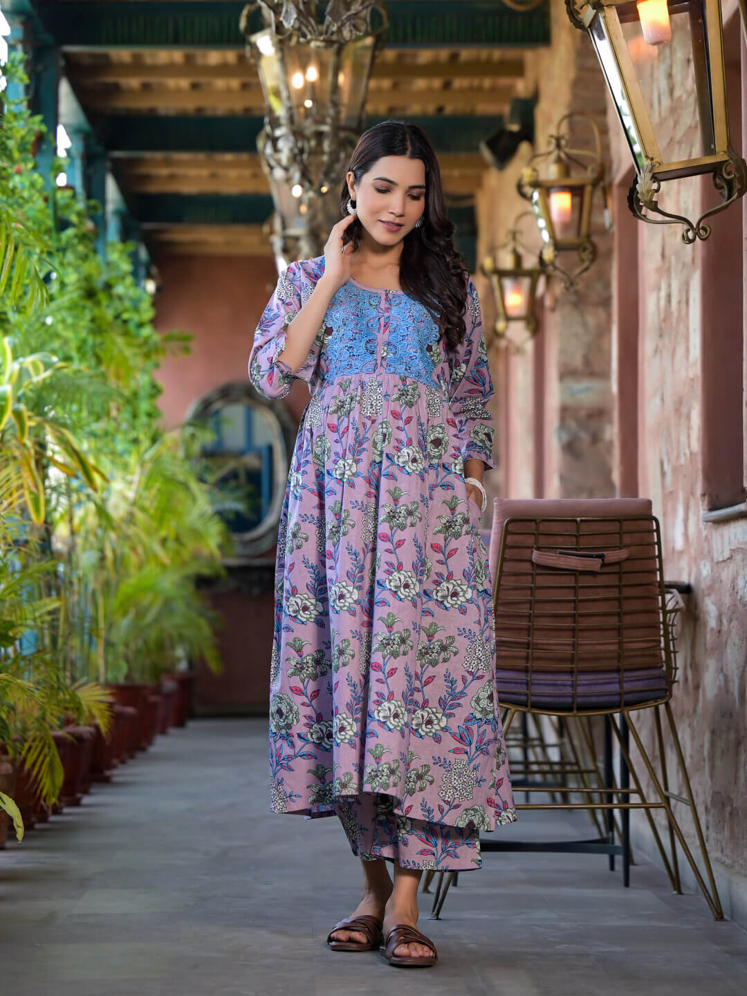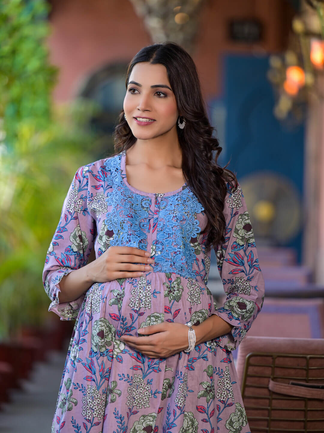 Lavender Blue Cotton Printed Maternity Feeding Kurta Set