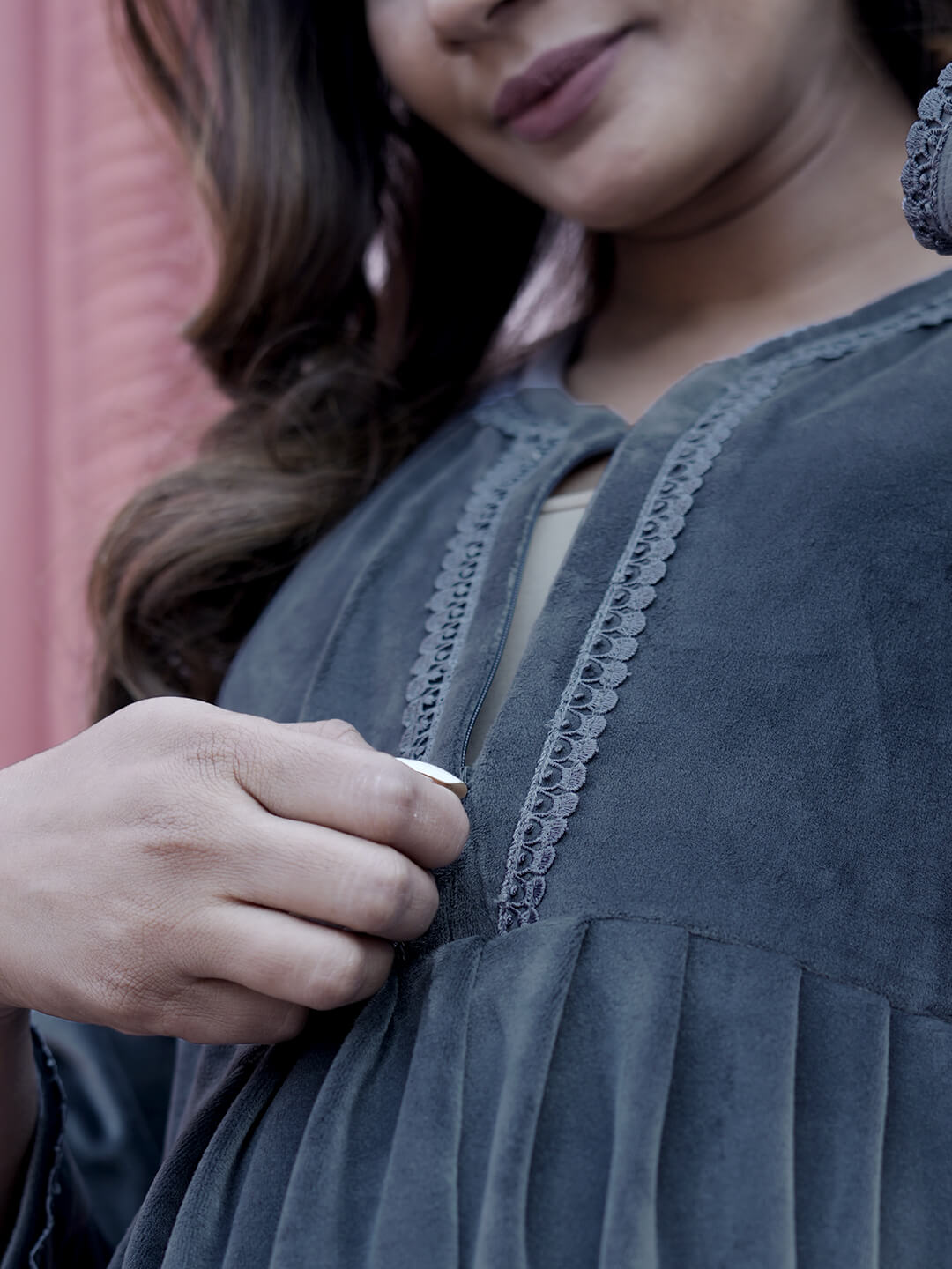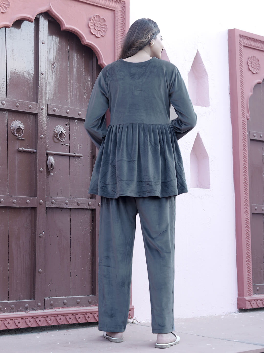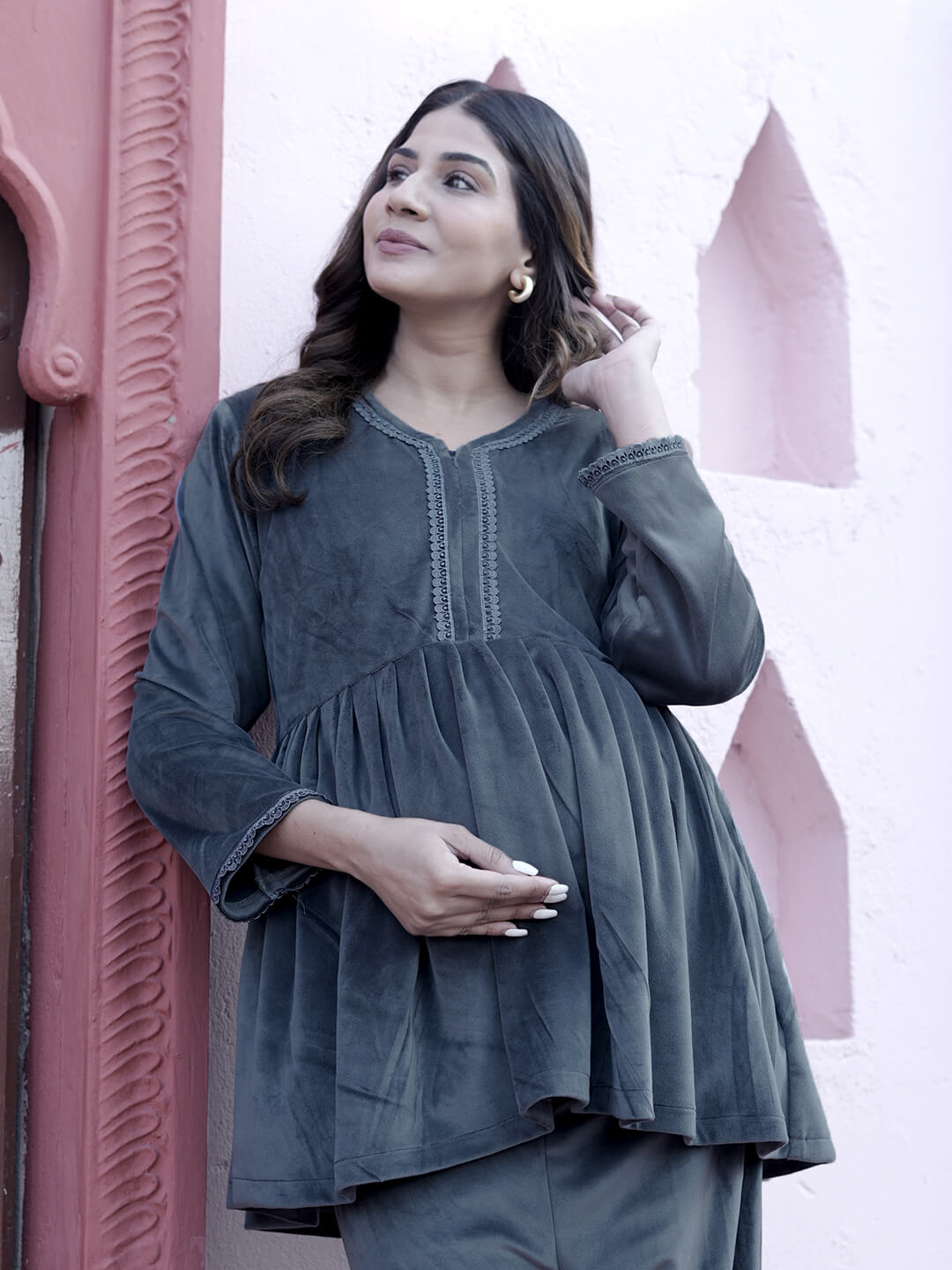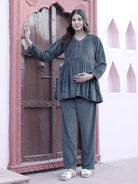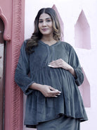Grey Velvet Maternity Feeding Night Suit