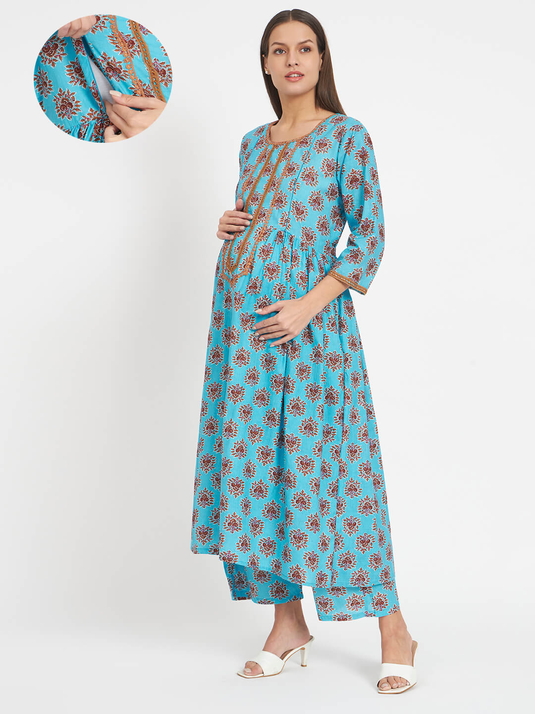 Turquoise Cotton Printed Maternity Feeding Kurta Set