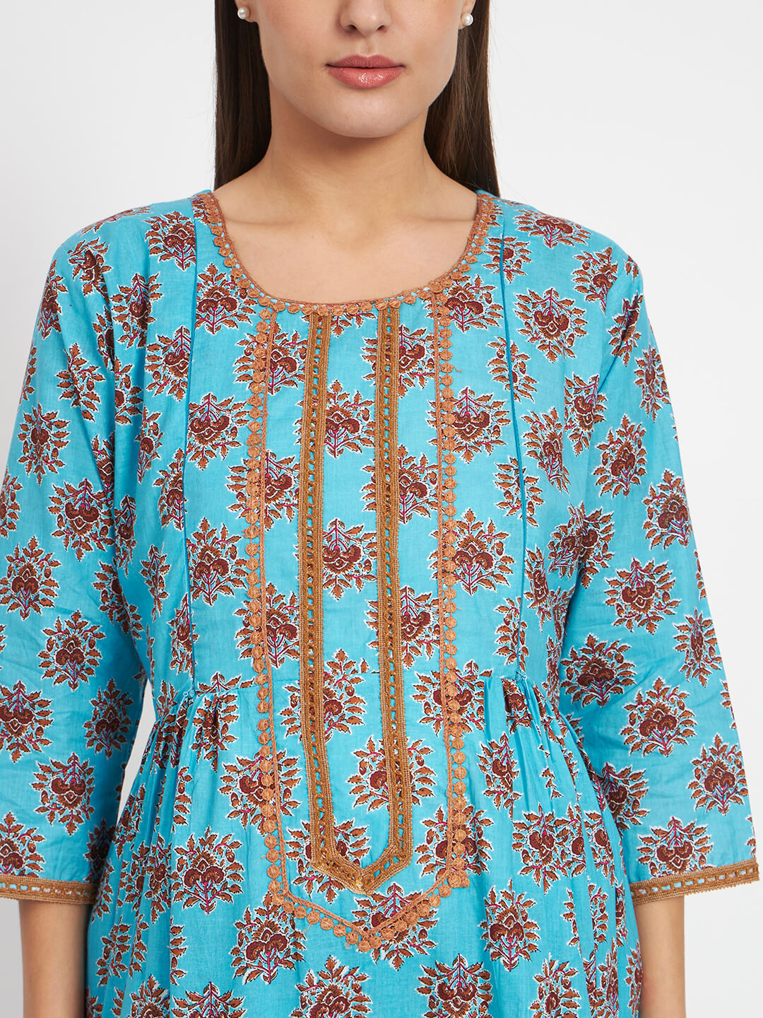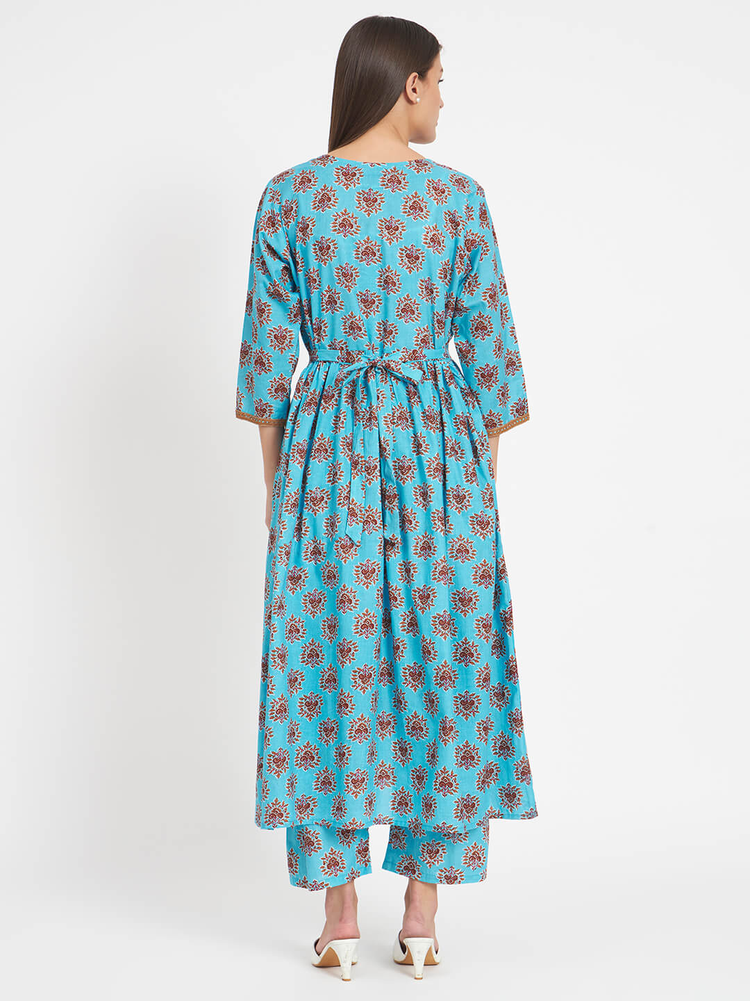Turquoise Blue Cotton Printed Maternity Feeding Flared Kurta Set