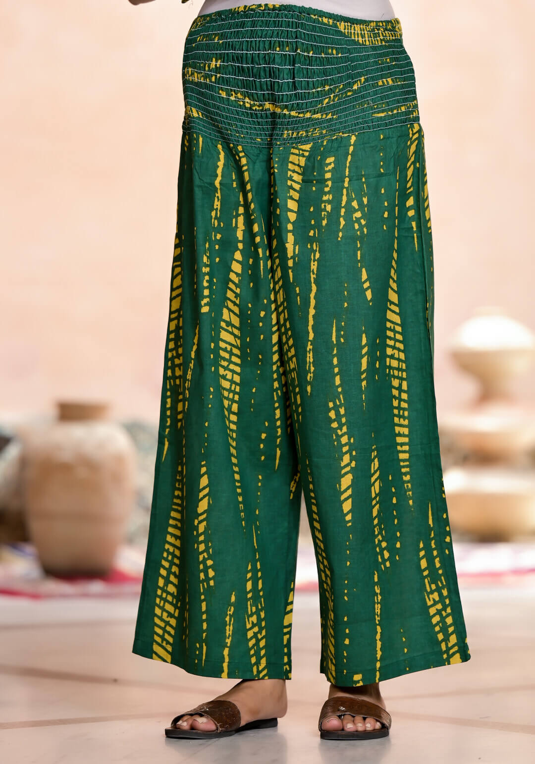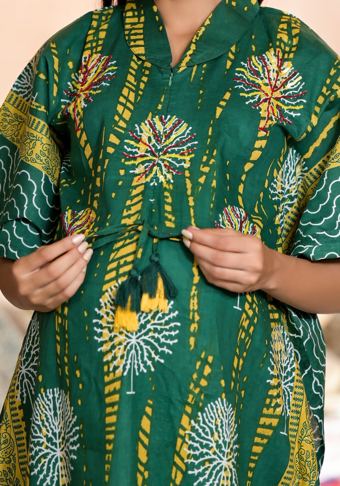 Bottle Green Yellow Cotton Printed Maternity Feeding Kaftan Co-Ord Set