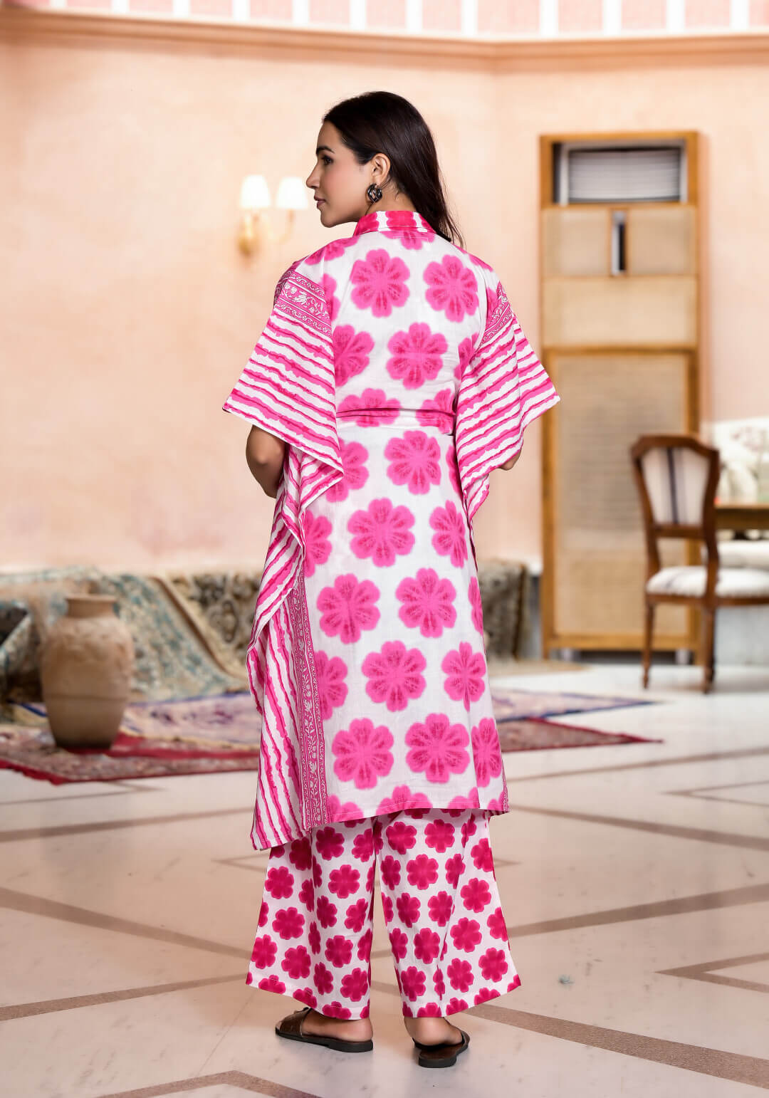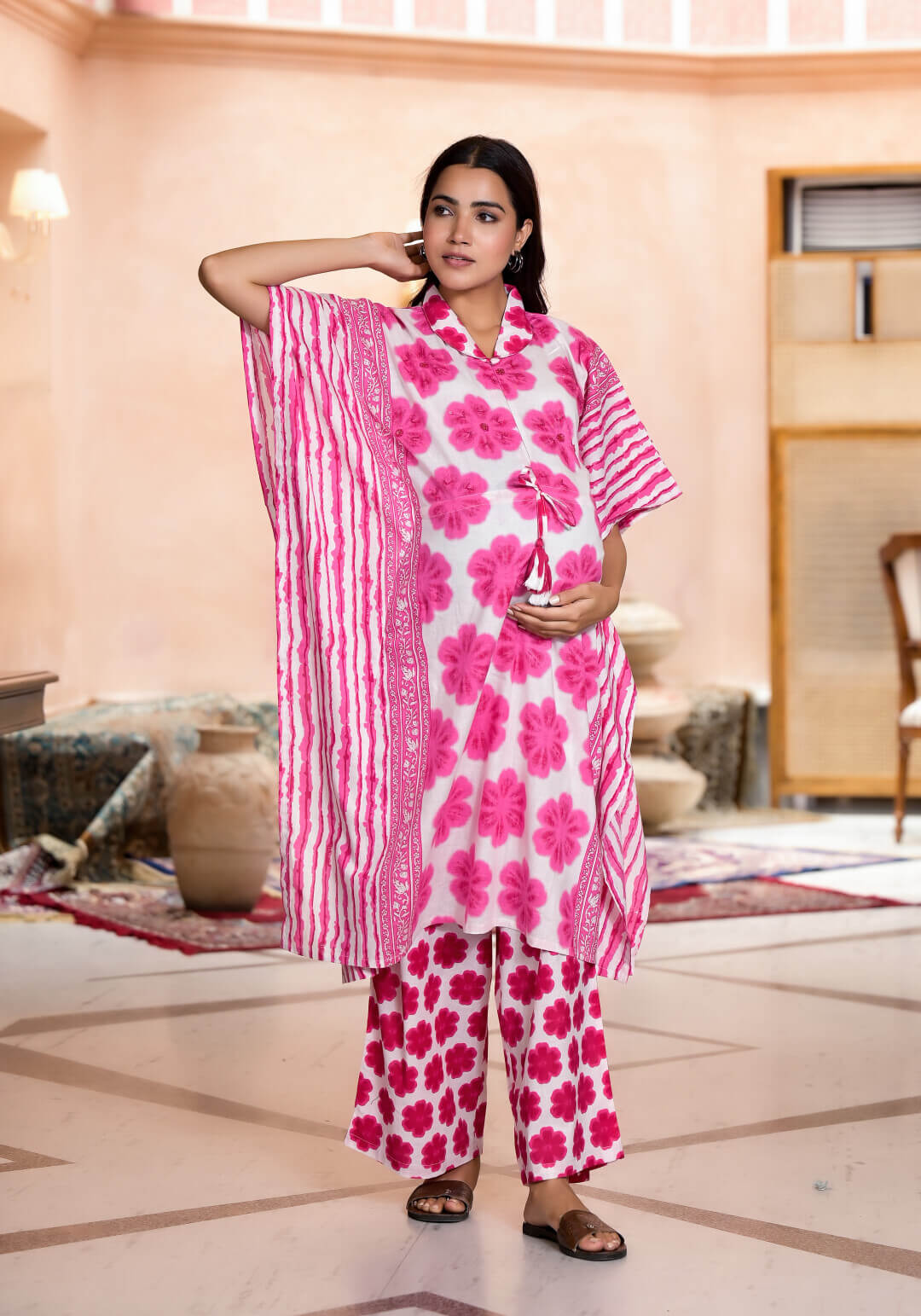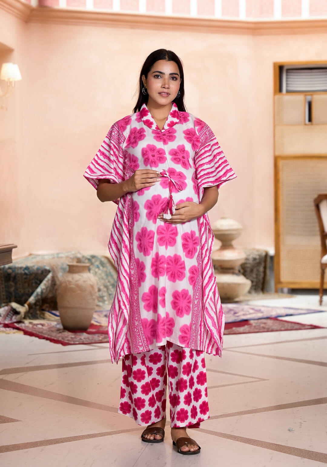 Pink Cotton Printed Maternity Feeding Kaftan Co-Ord Set