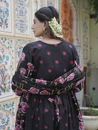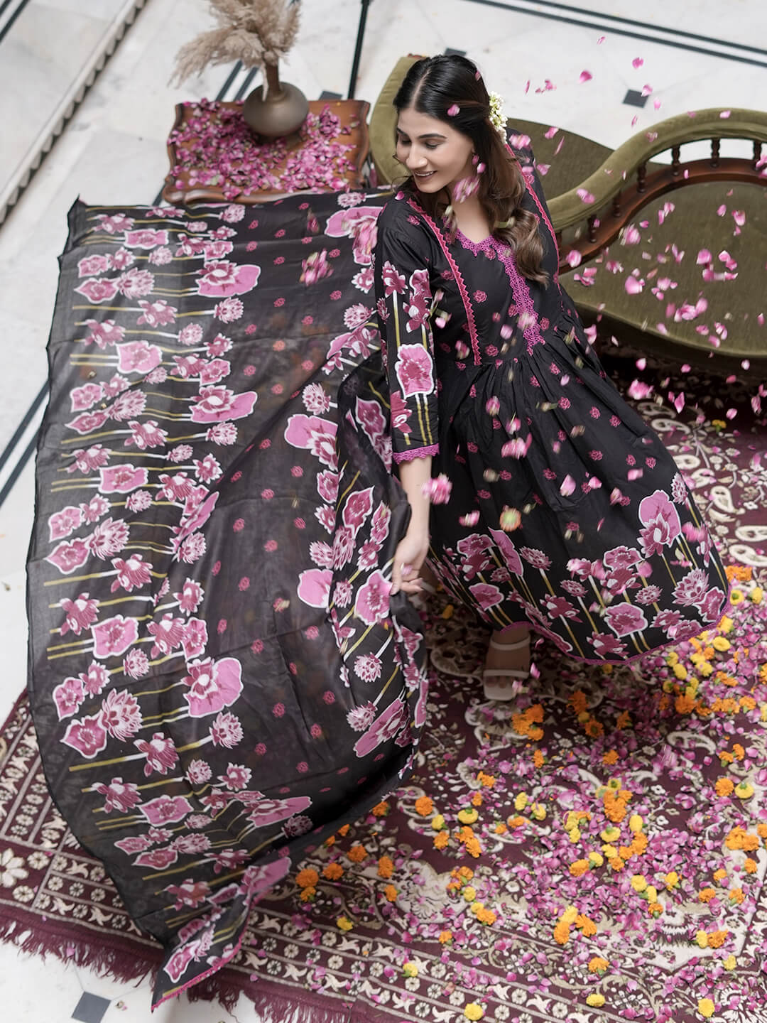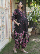 Black Pink Cotton Printed Maternity Feeding Flared Kurta Set with Dupatta