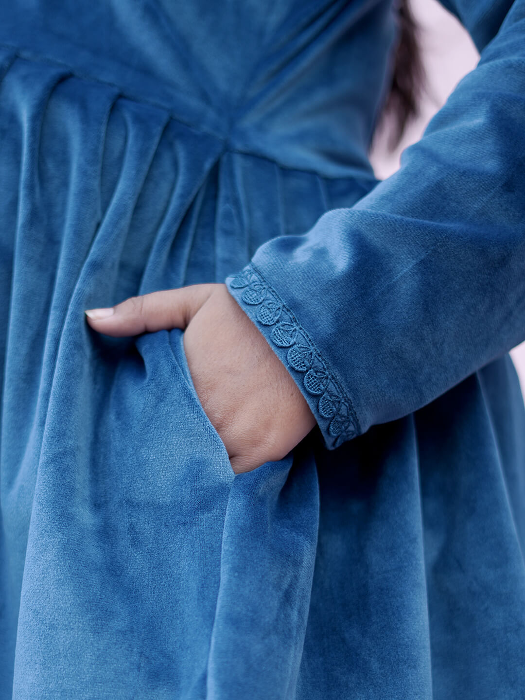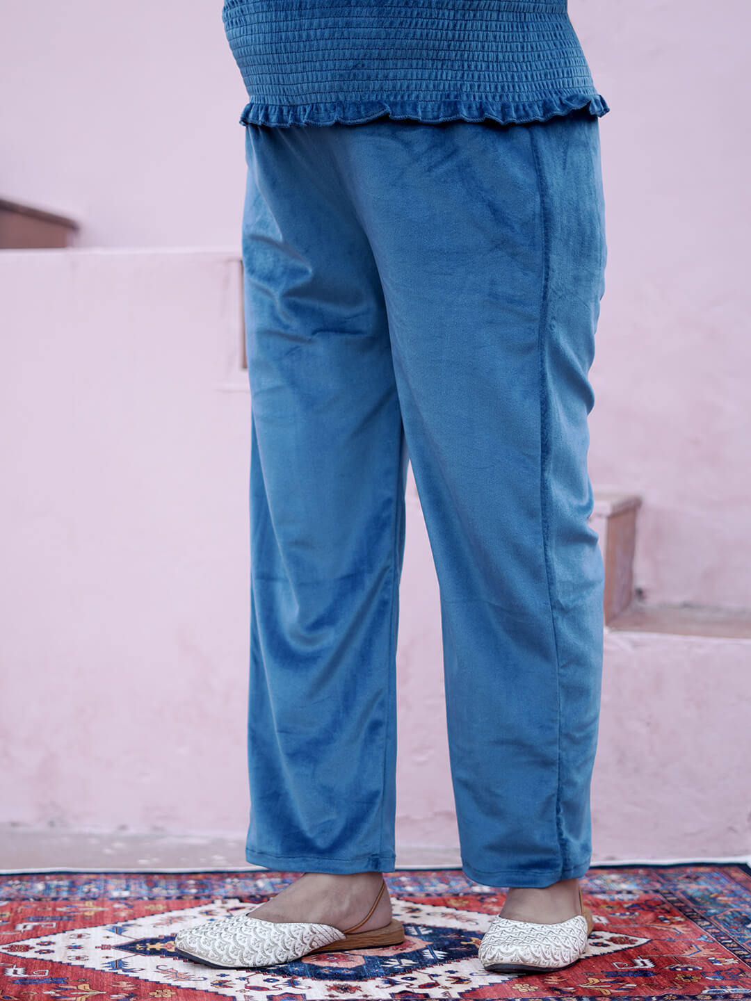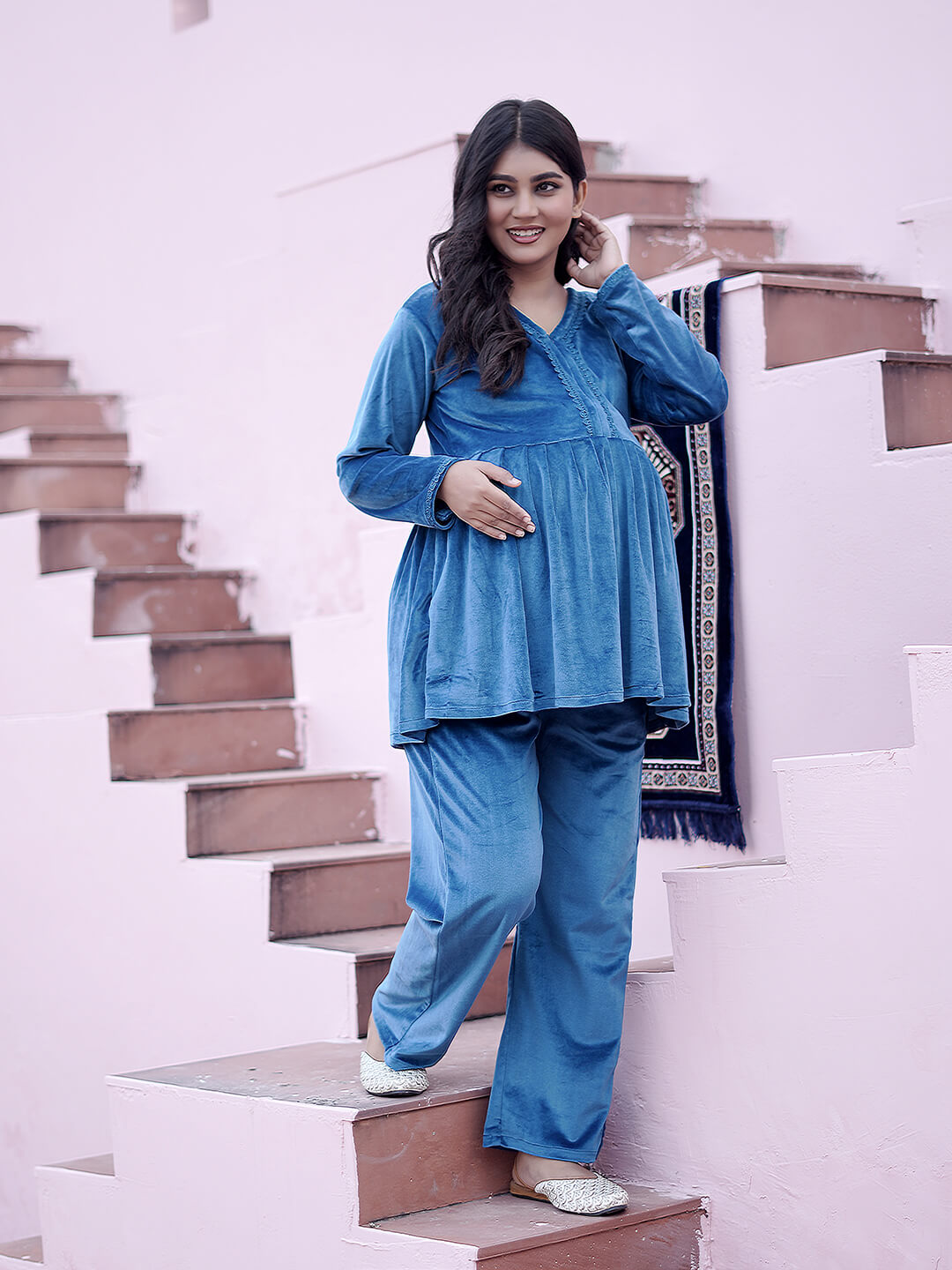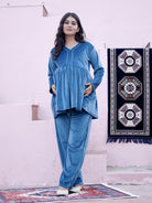 Teal Blue Velvet Maternity Feeding Night Suit