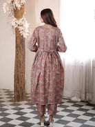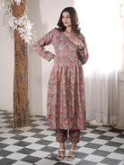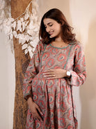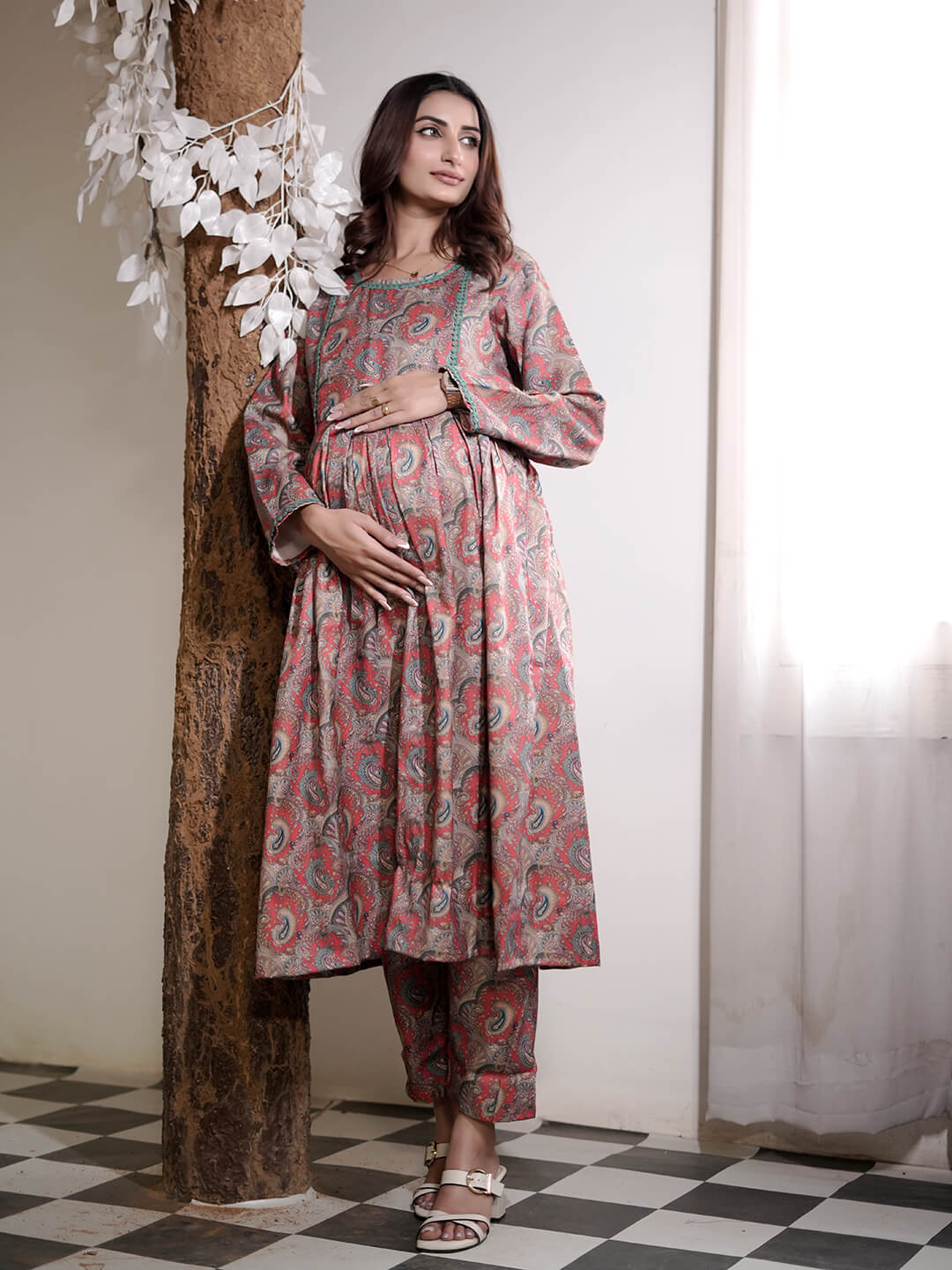 Peach Woolen Digital Printed Maternity Feeding Flared Kurta Set