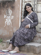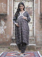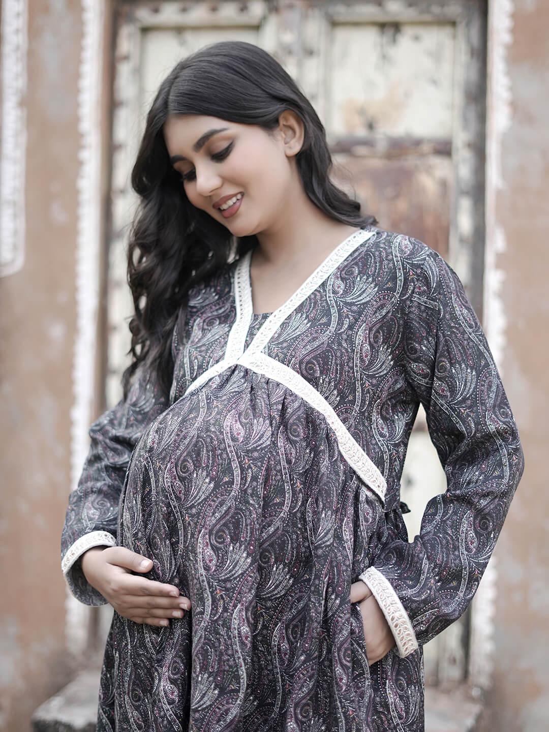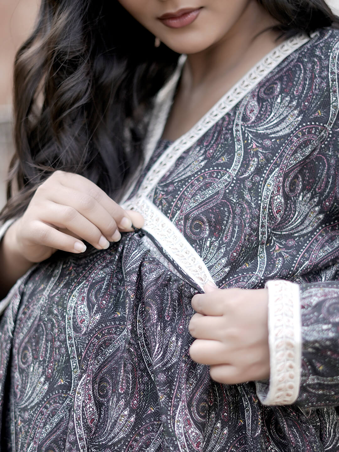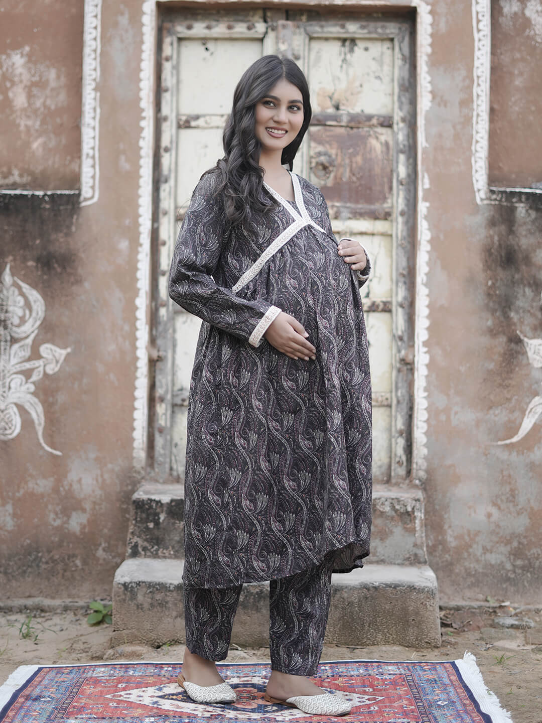 Black Woolen Digital Printed Maternity Feeding Flared Kurta Set