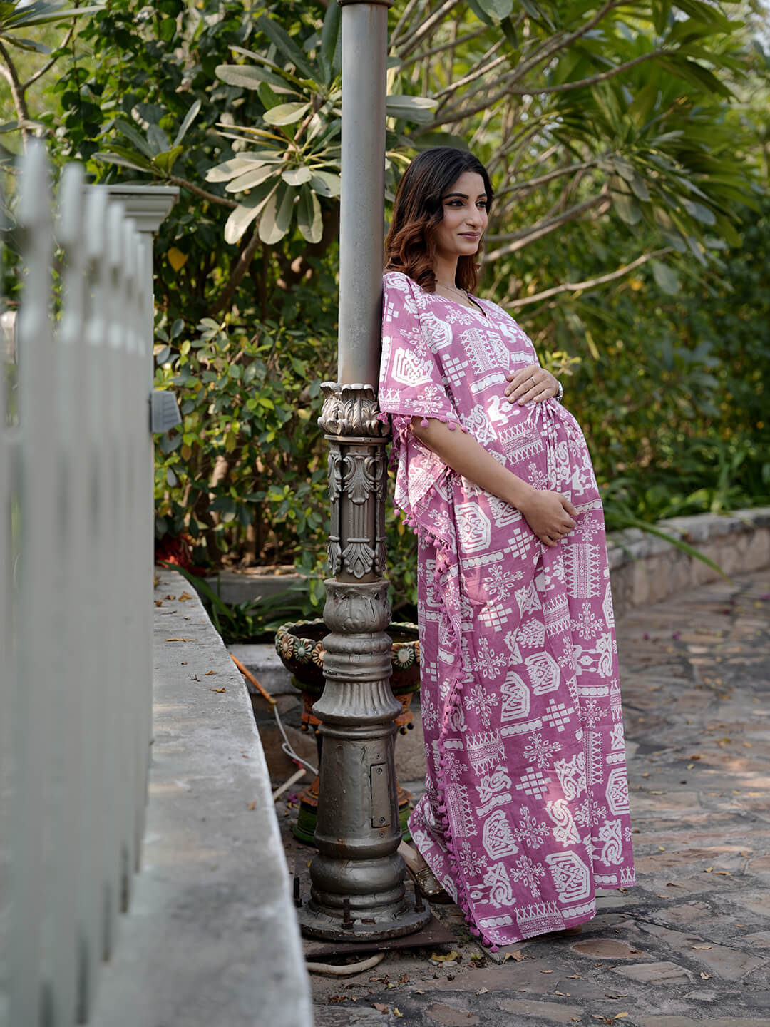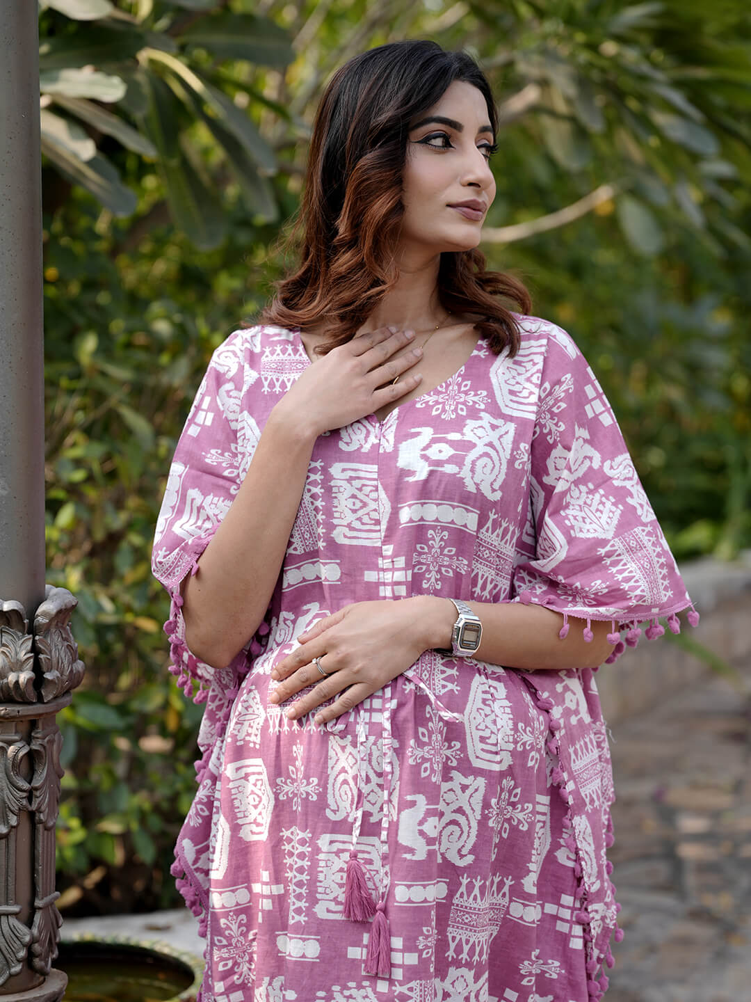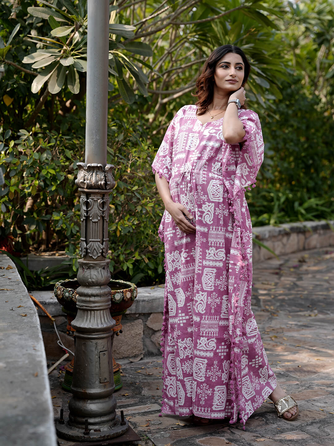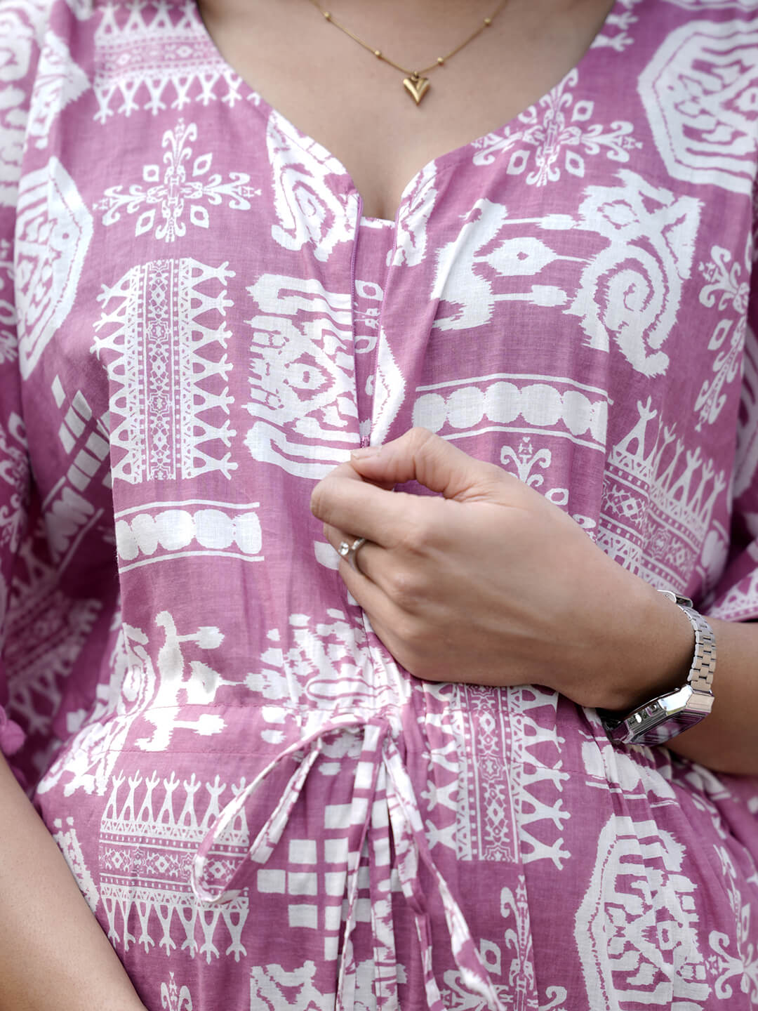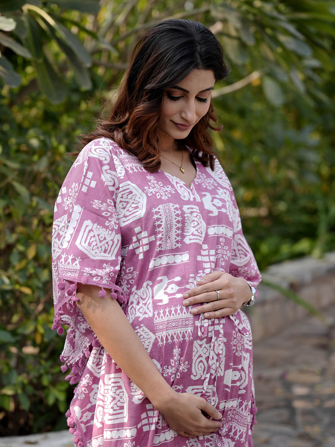 Mauve Ethnic Print Maternity & Feeding Kaftan Dress with Concealed Zipper