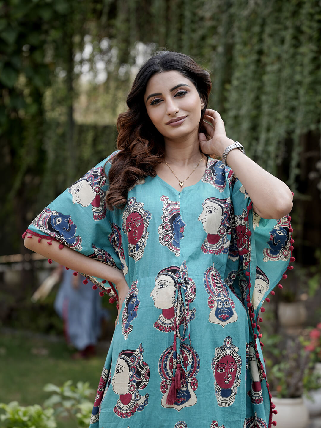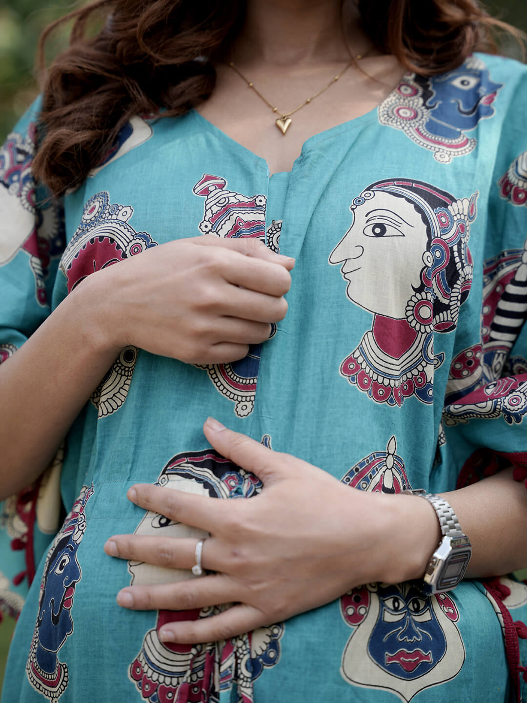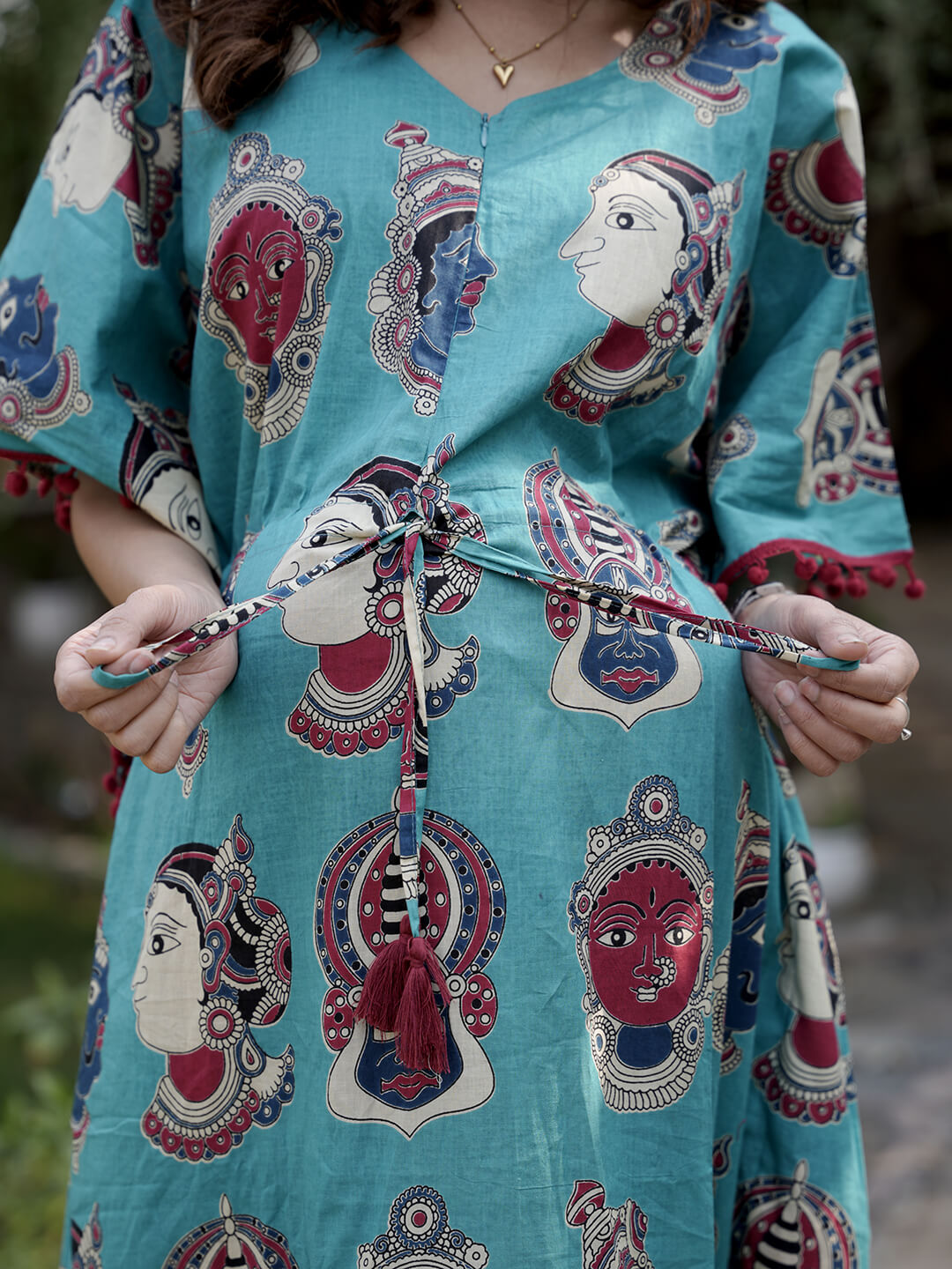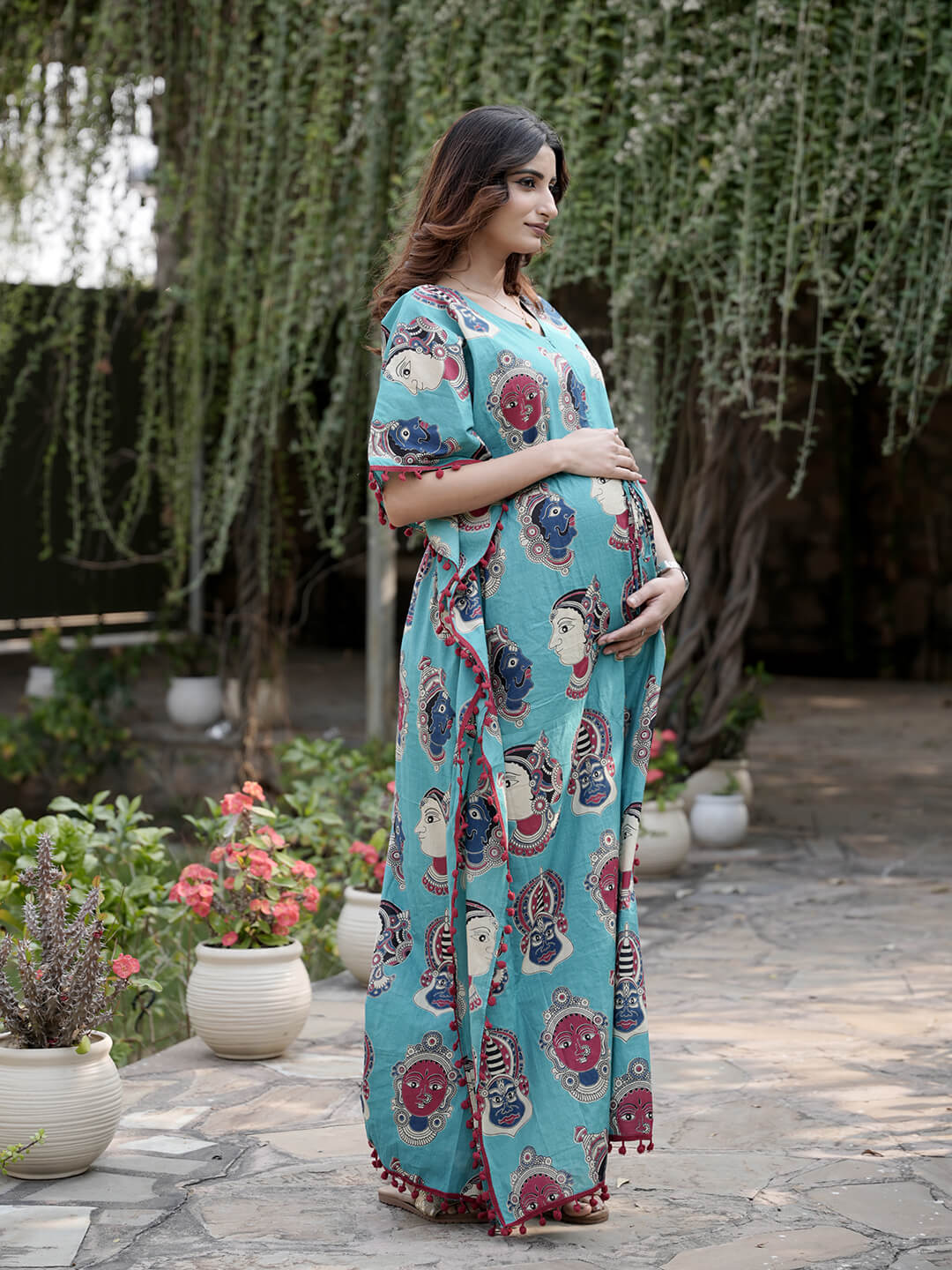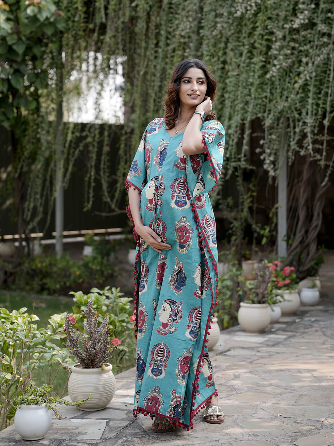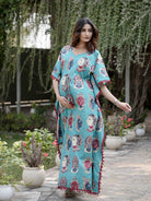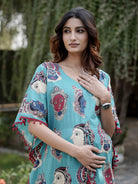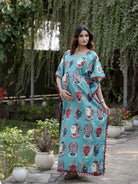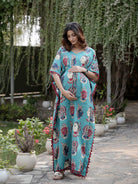 Turquoise Multi Ethnic Print Feeding-Friendly Maternity Kaftan Dress