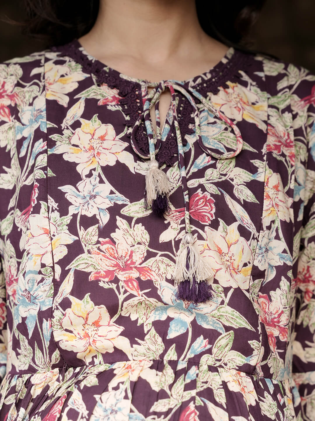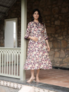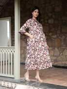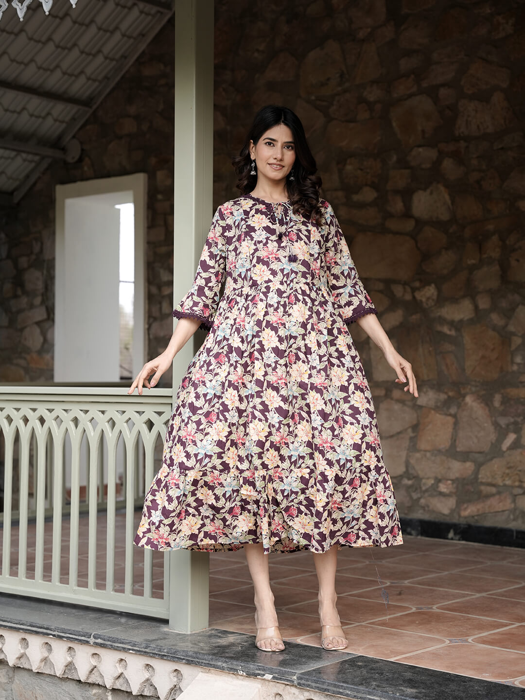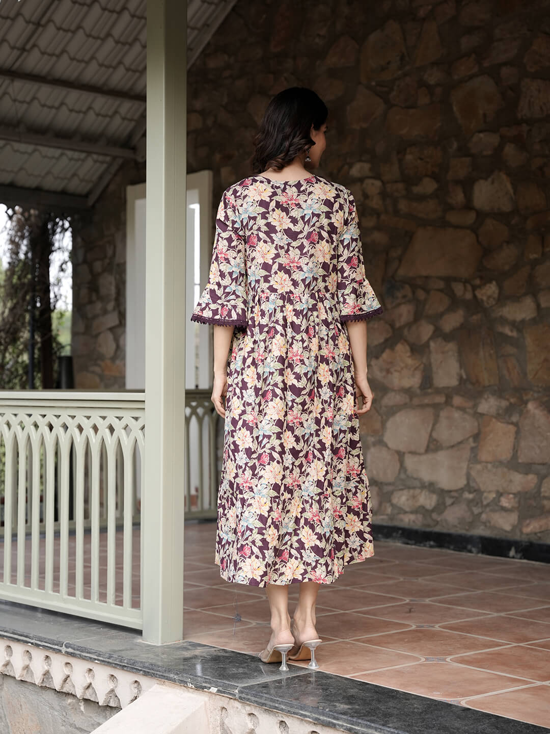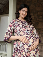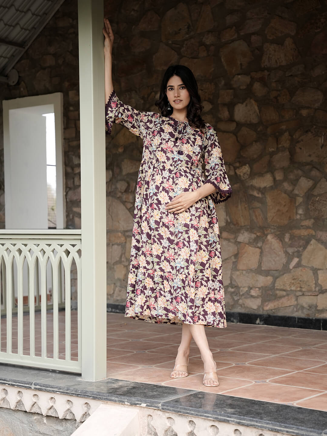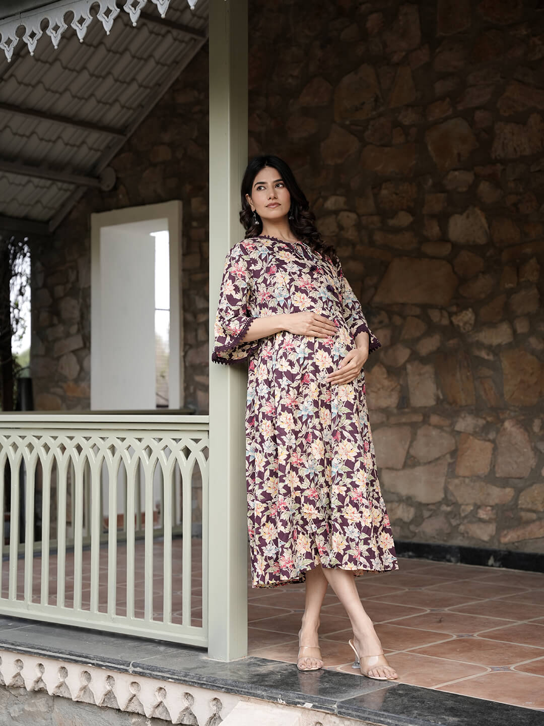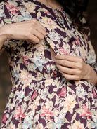 Burgundy Floral Printed Maternity & Nursing Midi Dress with Concealed Feeding Zippers
