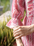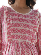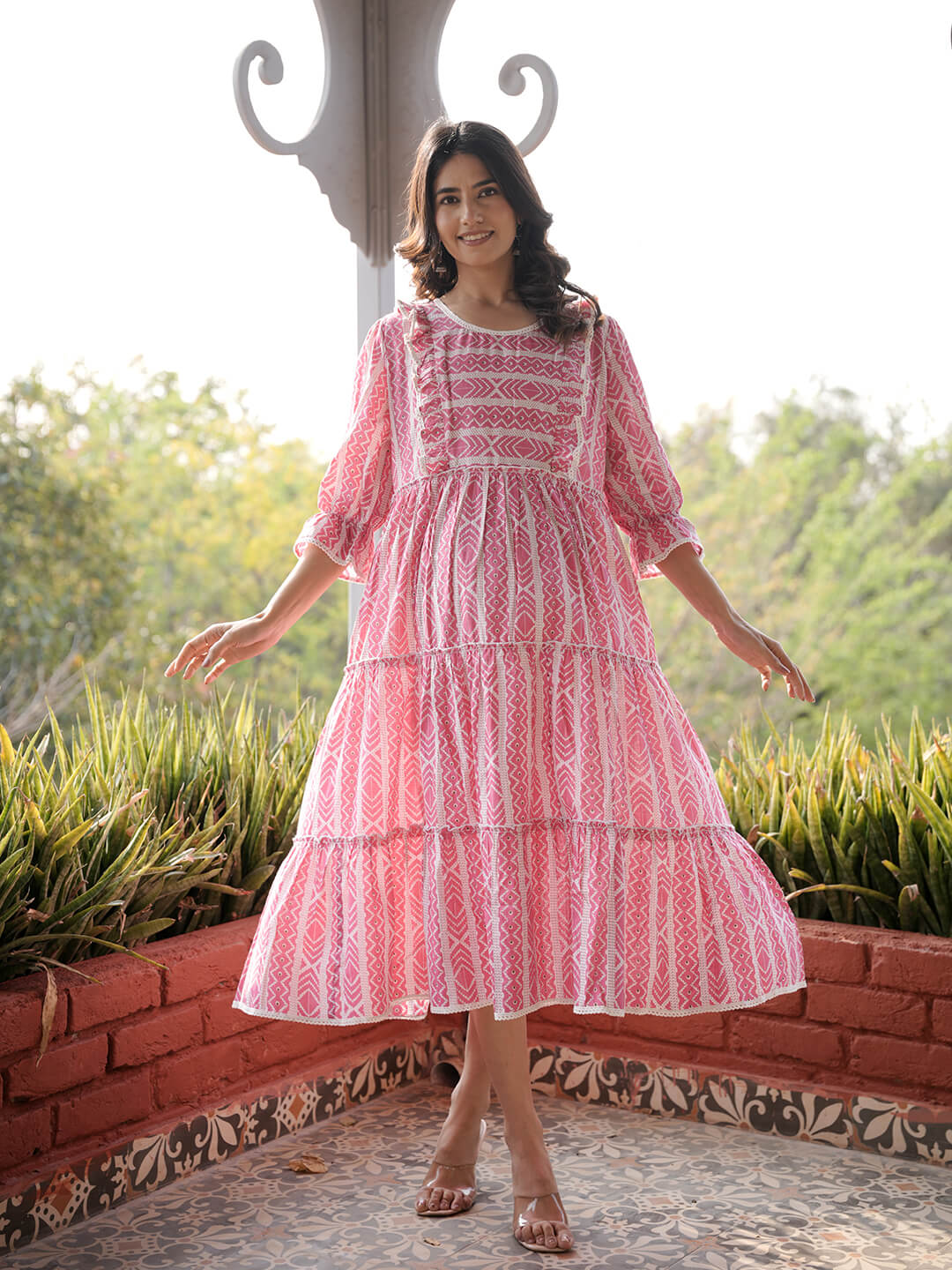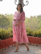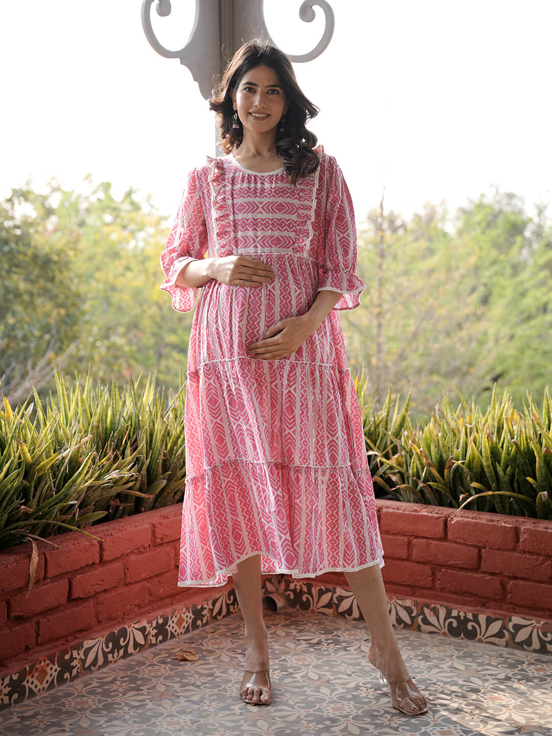 Pink Geometric Printed Maternity & Nursing Midi Dress with Concealed Feeding Zippers