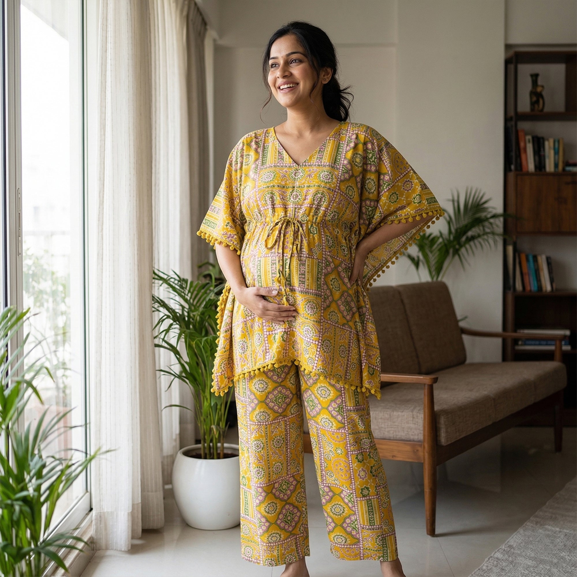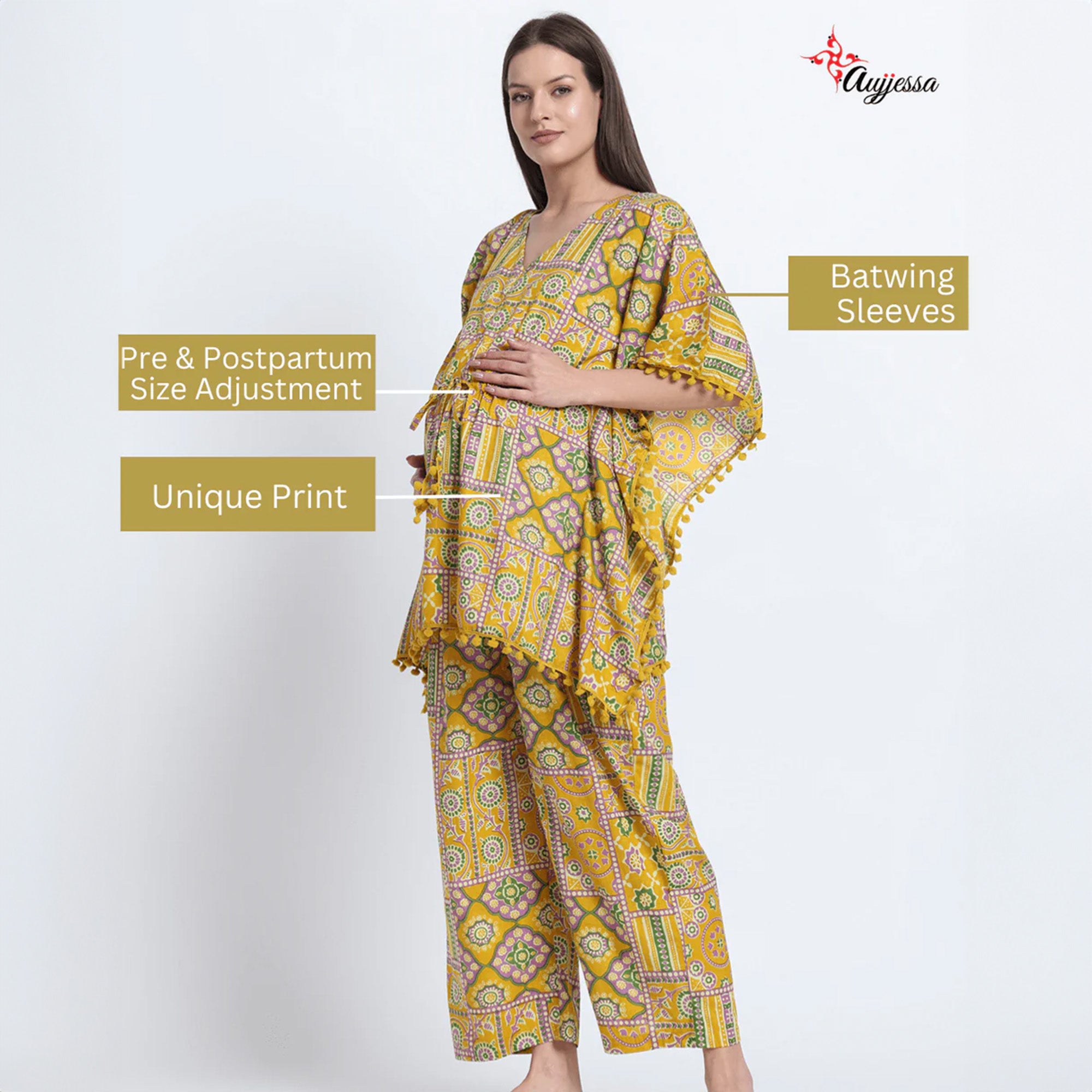 Mustard Printed Cotton Maternity Feeding Kaftan Night Suit
