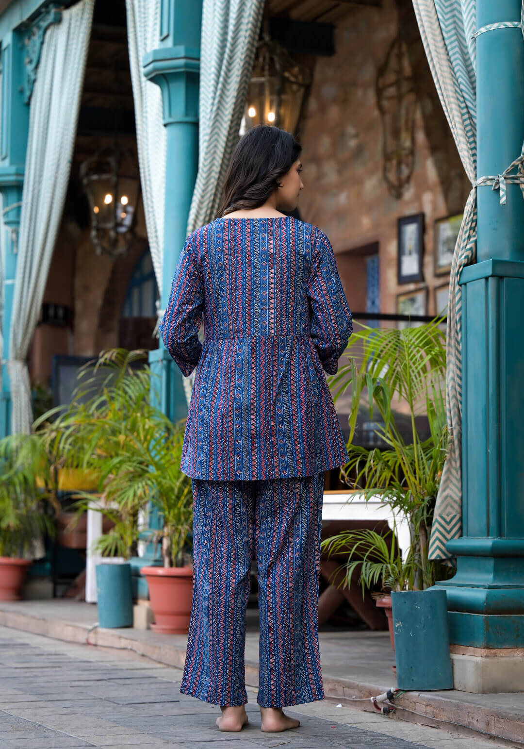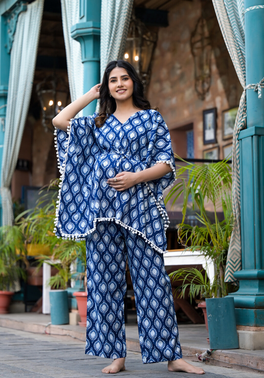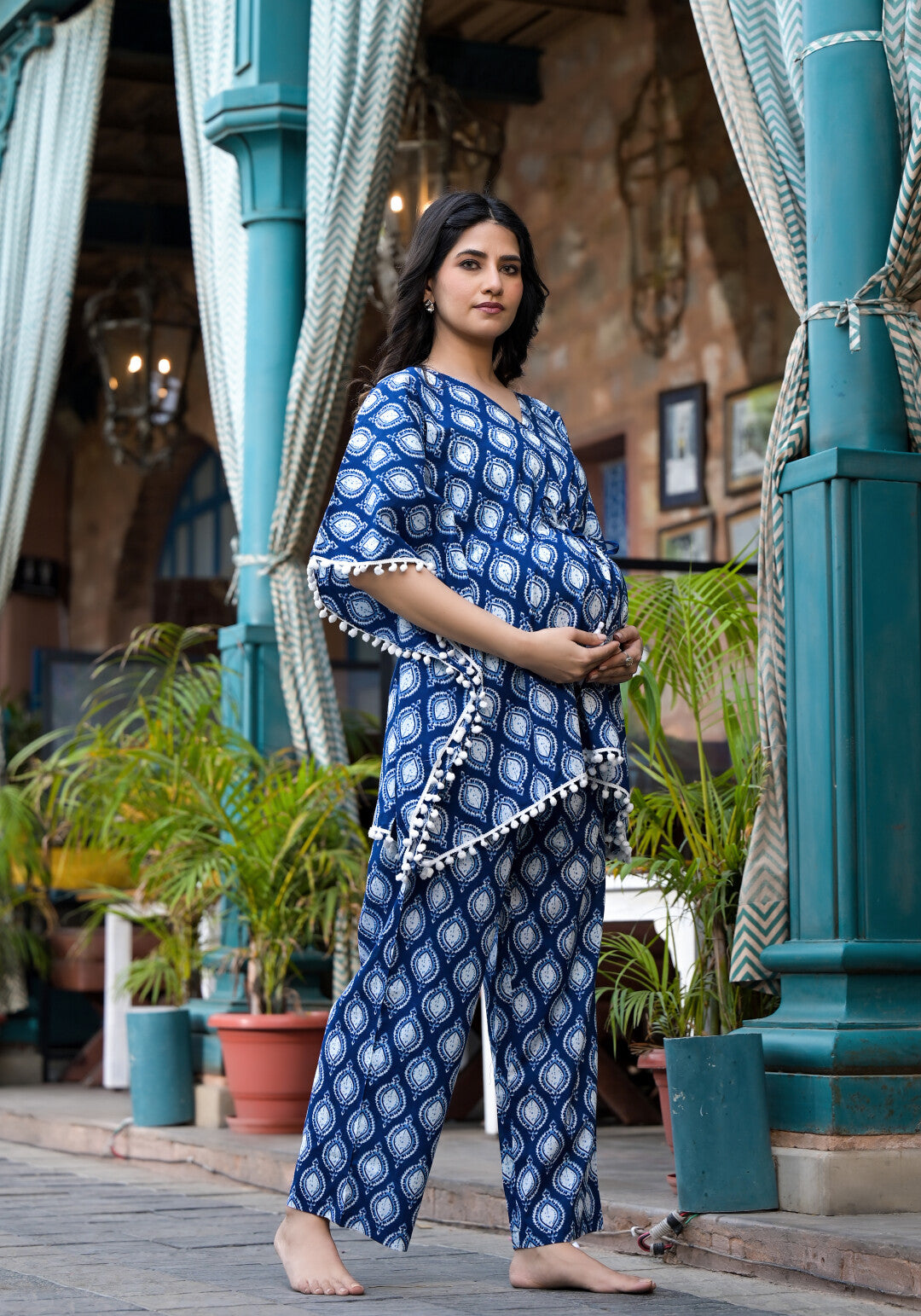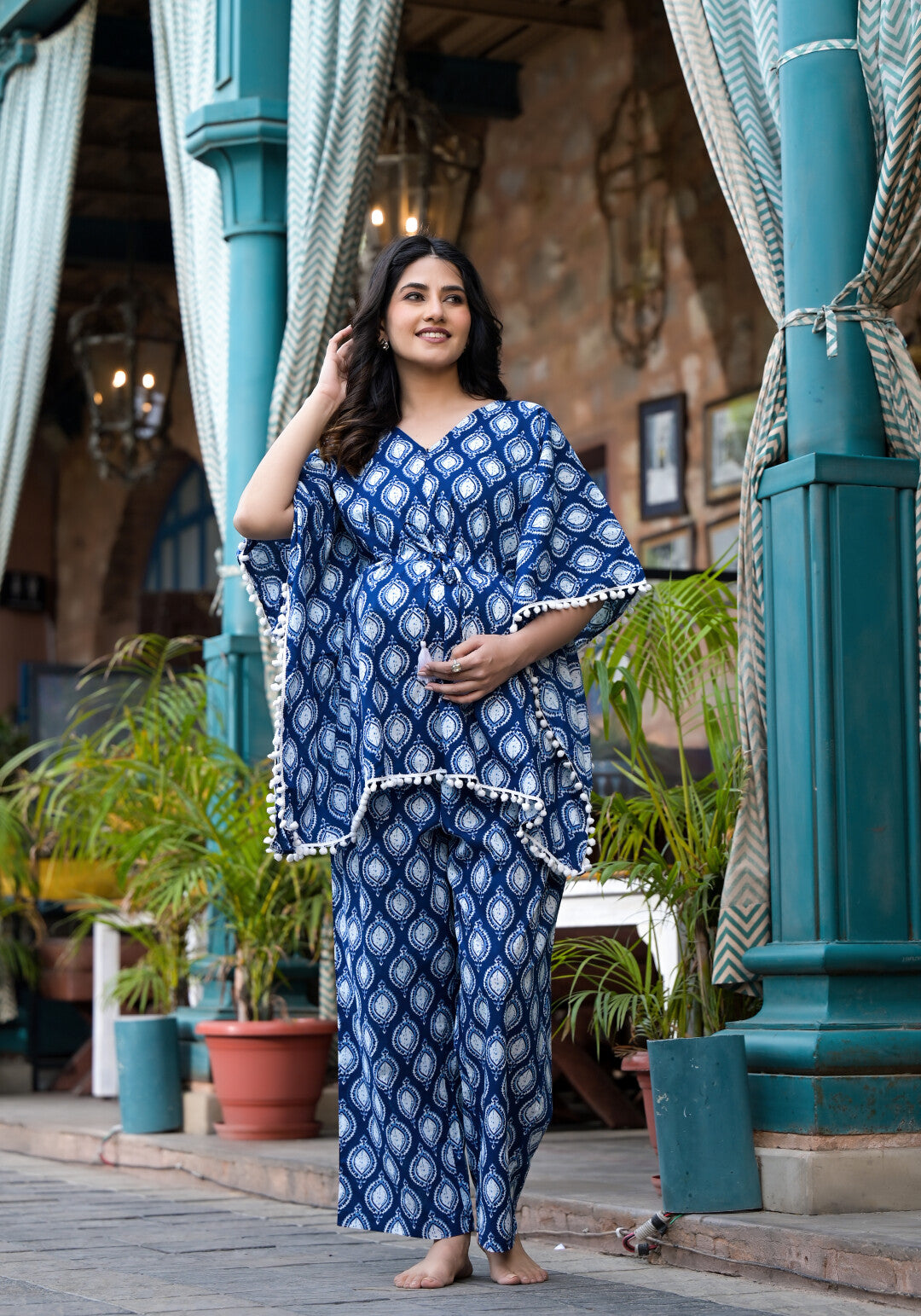 Indigo Printed Maternity Feeding Kaftan Night Suit