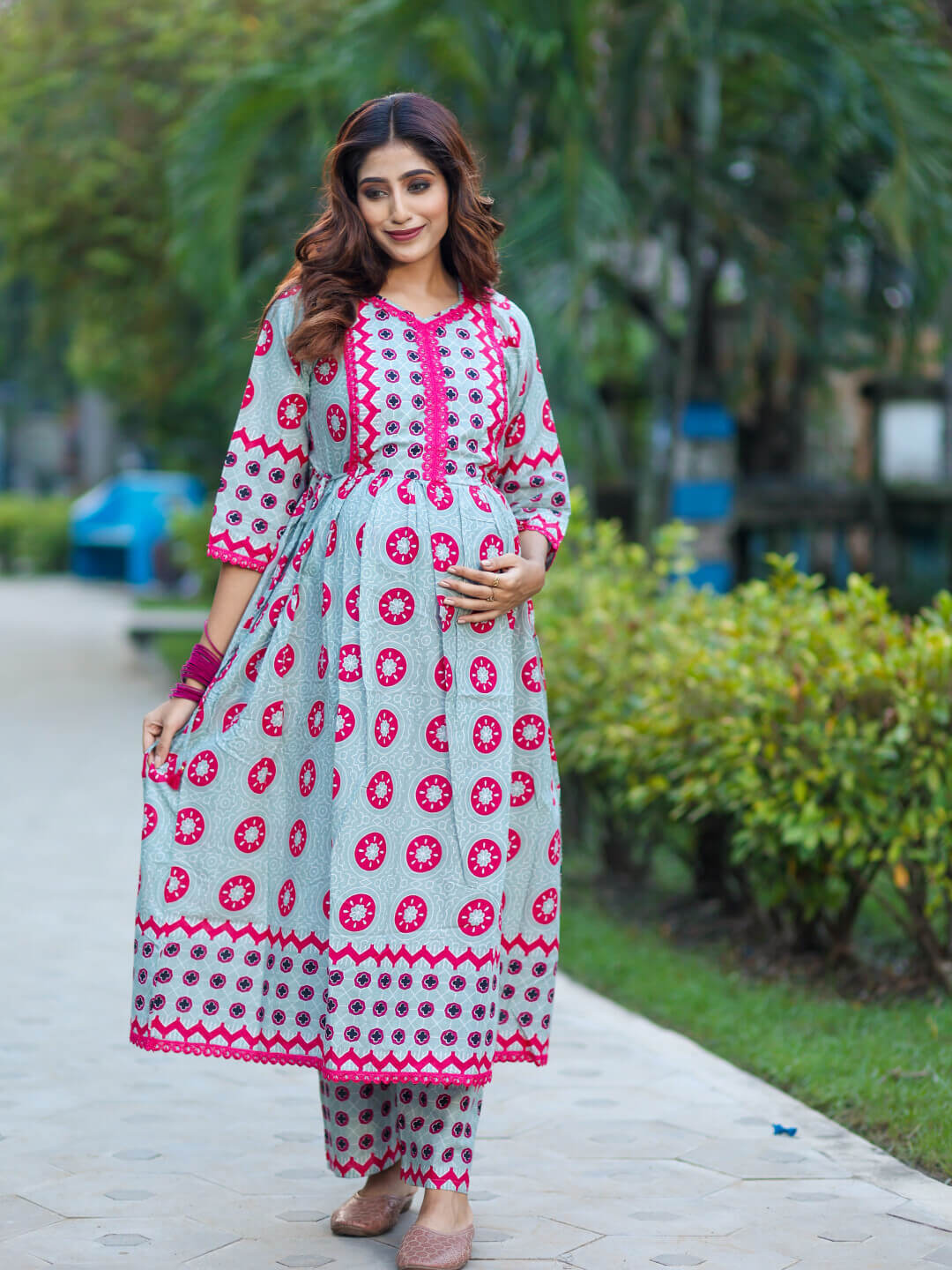 Grey Fuchsia Cotton Printed Maternity Feeding Flared Kurta Set
