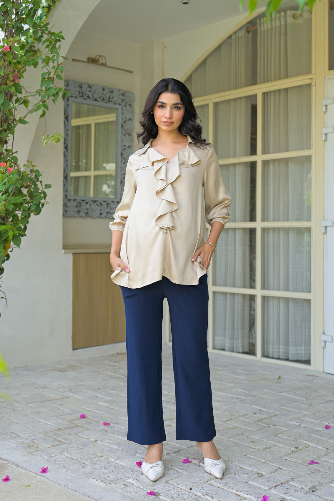 Beige Ruffled Maternity Feeding Top