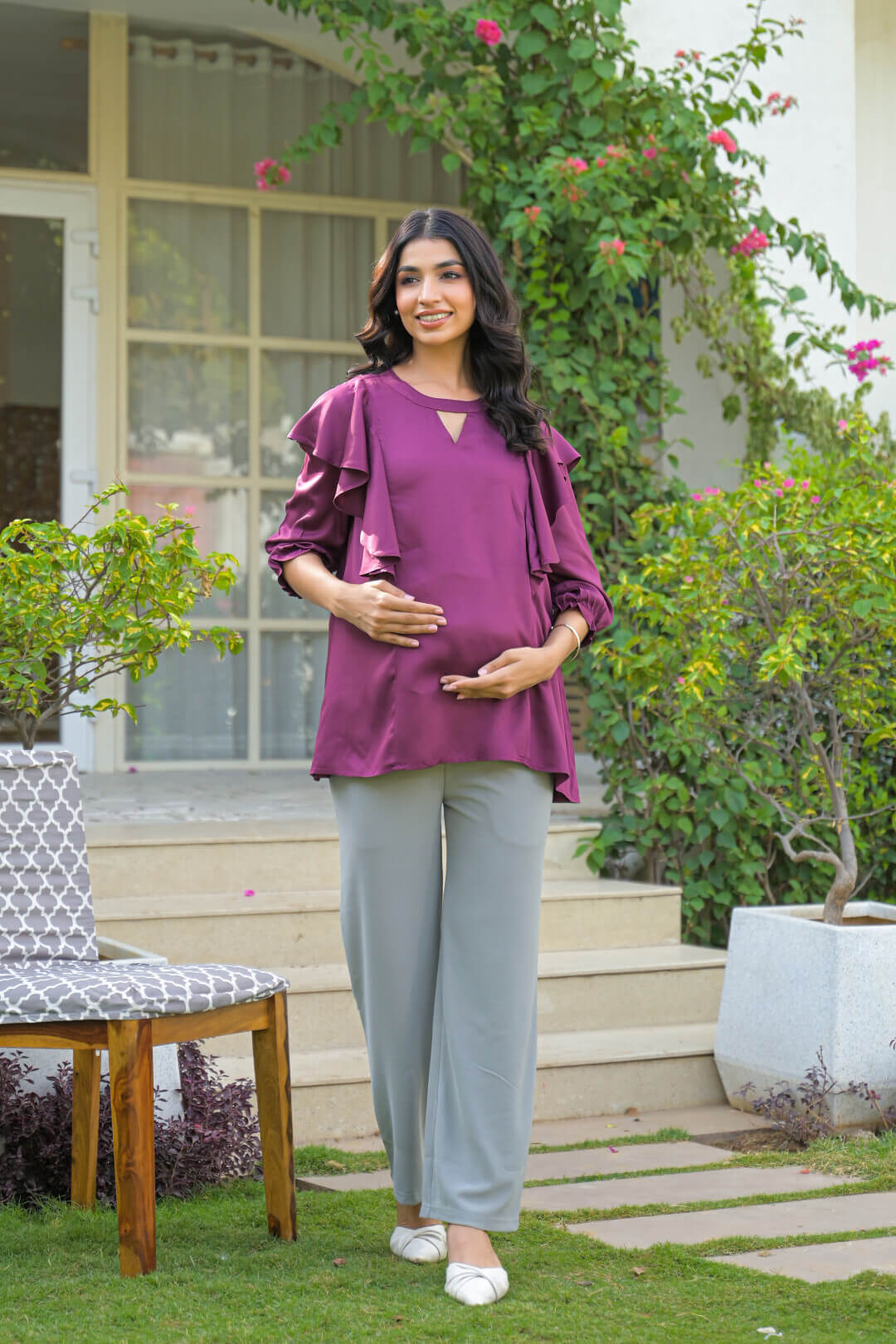 Plum Jewell Neck Ruffled Maternity Feeding Top