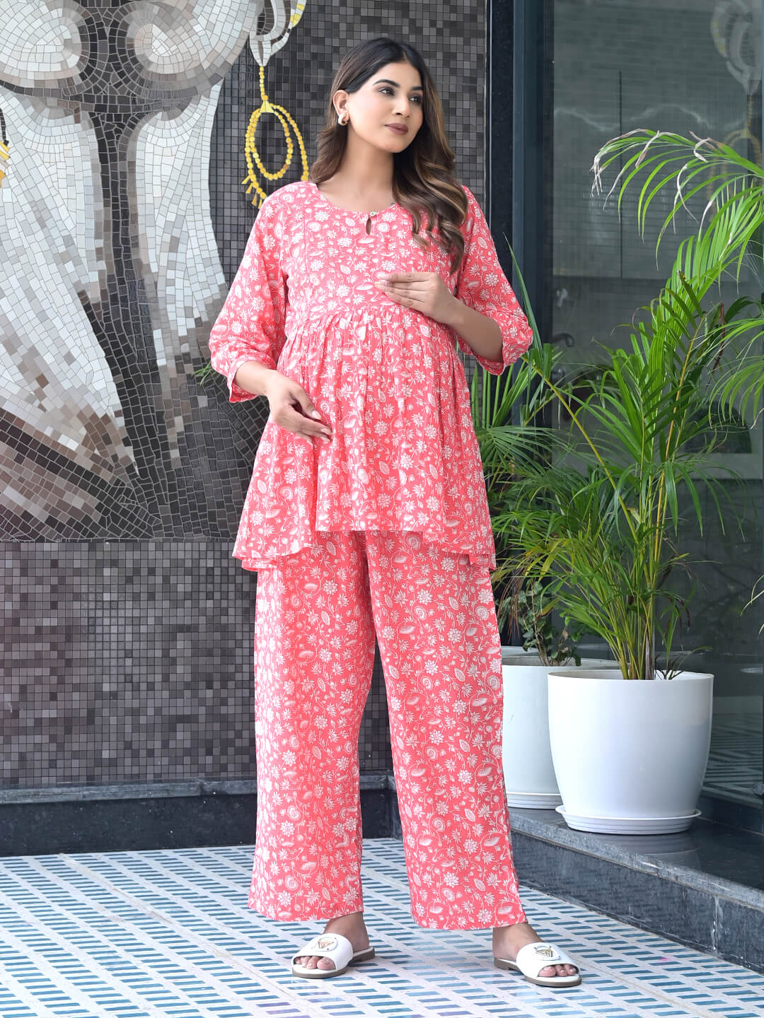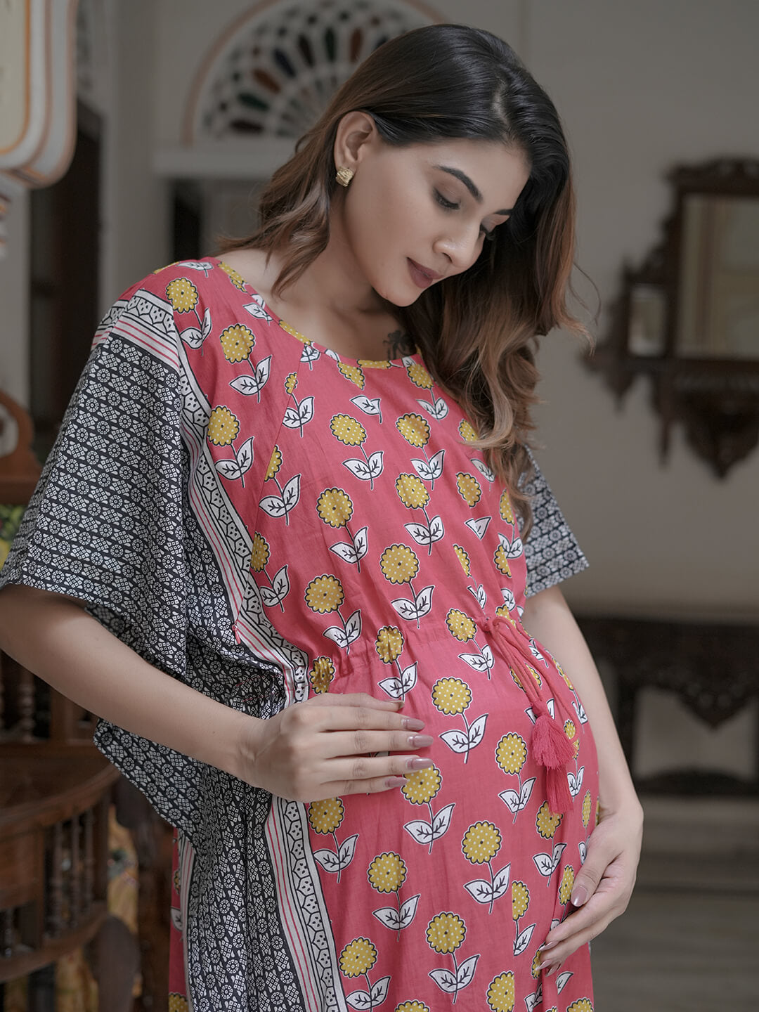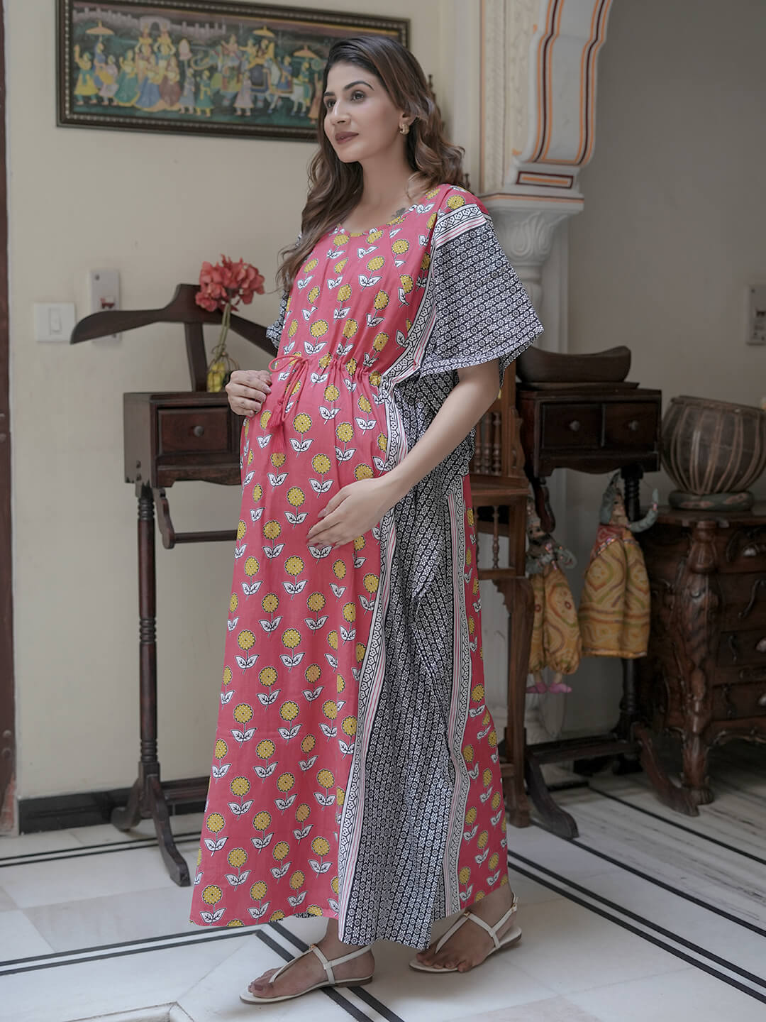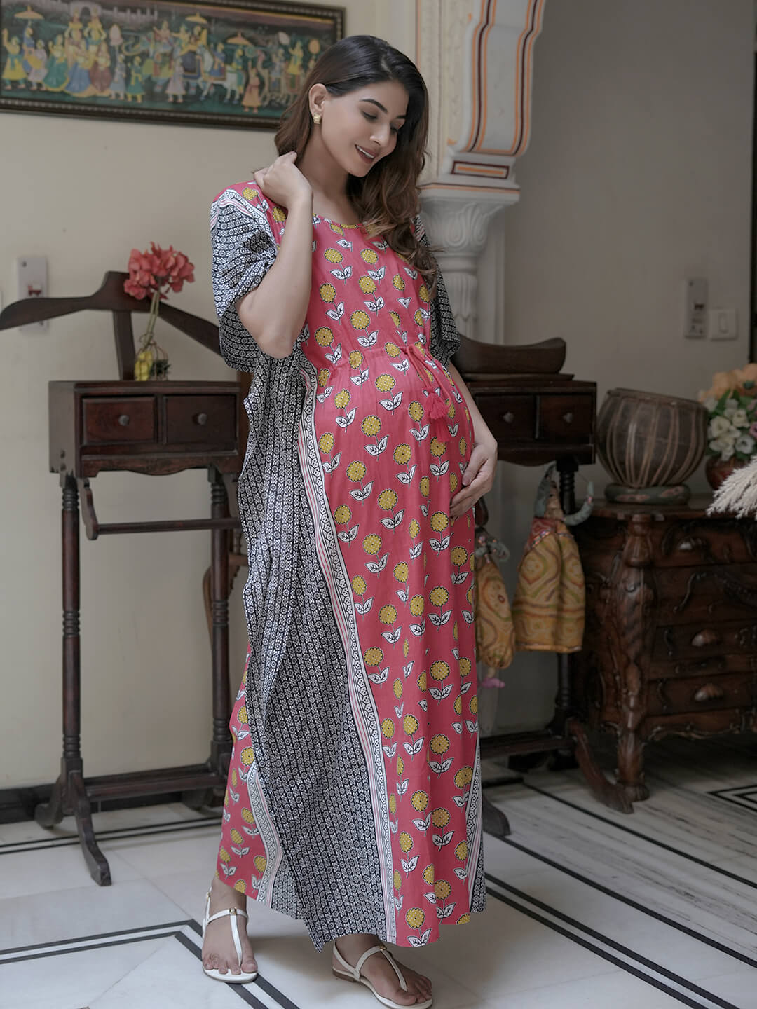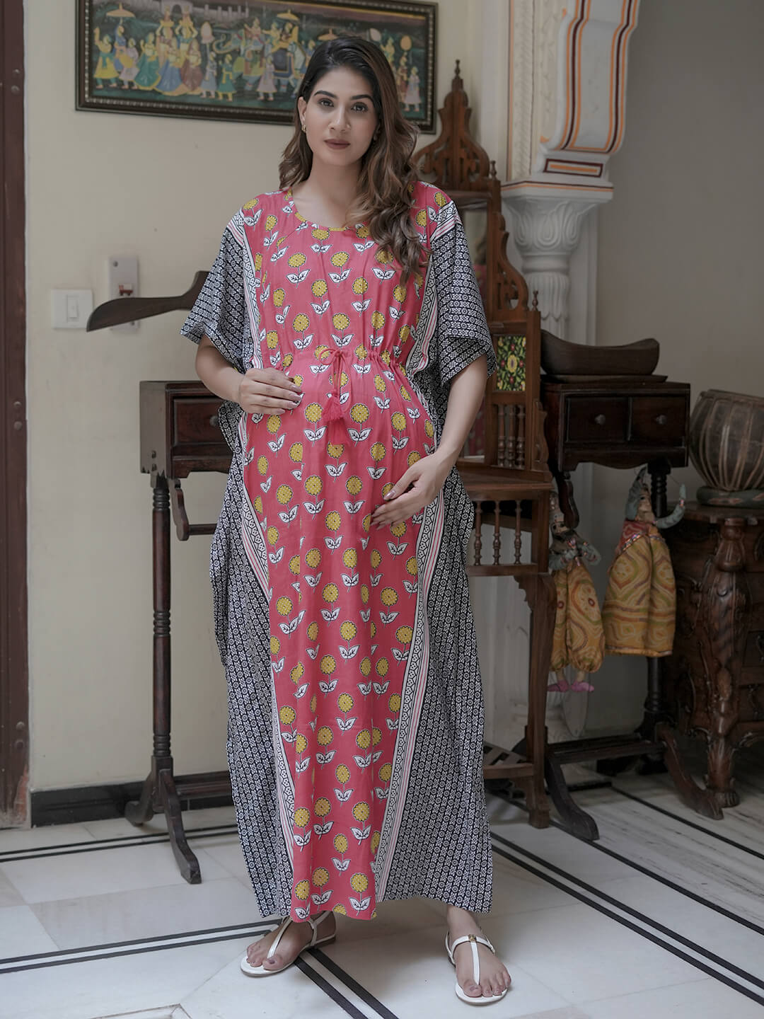 Pink Printed Cotton Maternity Feeding Kaftan Night Suit