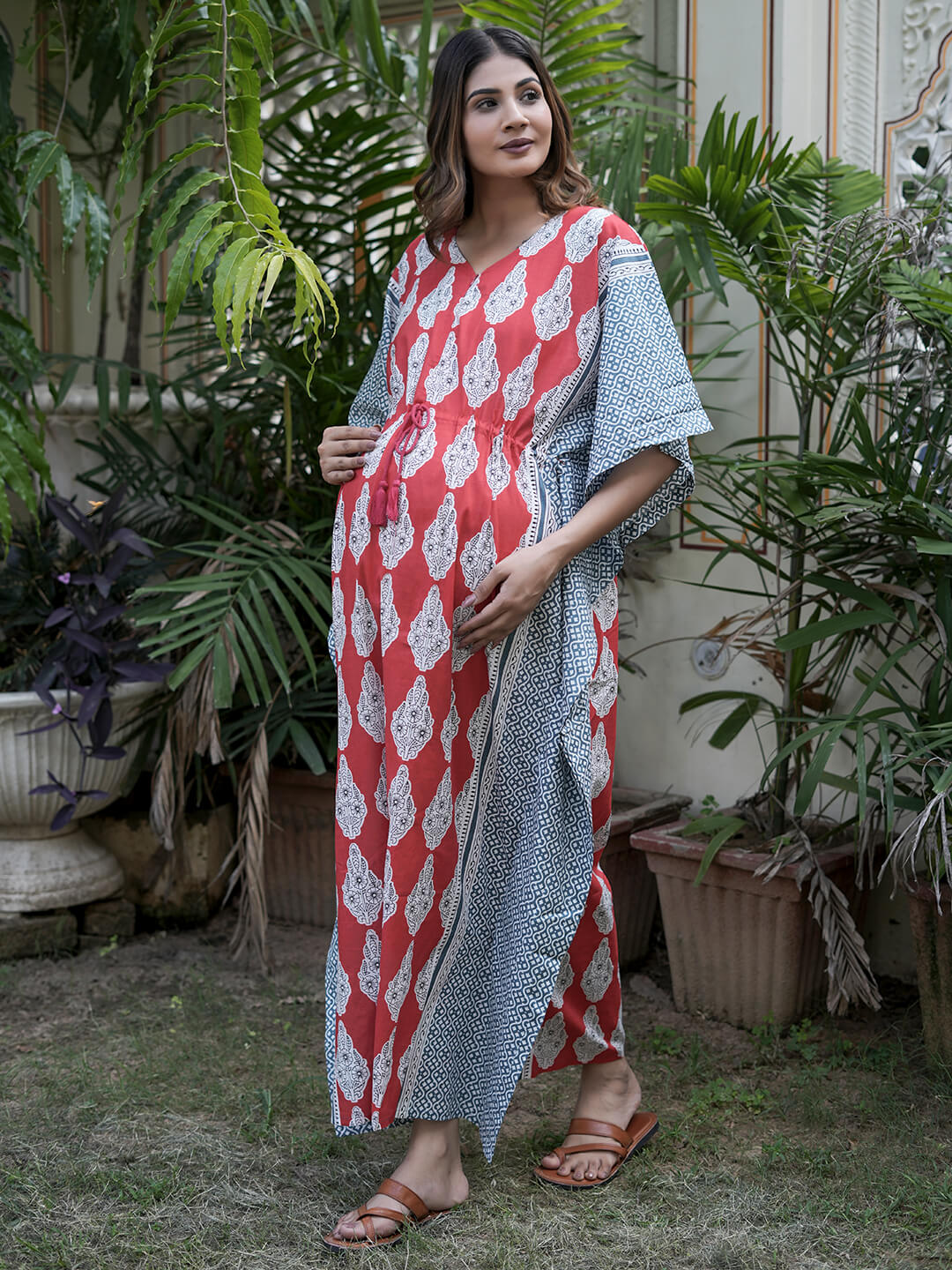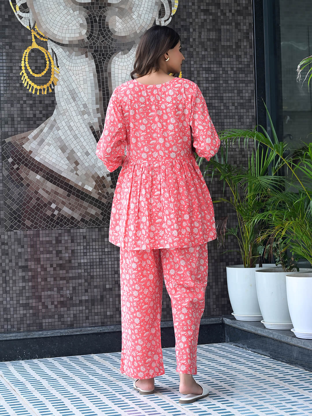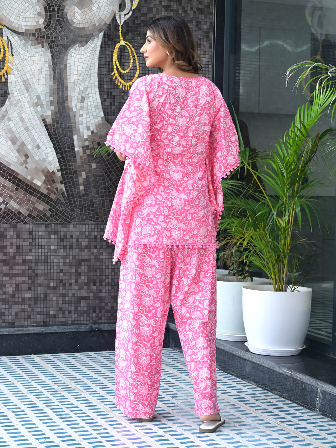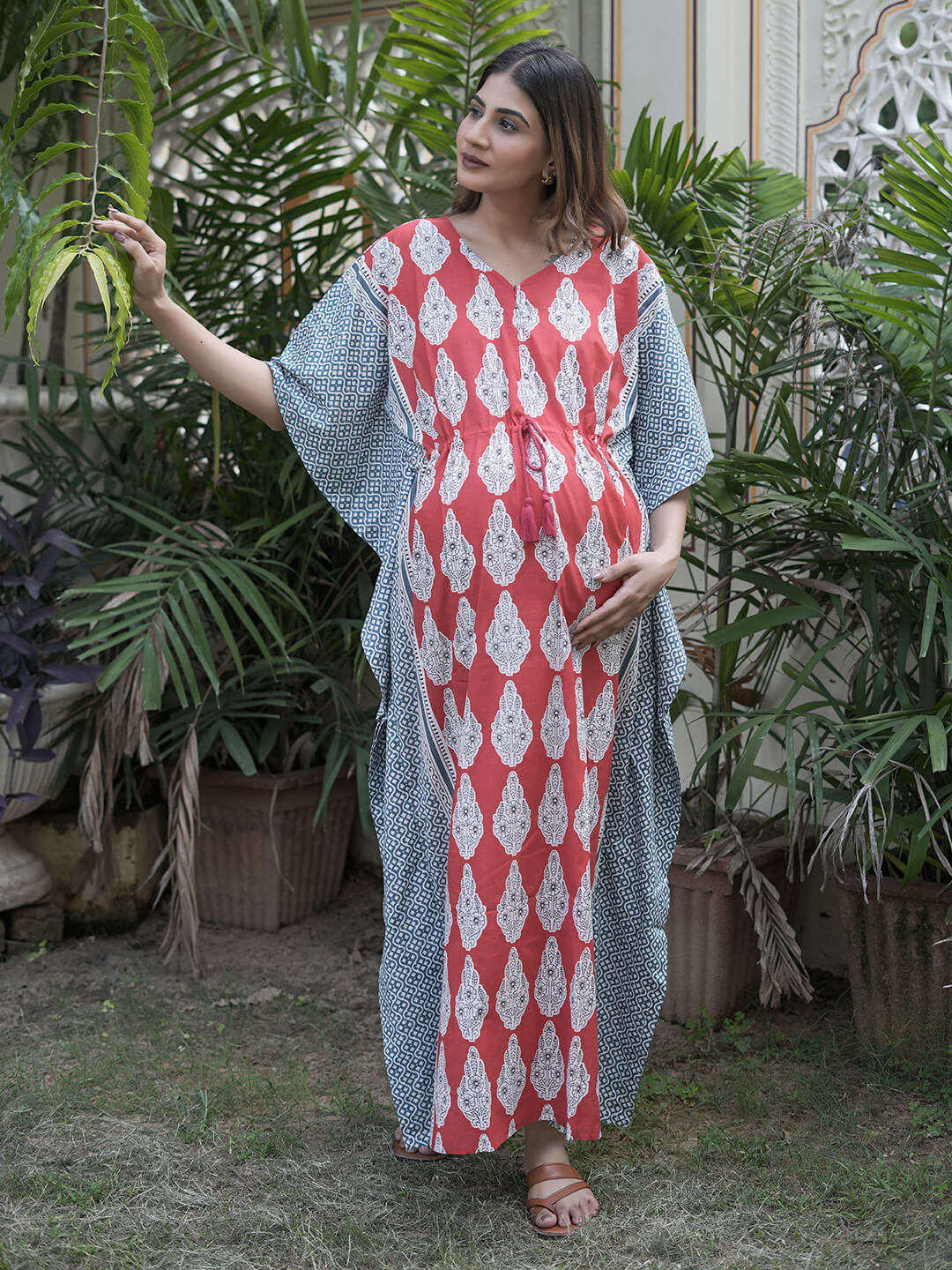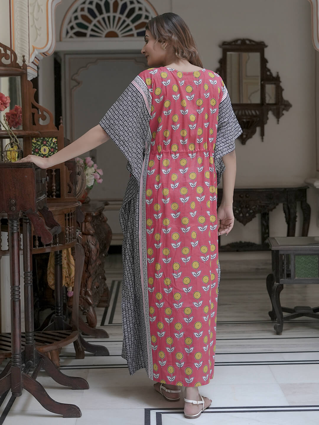 Pink Printed Cotton Maternity Feeding Kaftan Night Suit