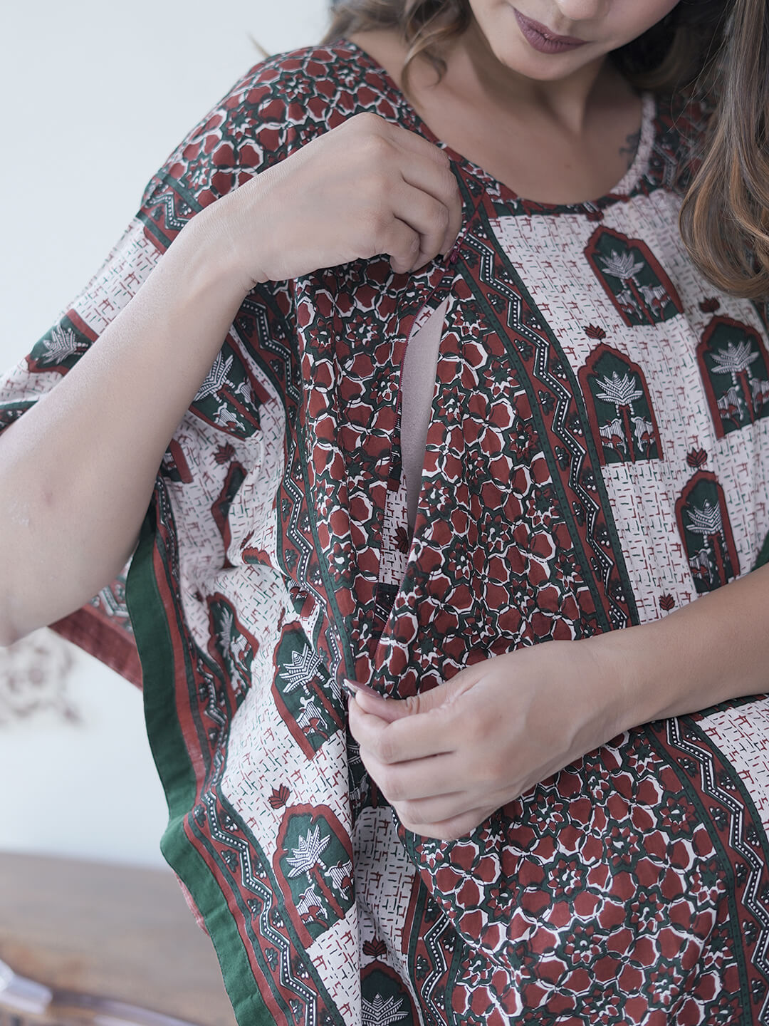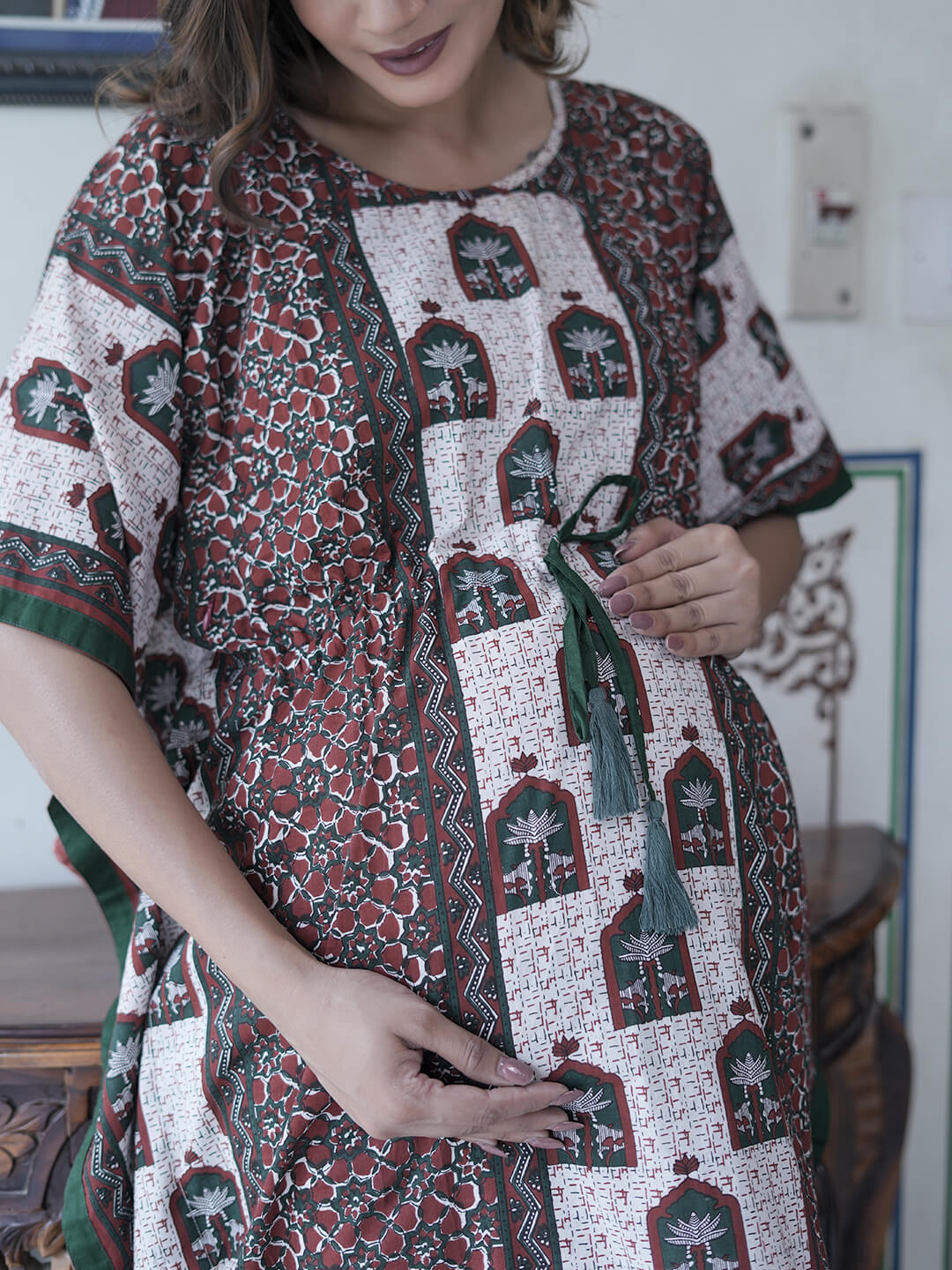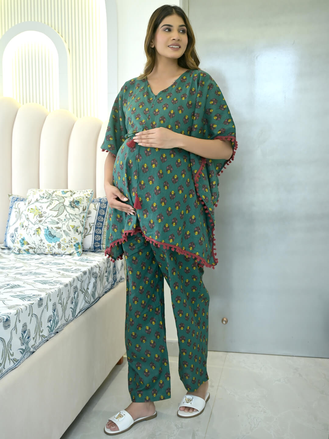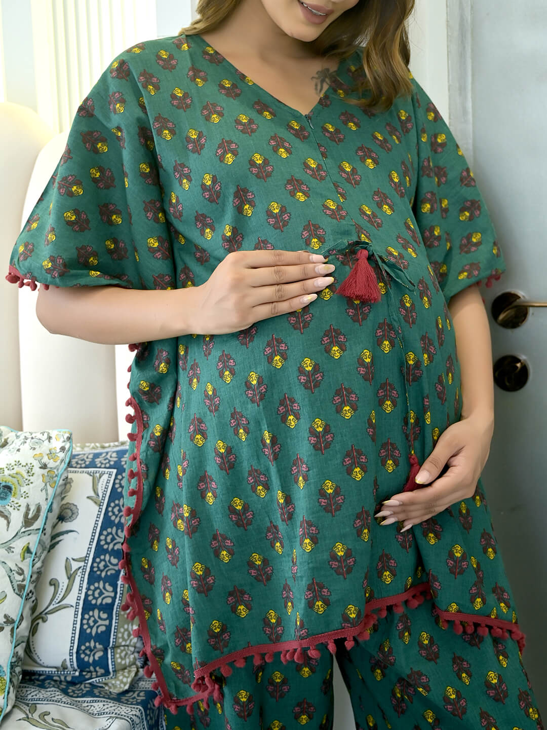 Bottle Green Printed Cotton Maternity Feeding Kaftan Night Suit
