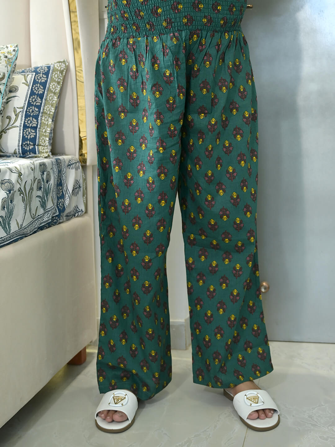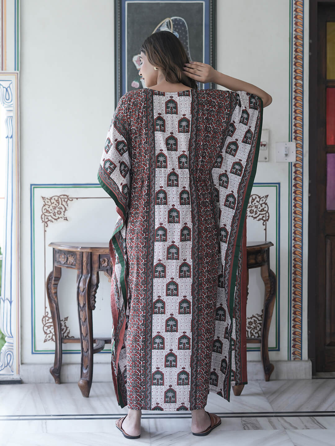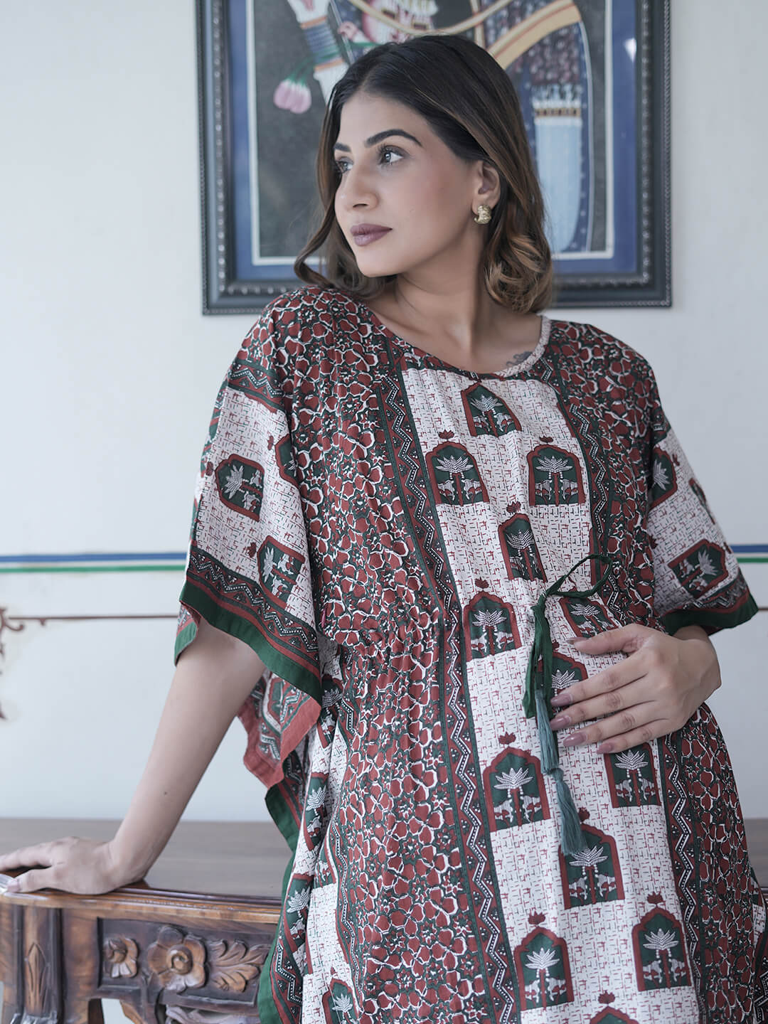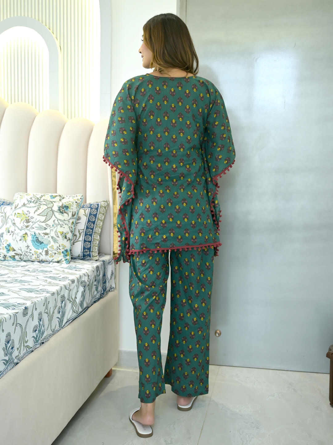 Bottle Green Printed Cotton Maternity Feeding Kaftan Night Suit