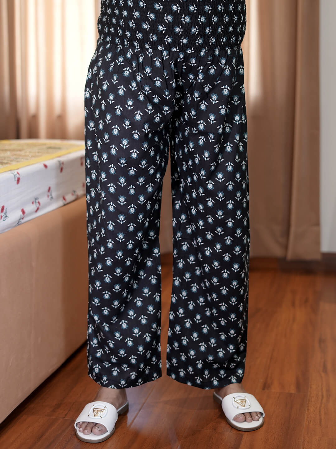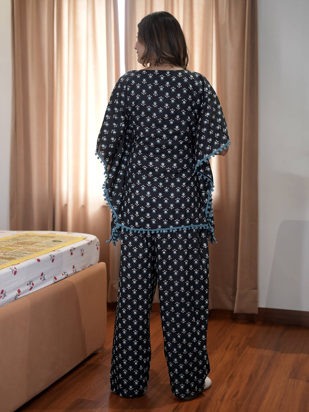 Black Printed Cotton Maternity Feeding Kaftan Night Suit