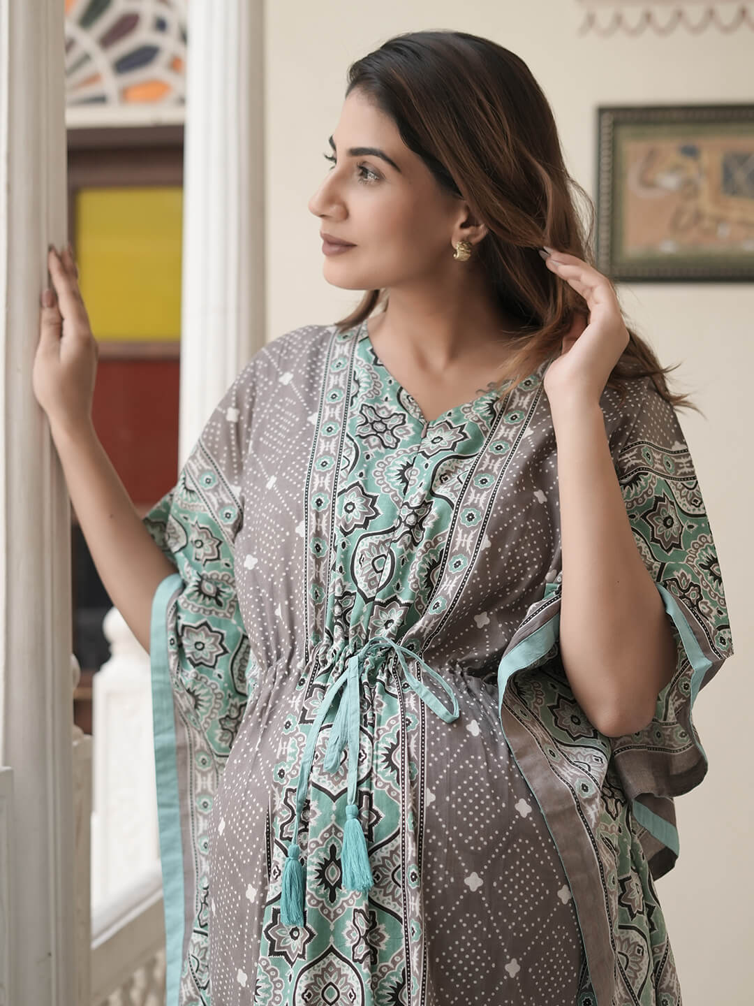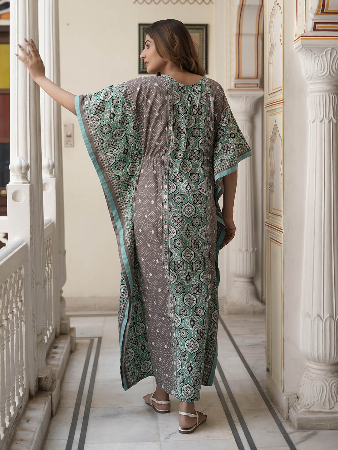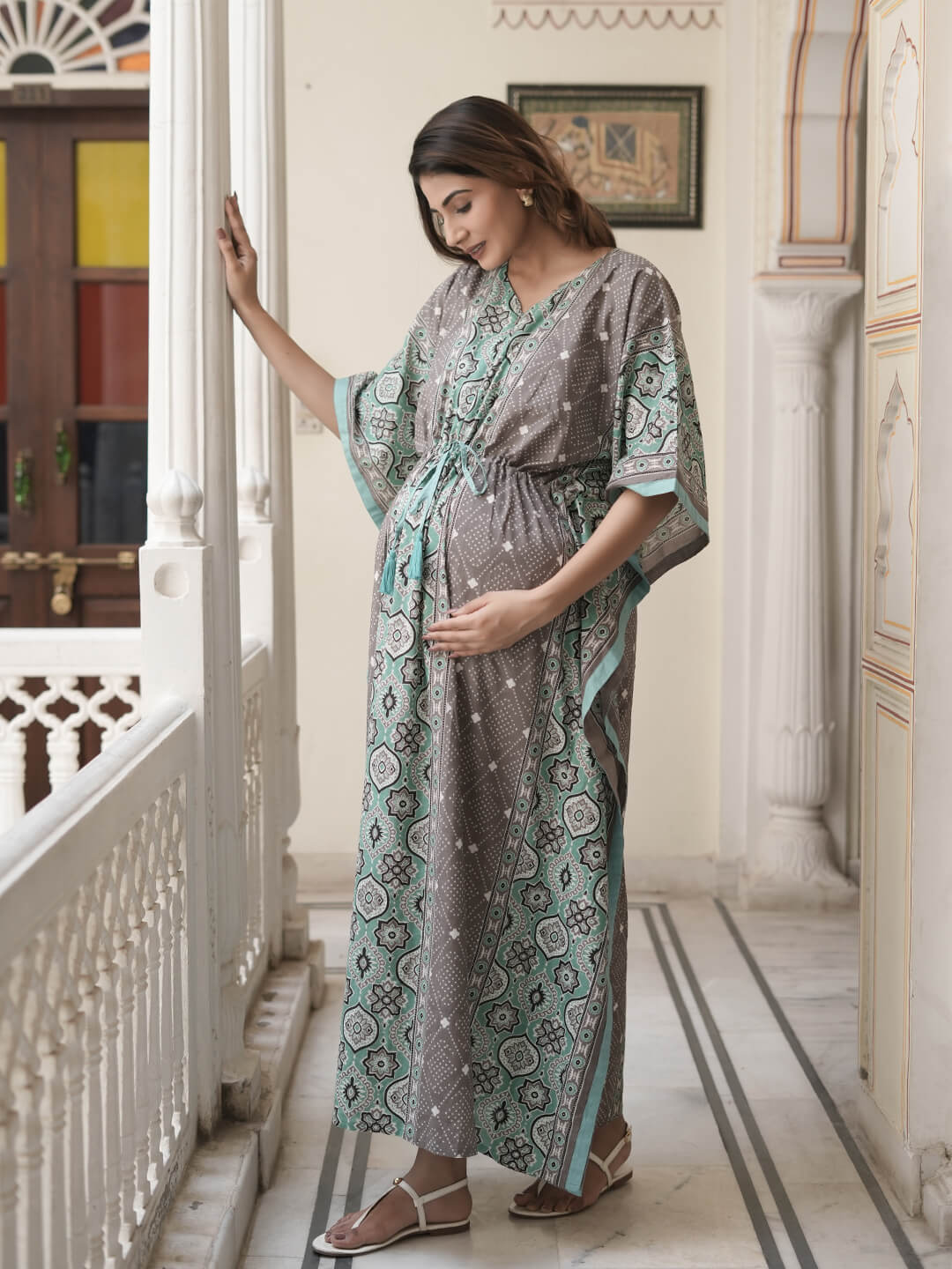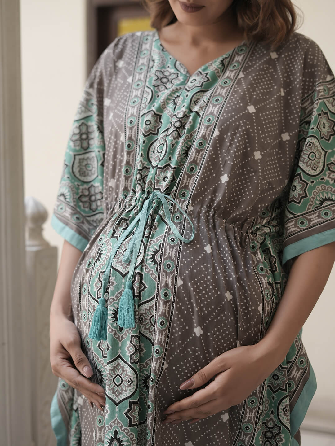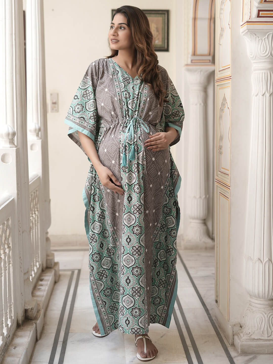 Grey Printed Cotton Maternity Feeding Kaftan Night Suit