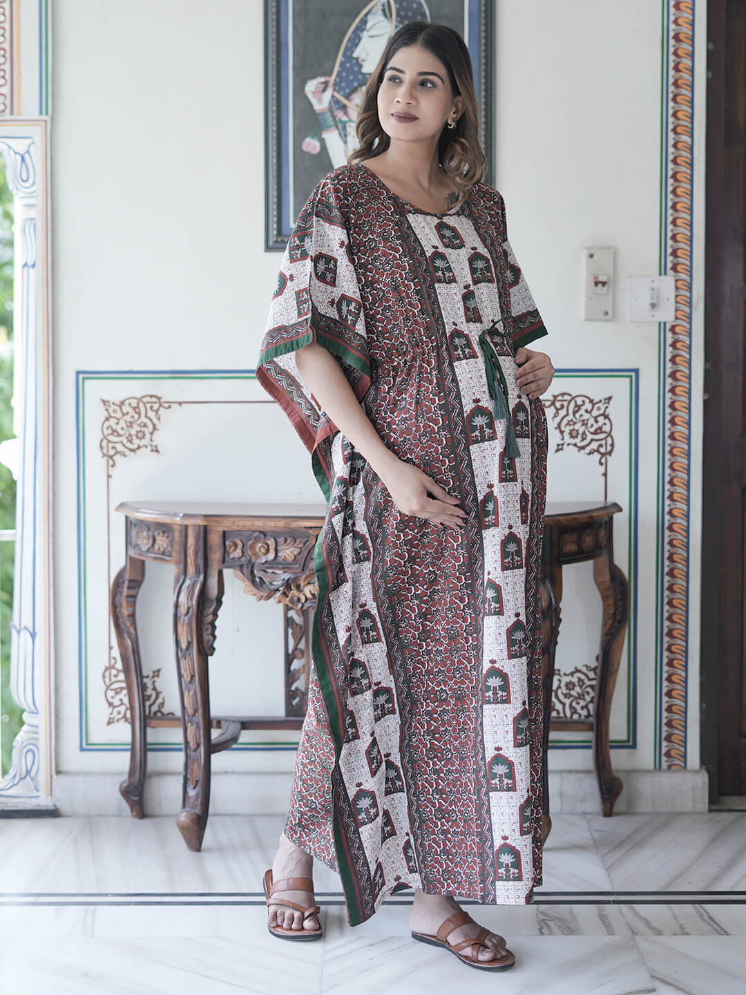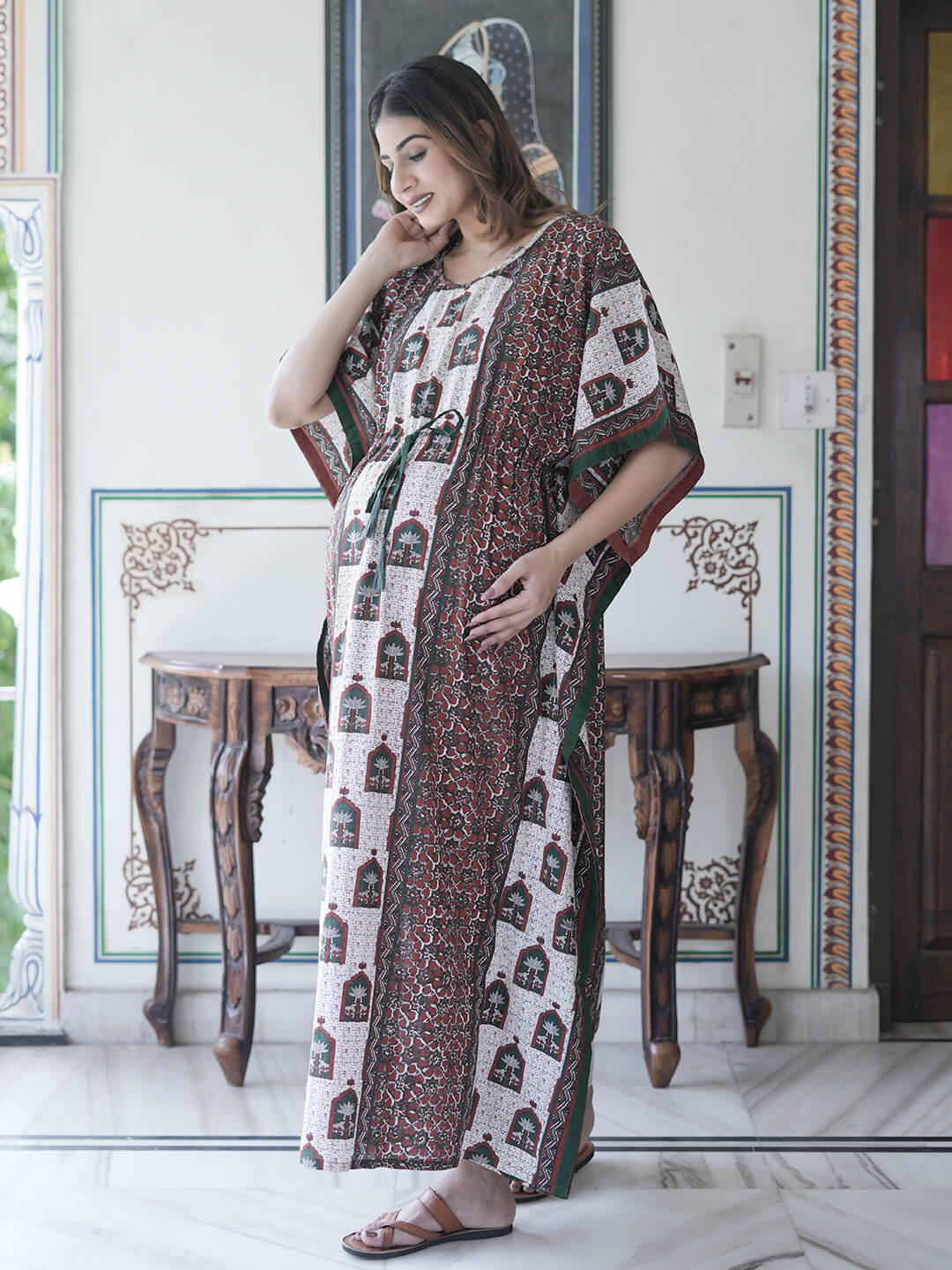 Beige Printed Cotton Maternity Feeding Kaftan Night Suit