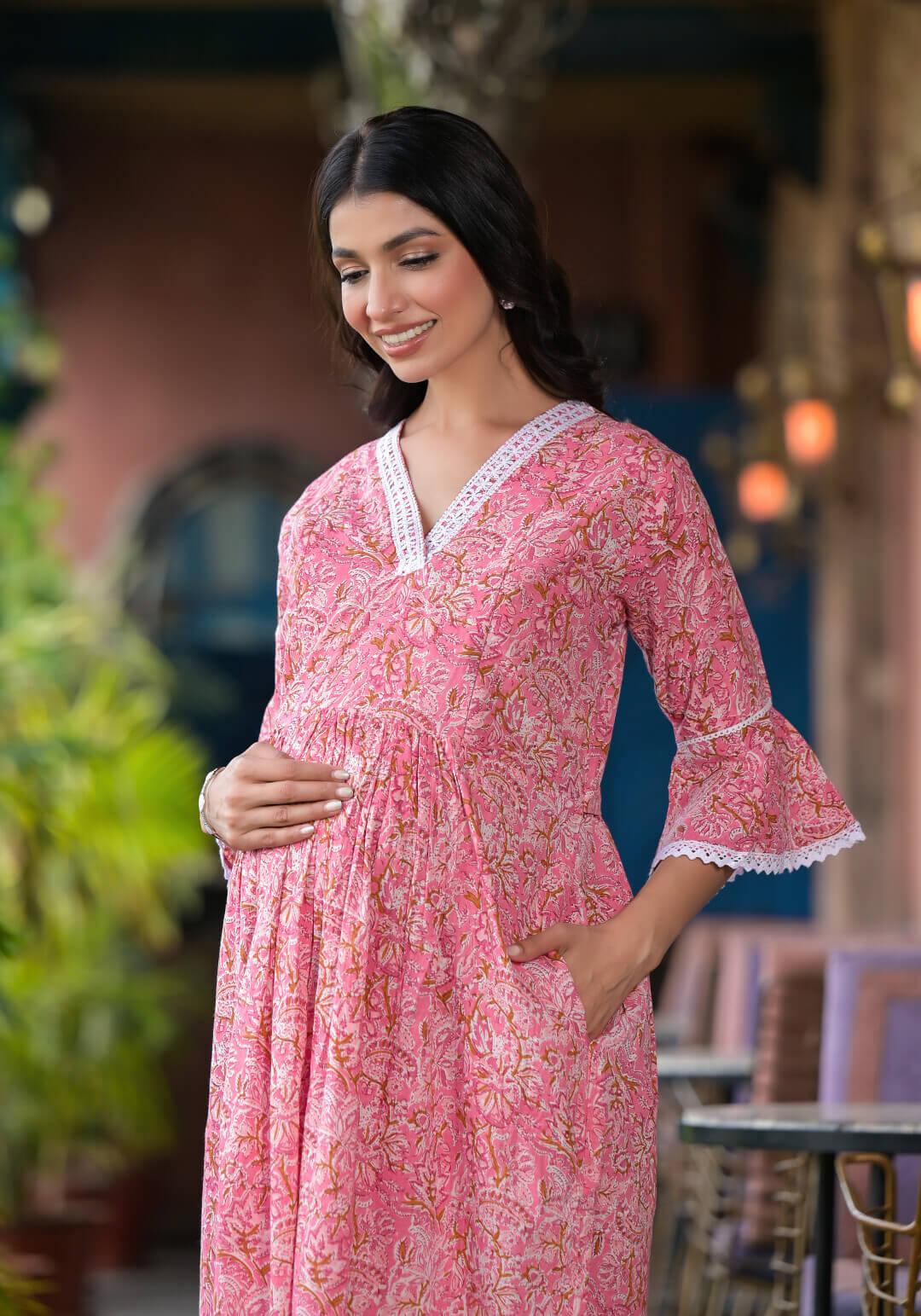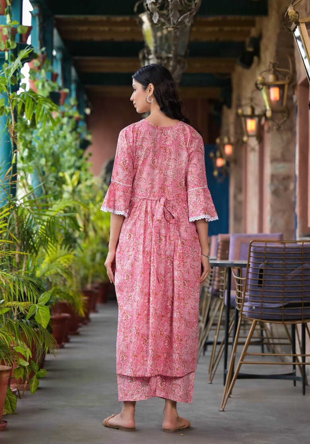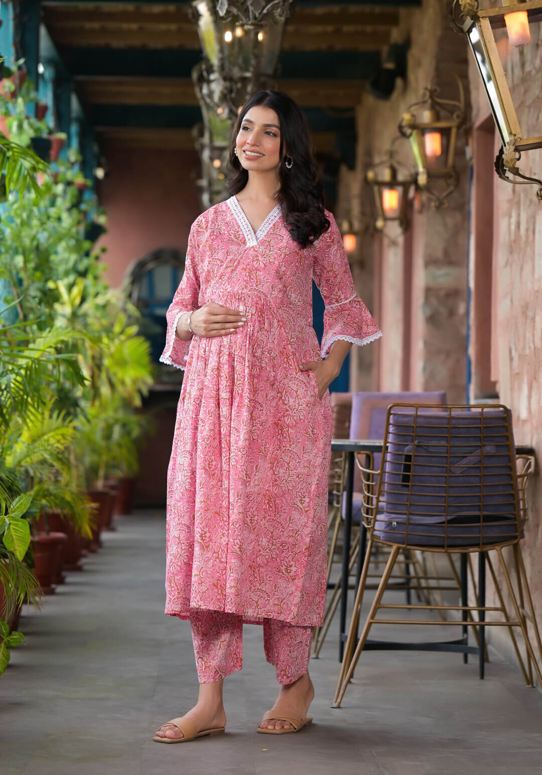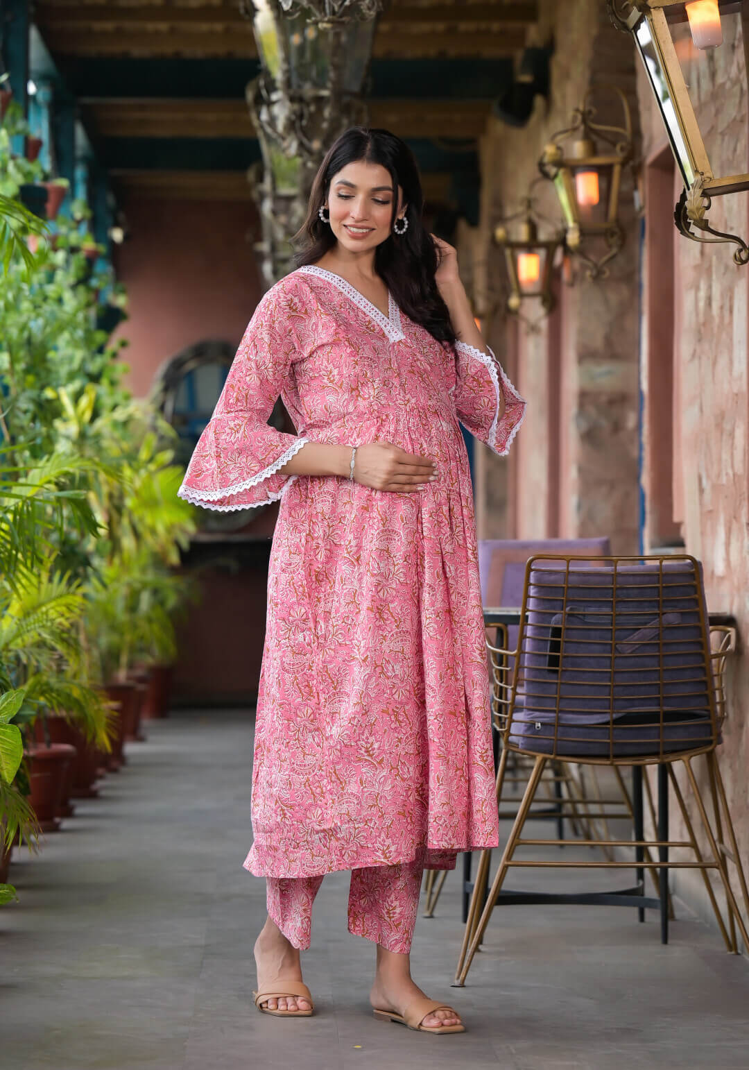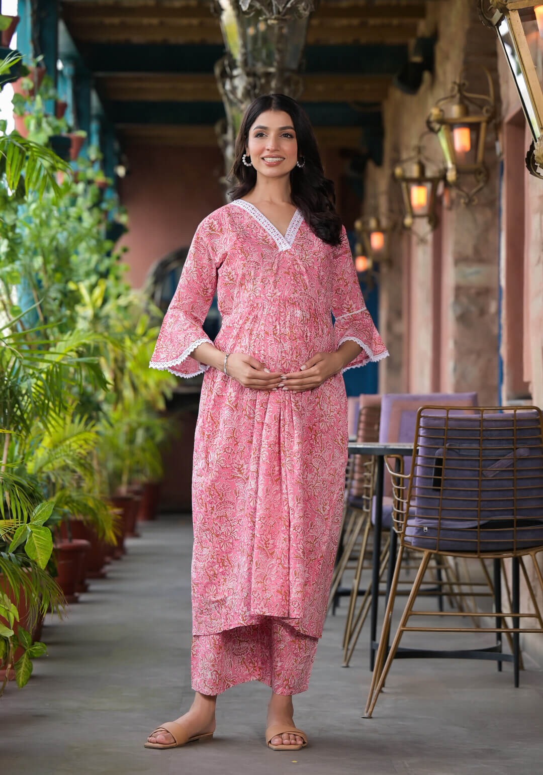 Peach Cotton Printed Maternity Feeding Kurta Set