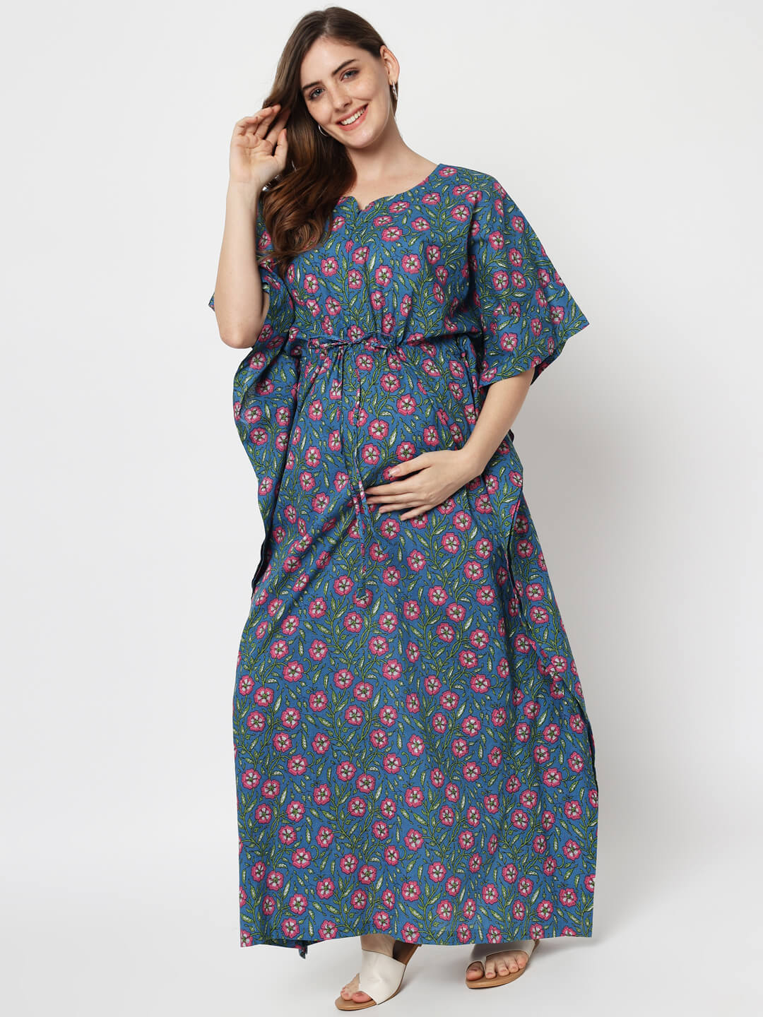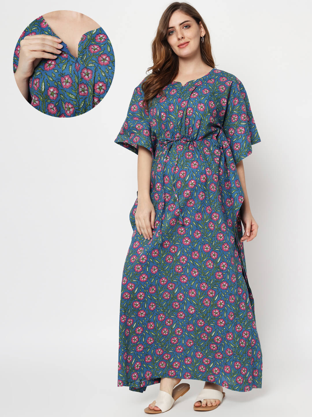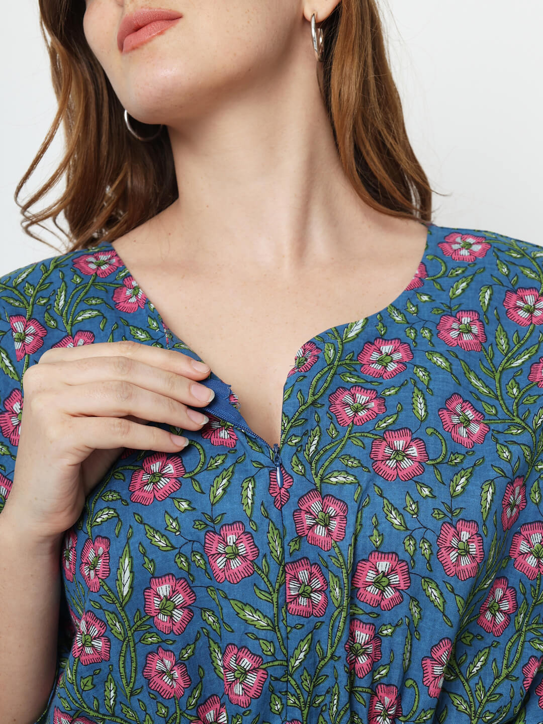 Batwing Sleeves Cotton Printed Maternity Front Zipper Feeding Kaftan - Blue Pink