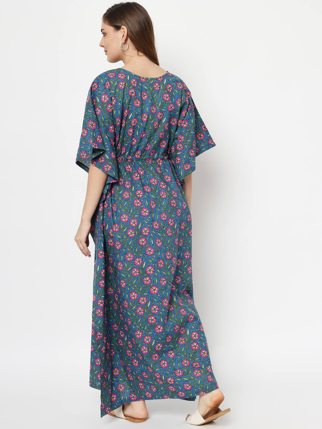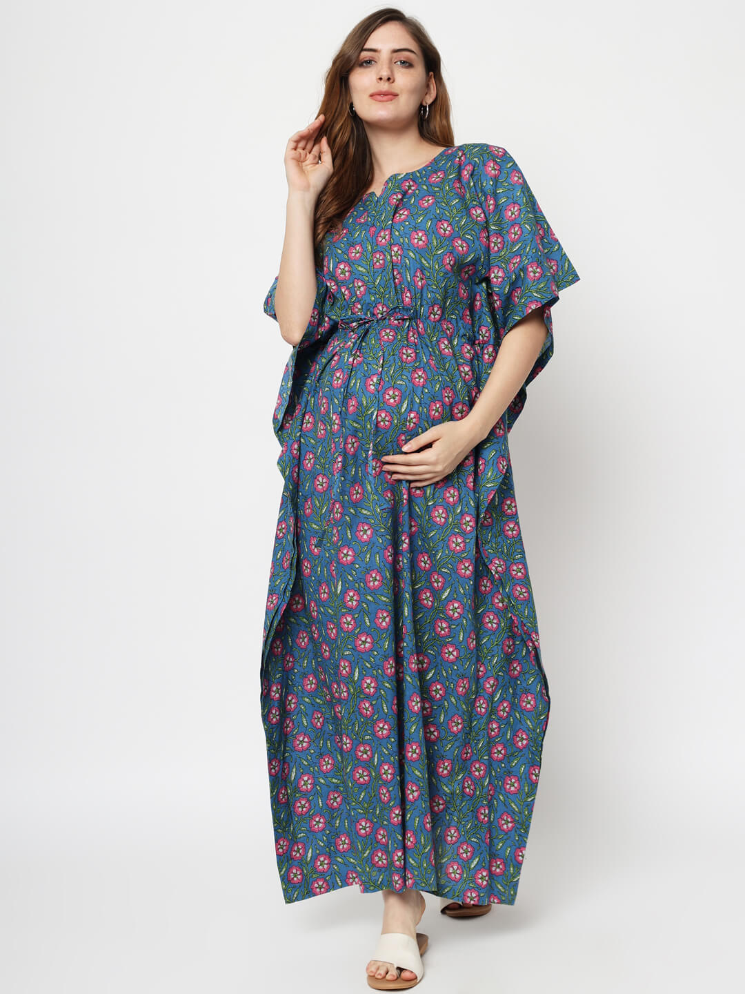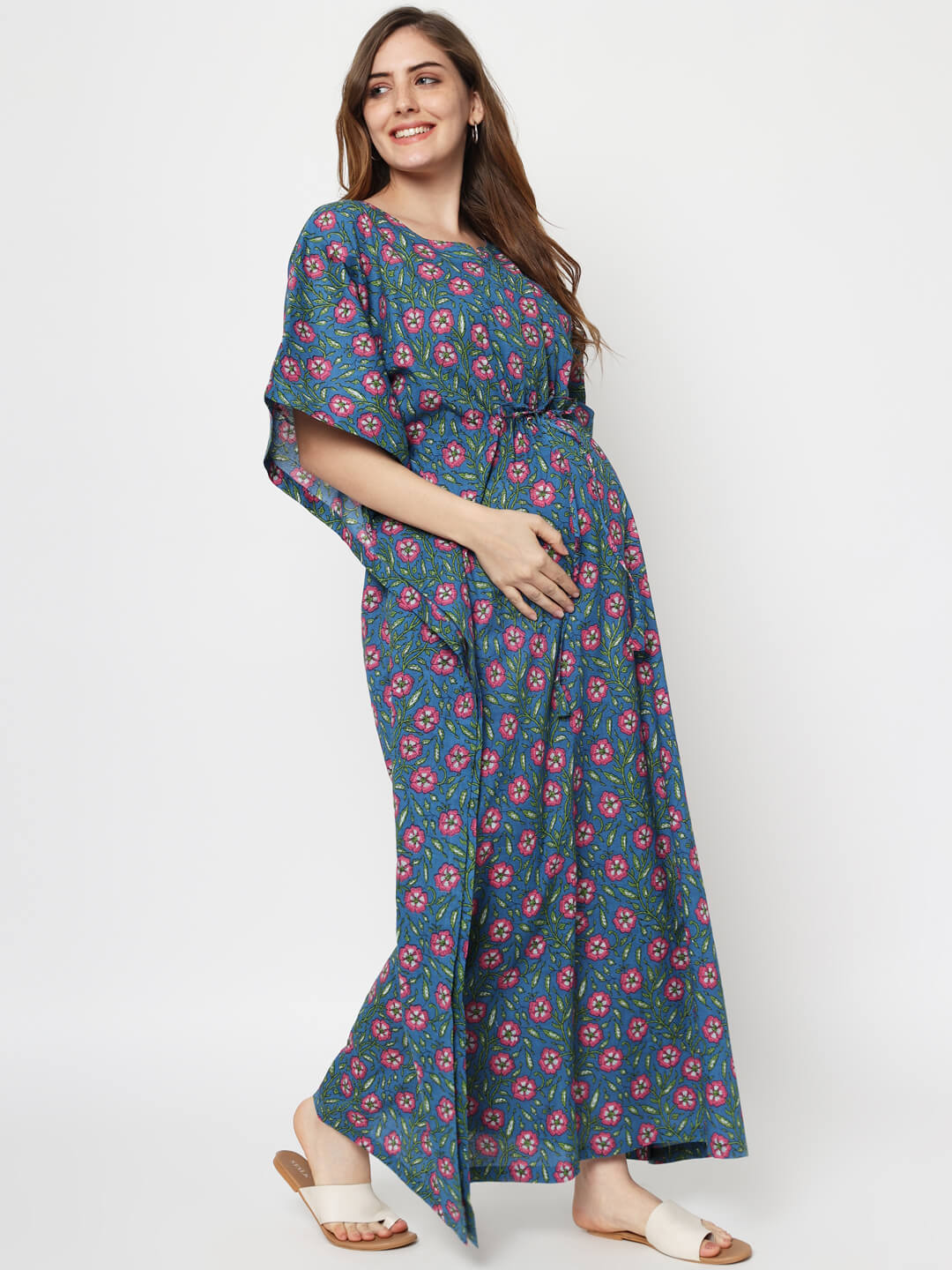 Batwing Sleeves Cotton Printed Maternity Front Zipper Feeding Kaftan - Blue Pink