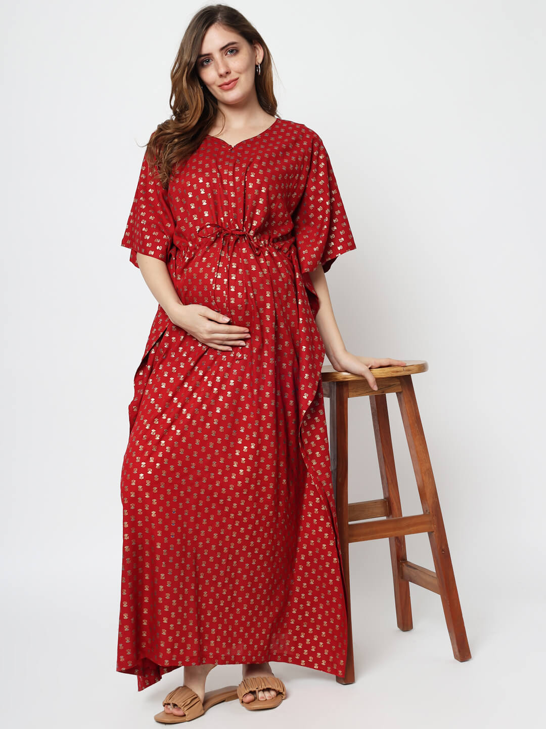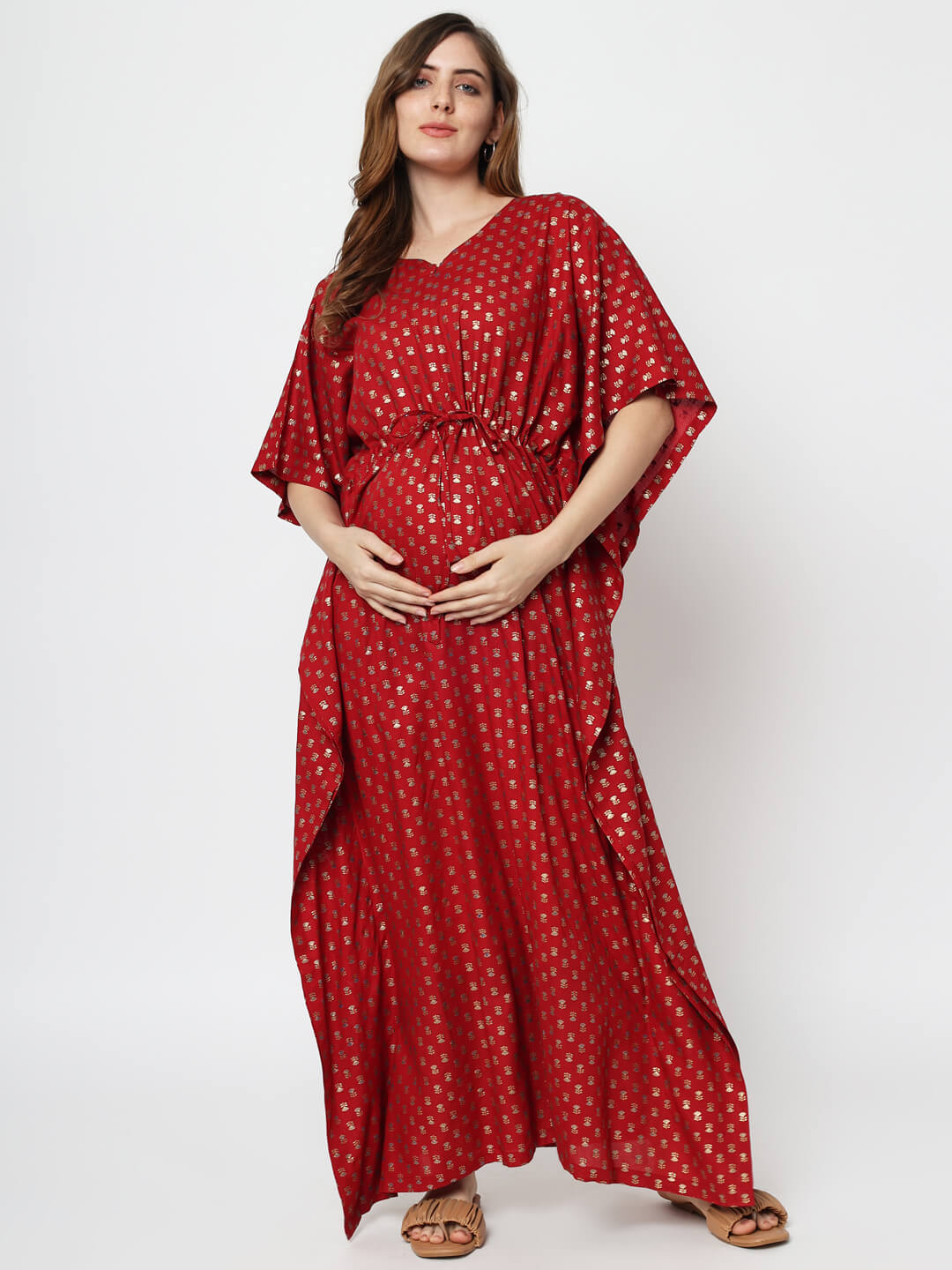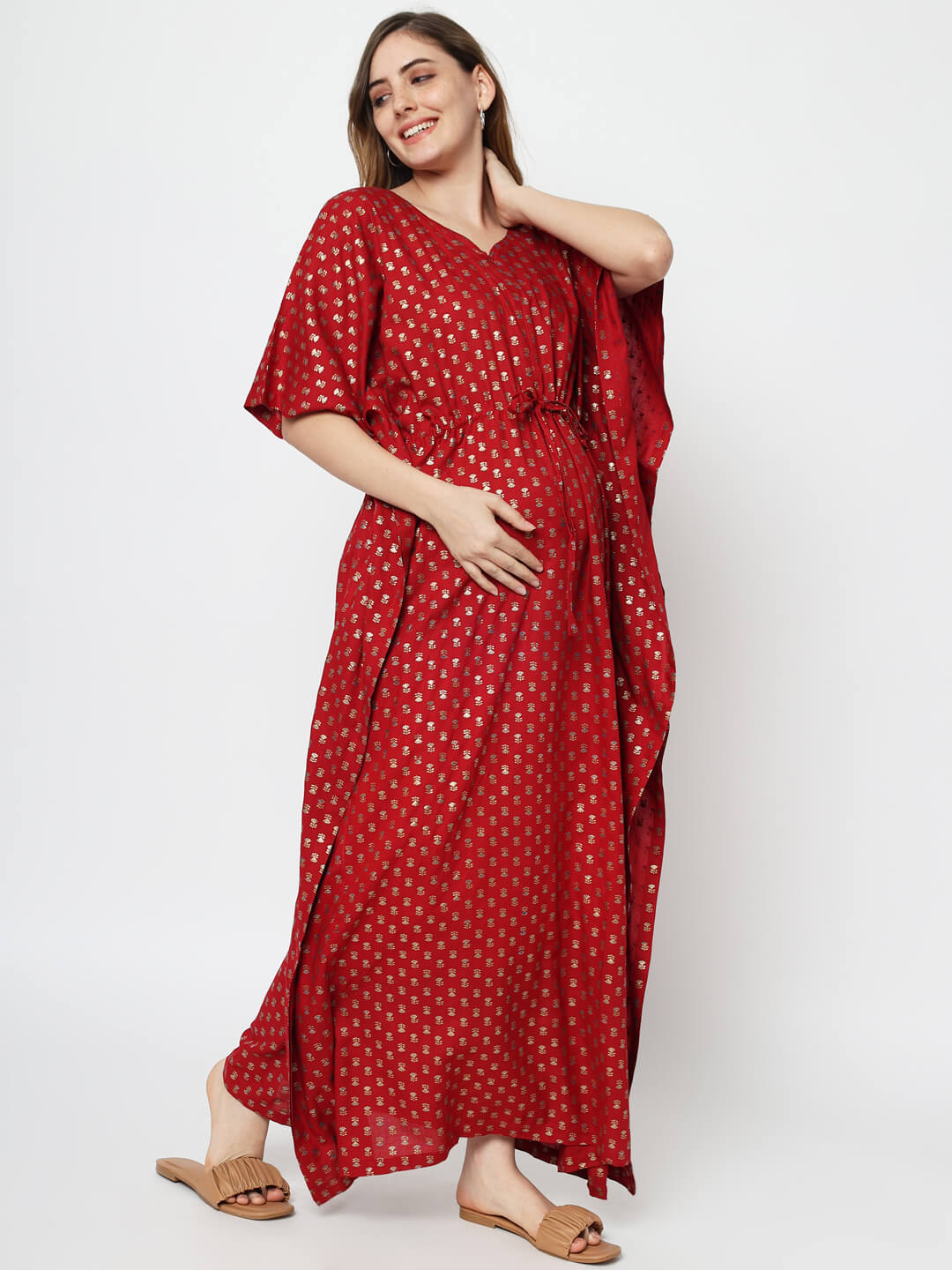 Batwing Sleeves Rayon Printed Maternity Front Zipper Feeding Kaftan - Maroon Gold