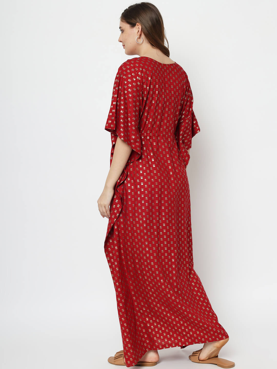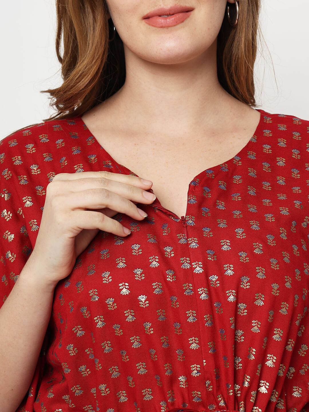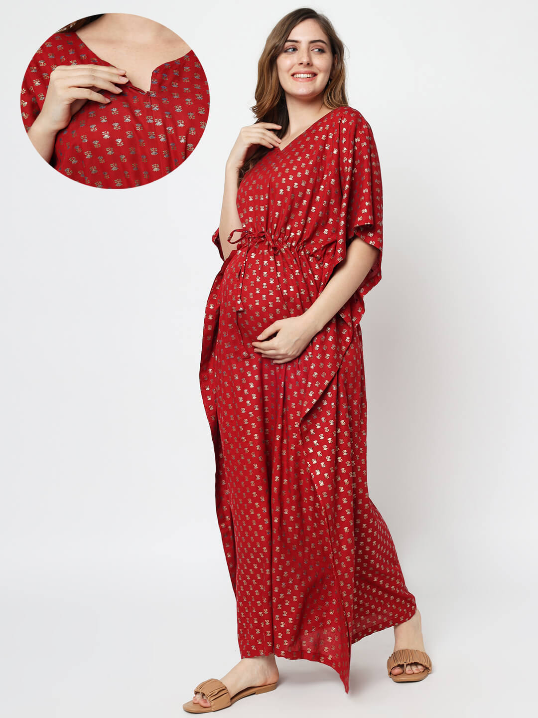 Batwing Sleeves Rayon Printed Maternity Front Zipper Feeding Kaftan - Maroon Gold