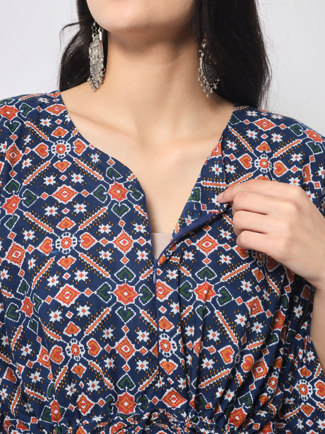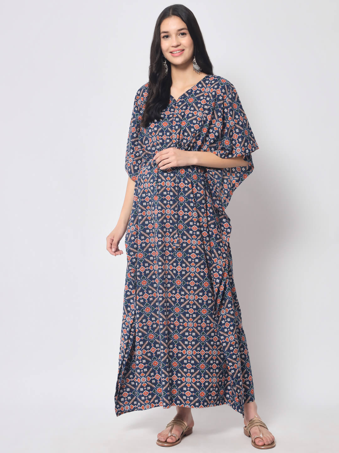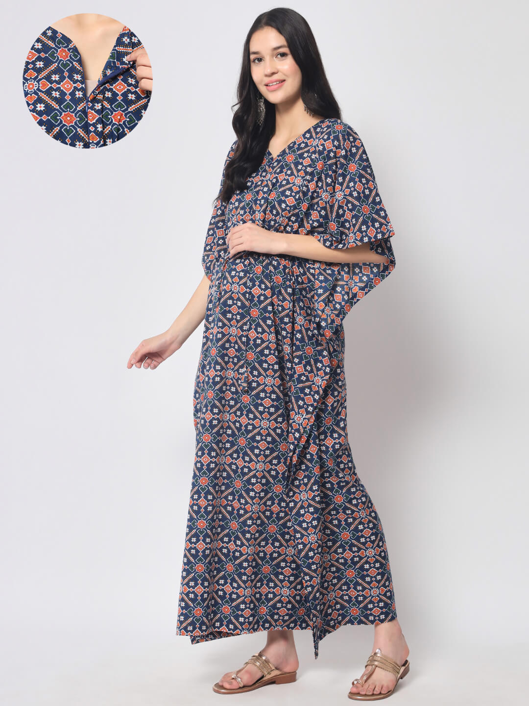 Indigo Multi Cotton Printed Maternity Feeding Kaftan