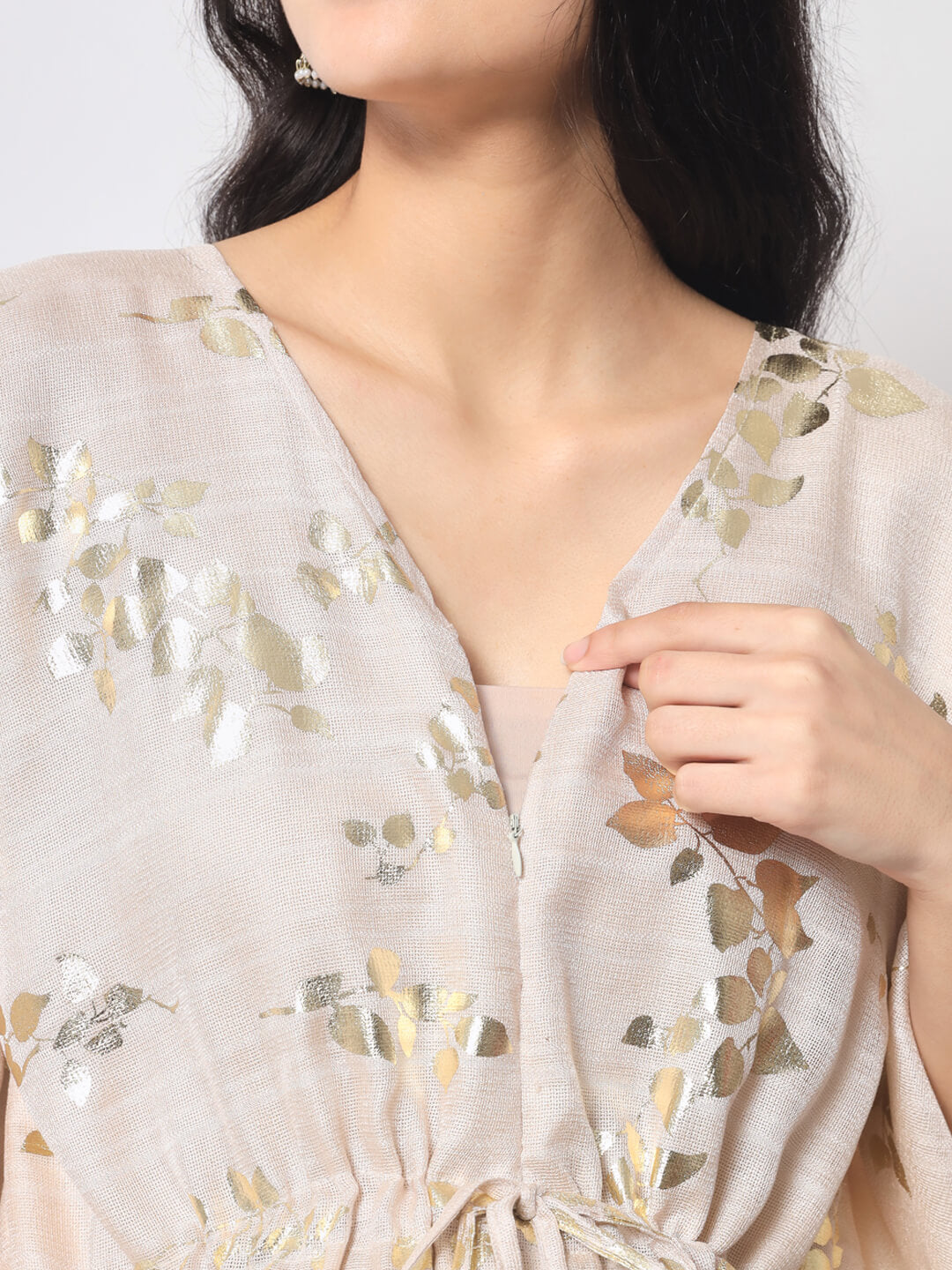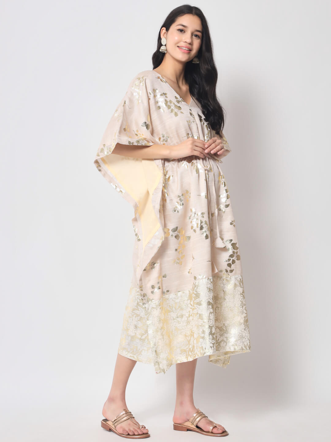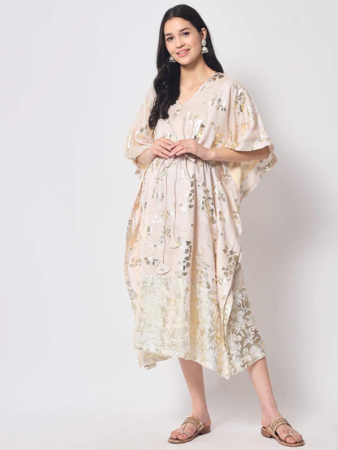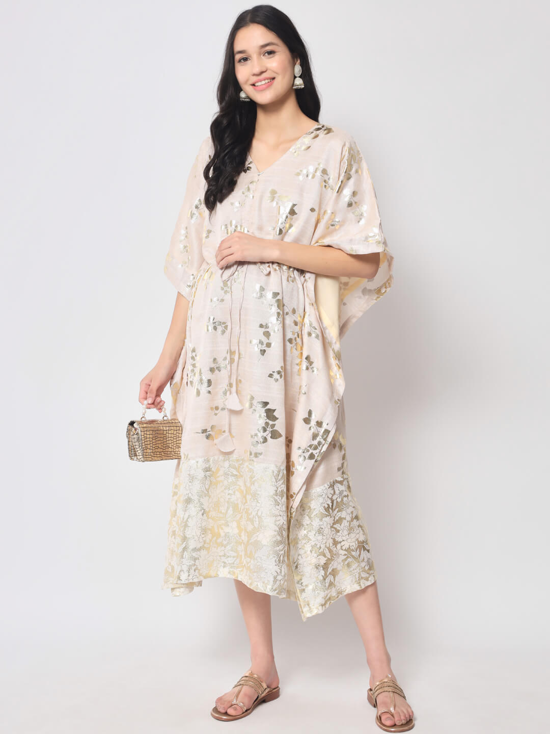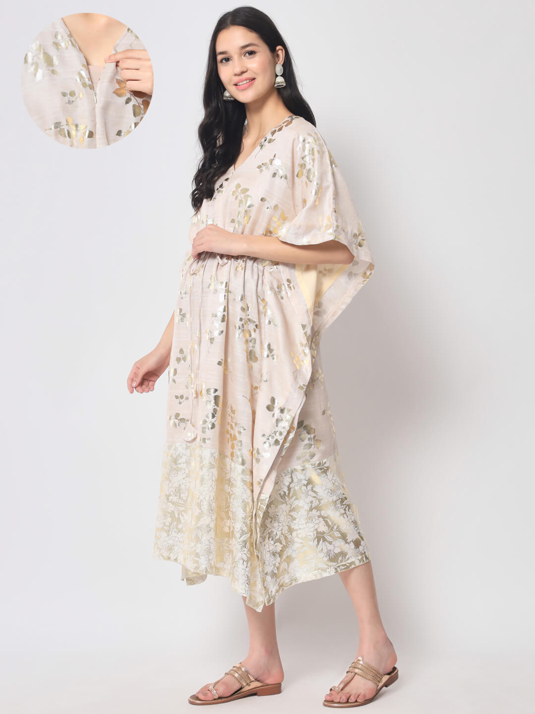 Ivory Gold foil Printed Maternity Feeding Kaftan Dress