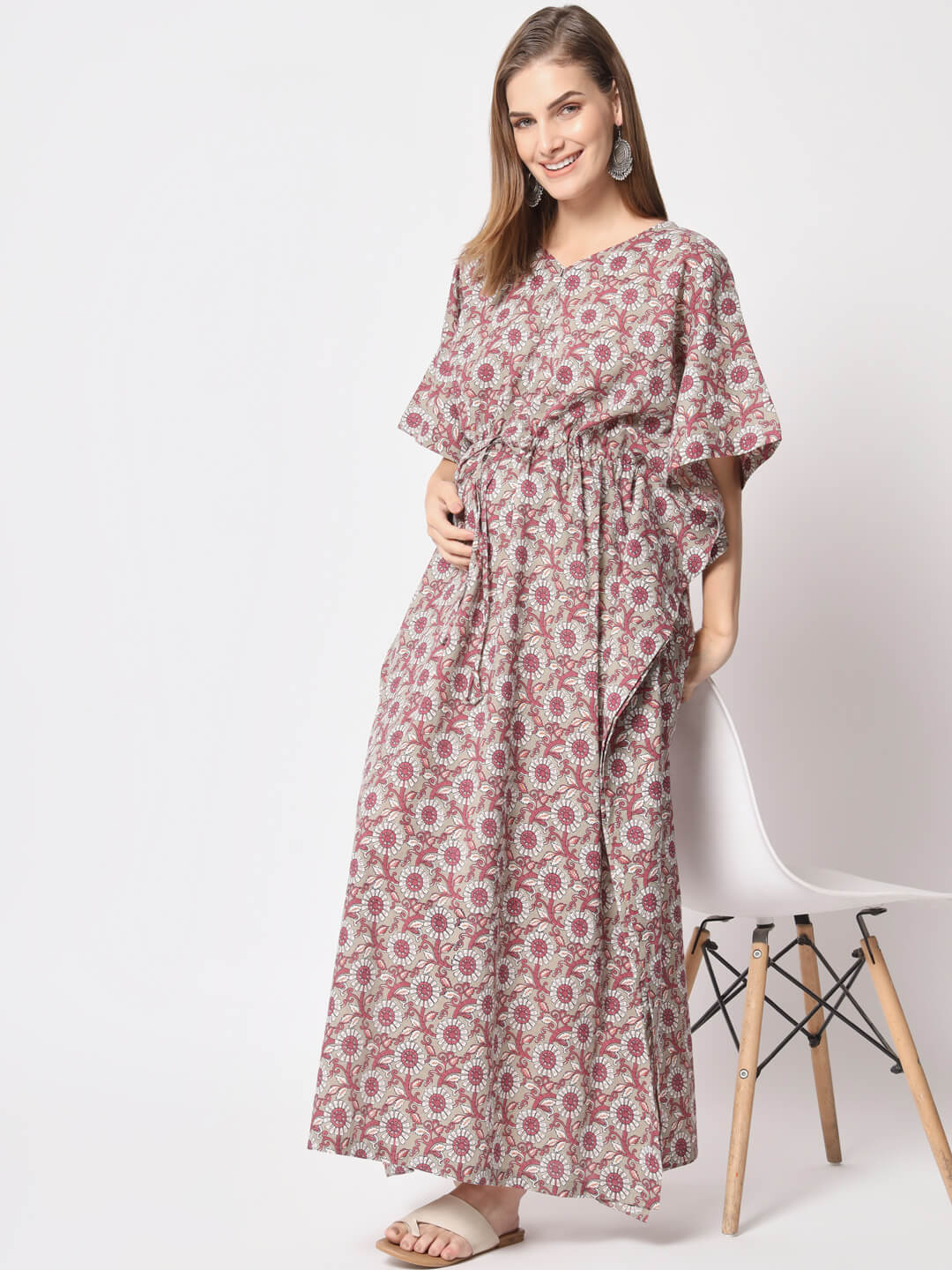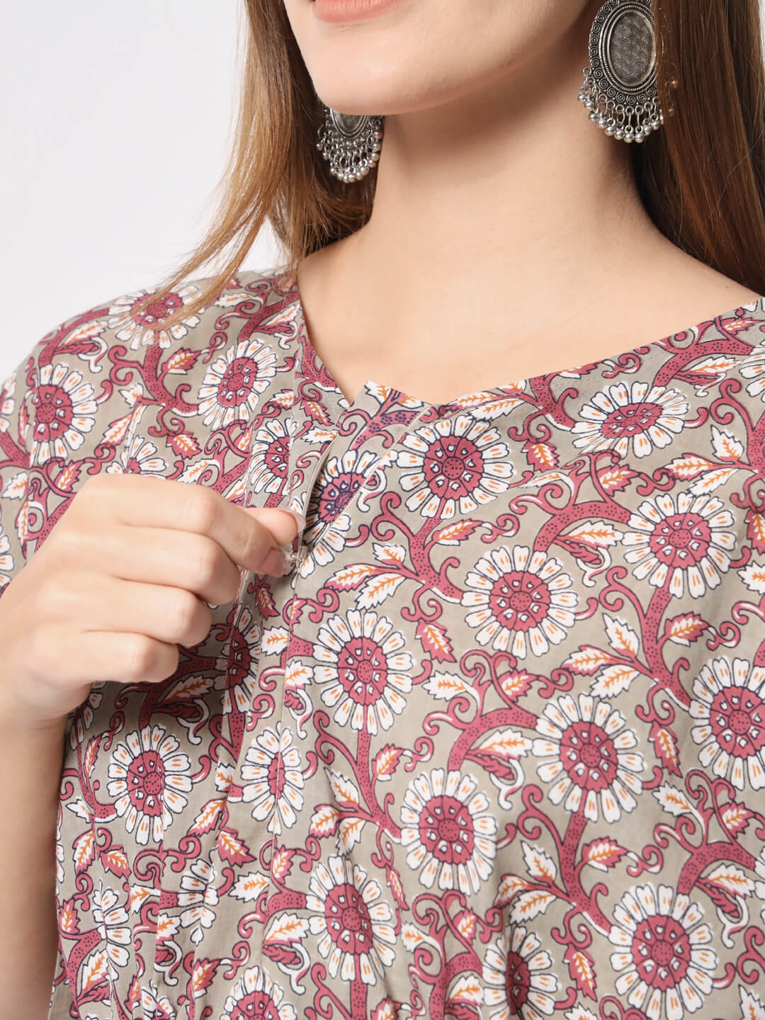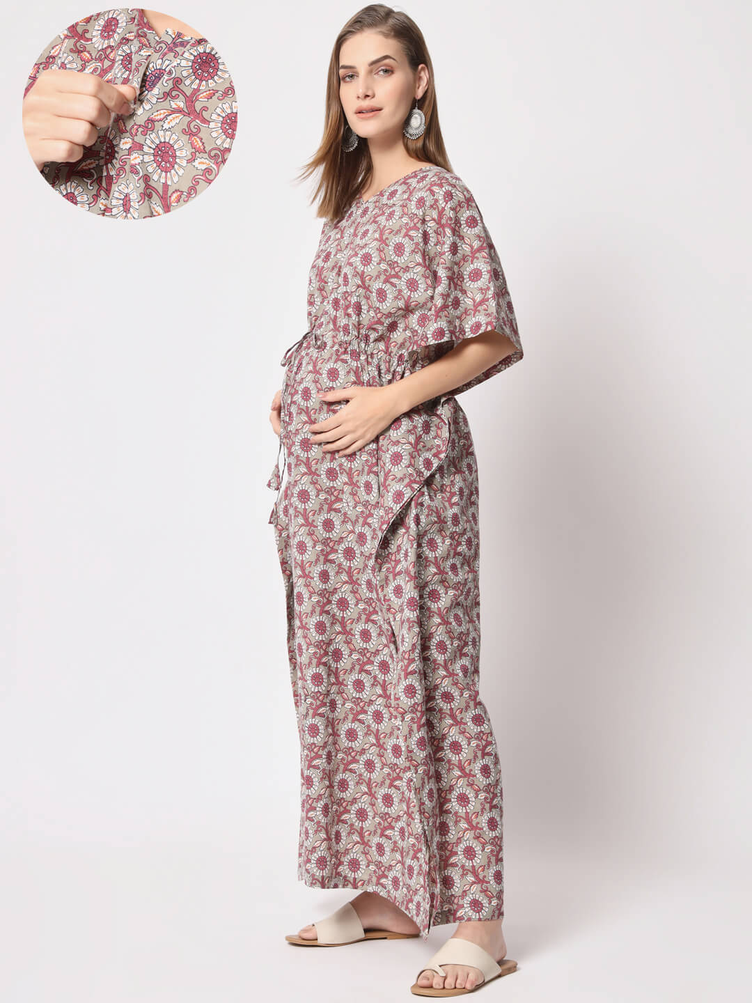 Beige Multi Cotton Printed Maternity Front Zipper Feeding Kaftan