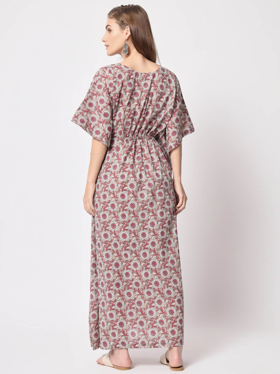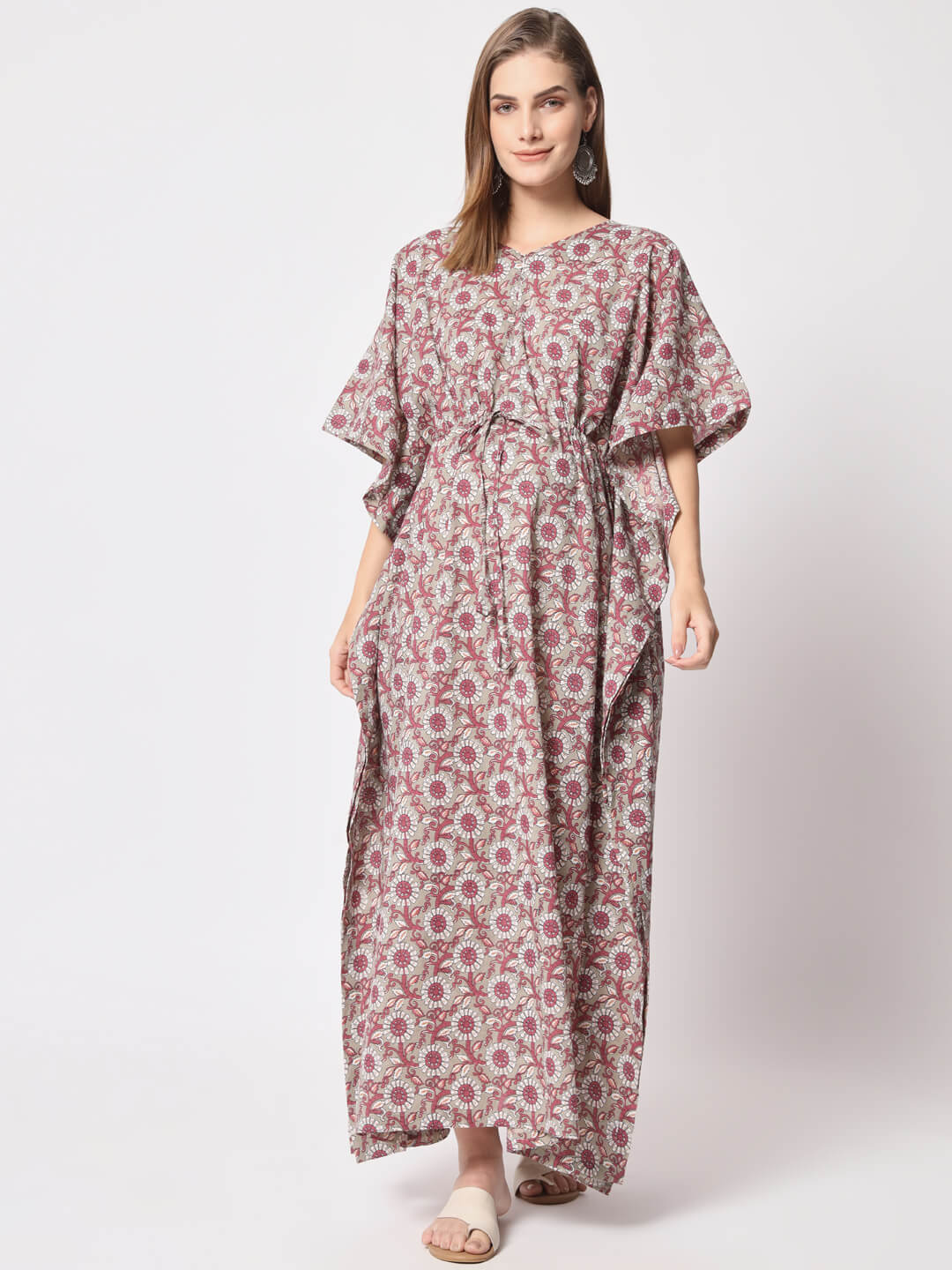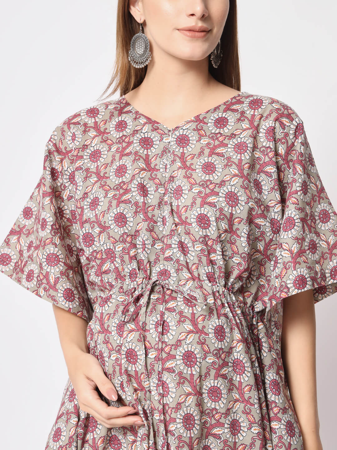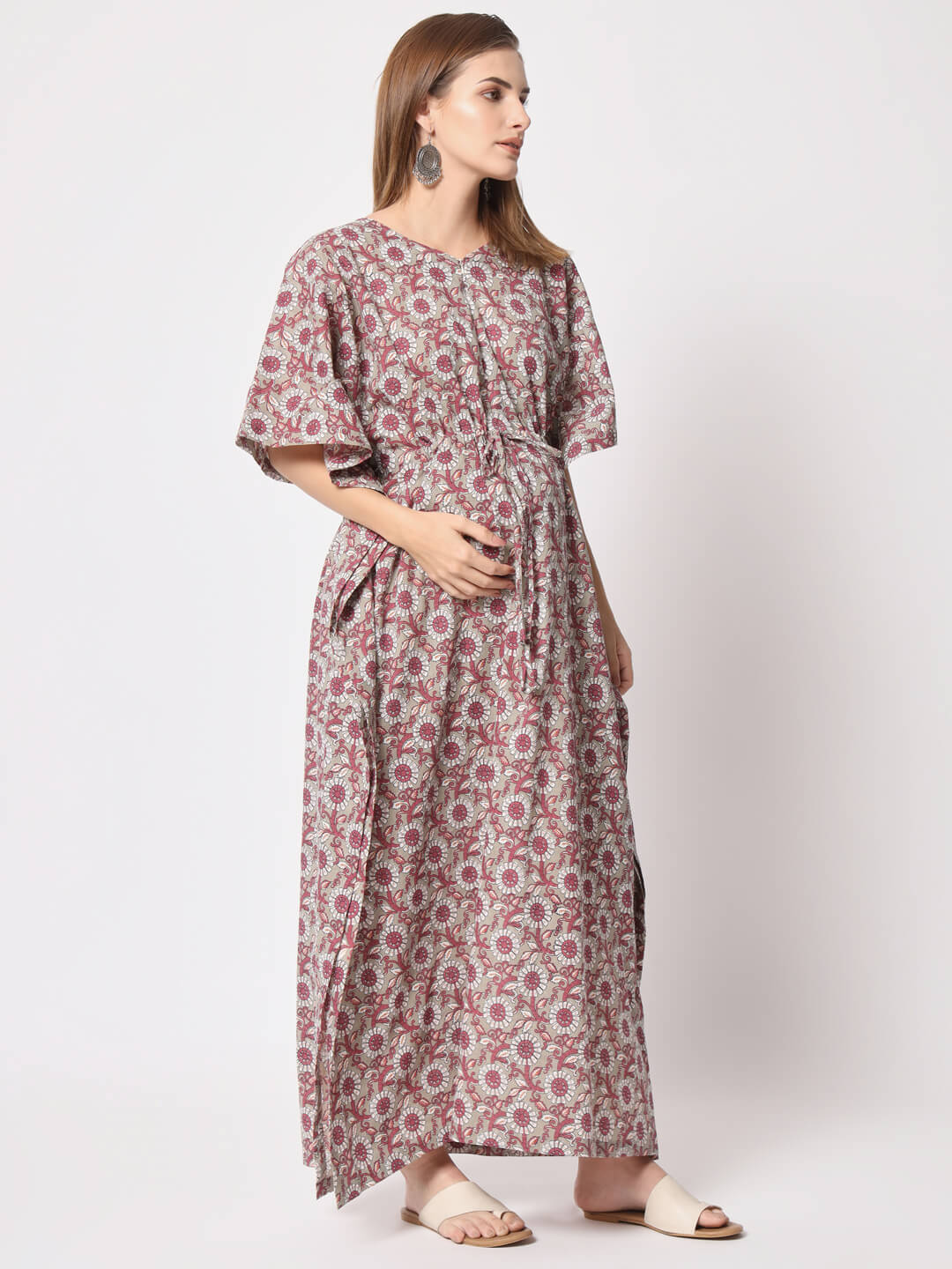 Beige Multi Cotton Printed Maternity Front Zipper Feeding Kaftan