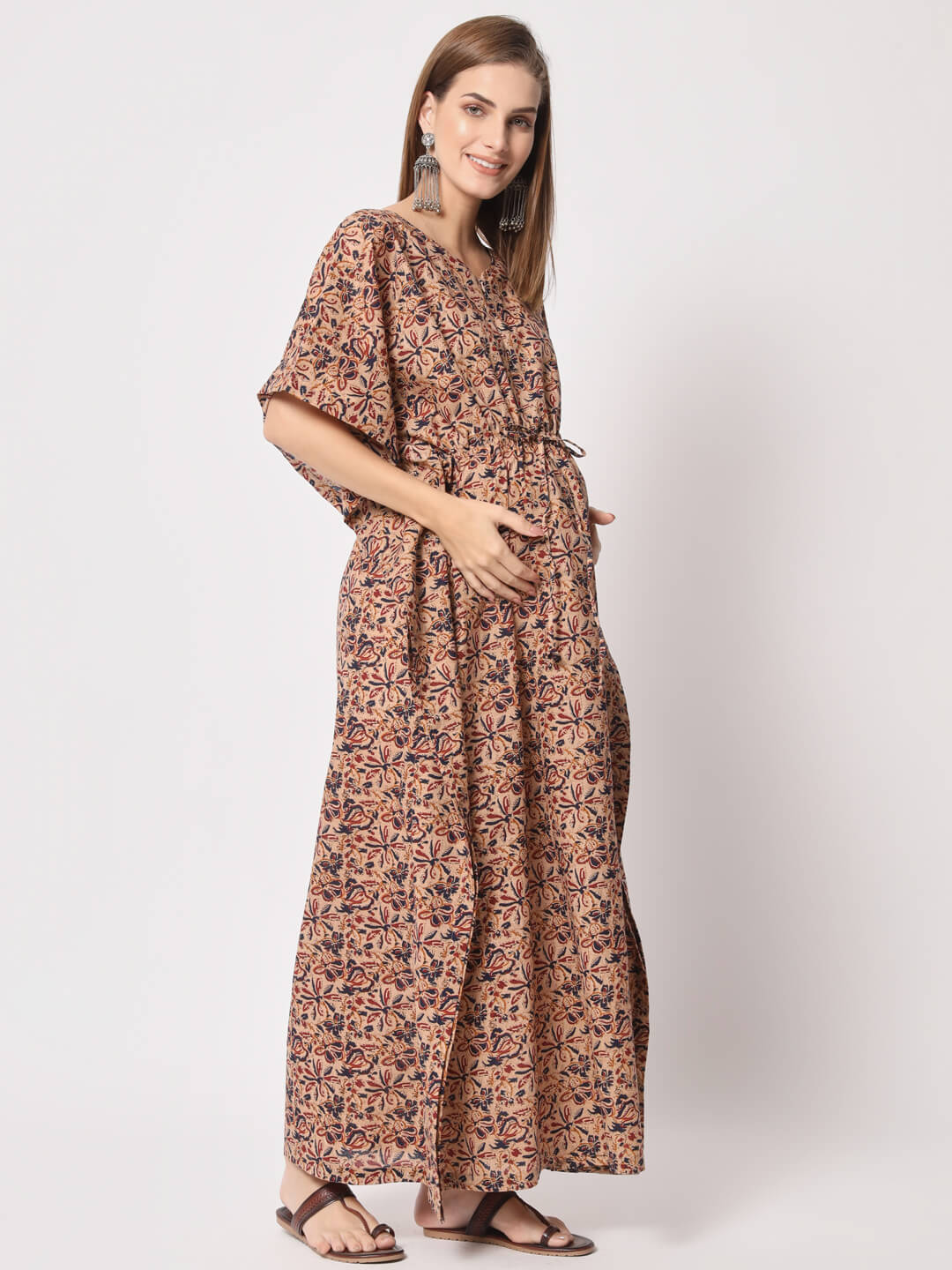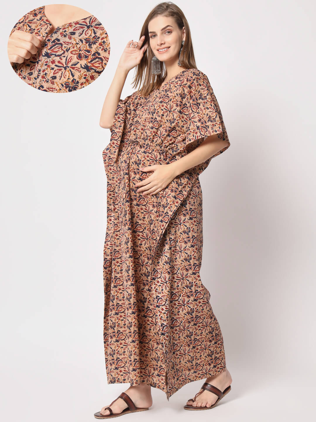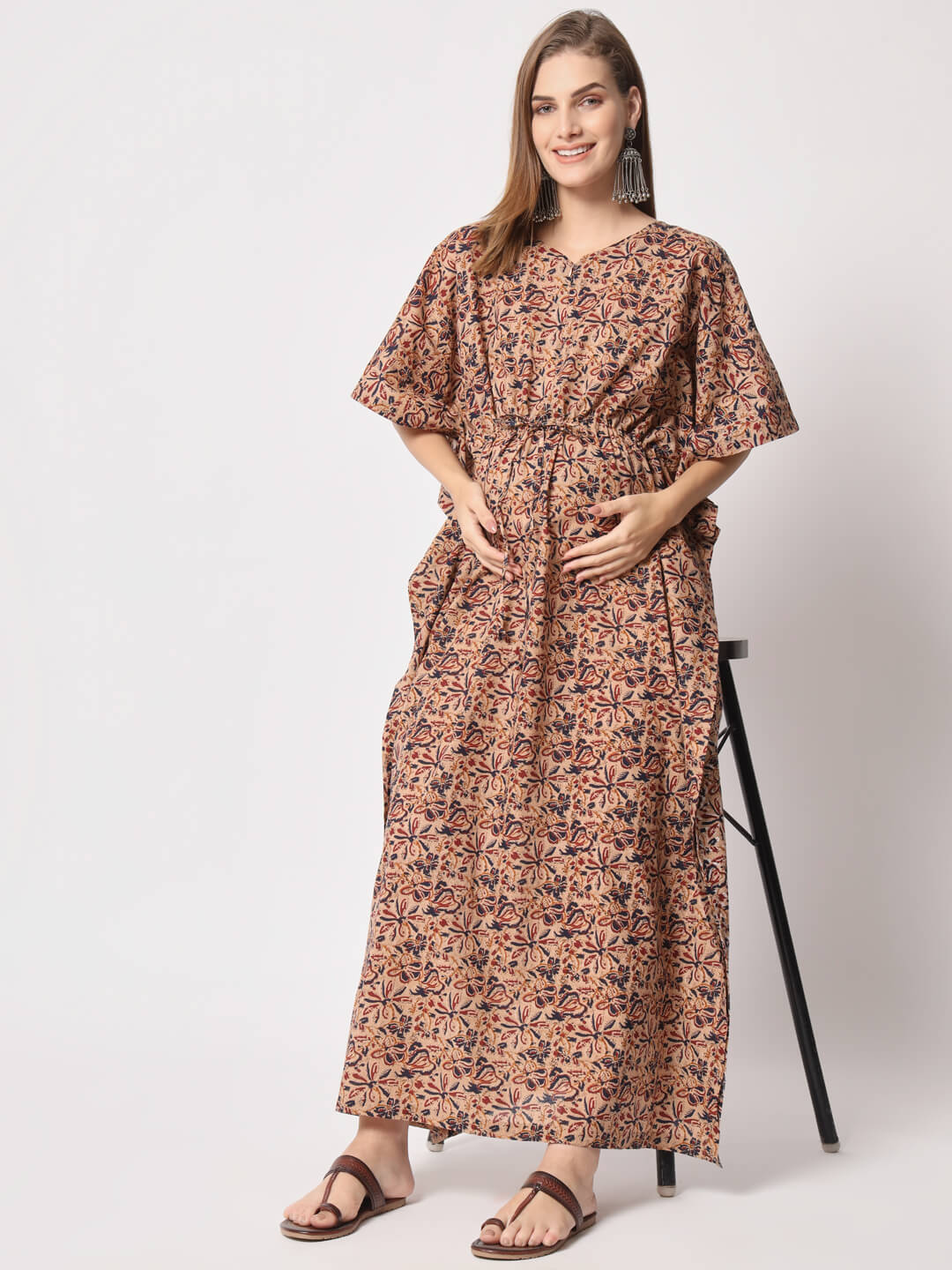 Beige Multi Cotton Printed Maternity Front Zipper Feeding Kaftan