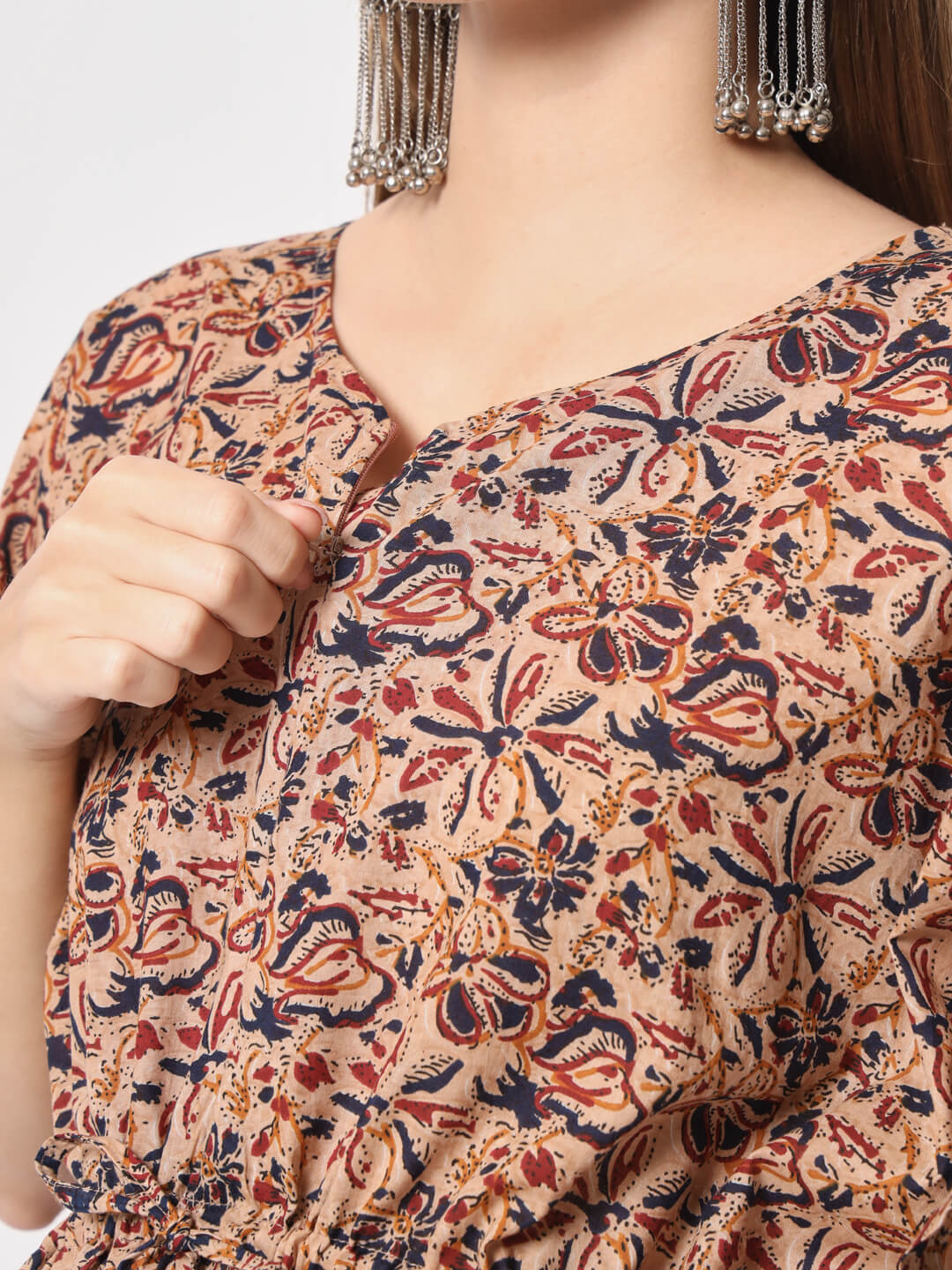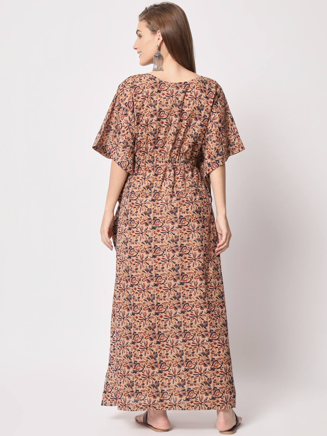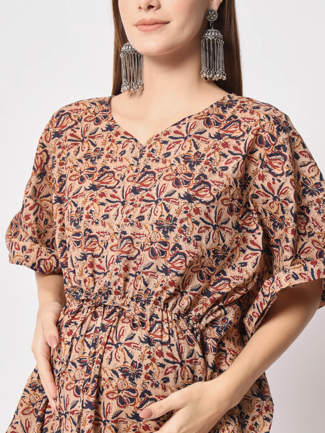 Beige Multi Cotton Printed Maternity Front Zipper Feeding Kaftan