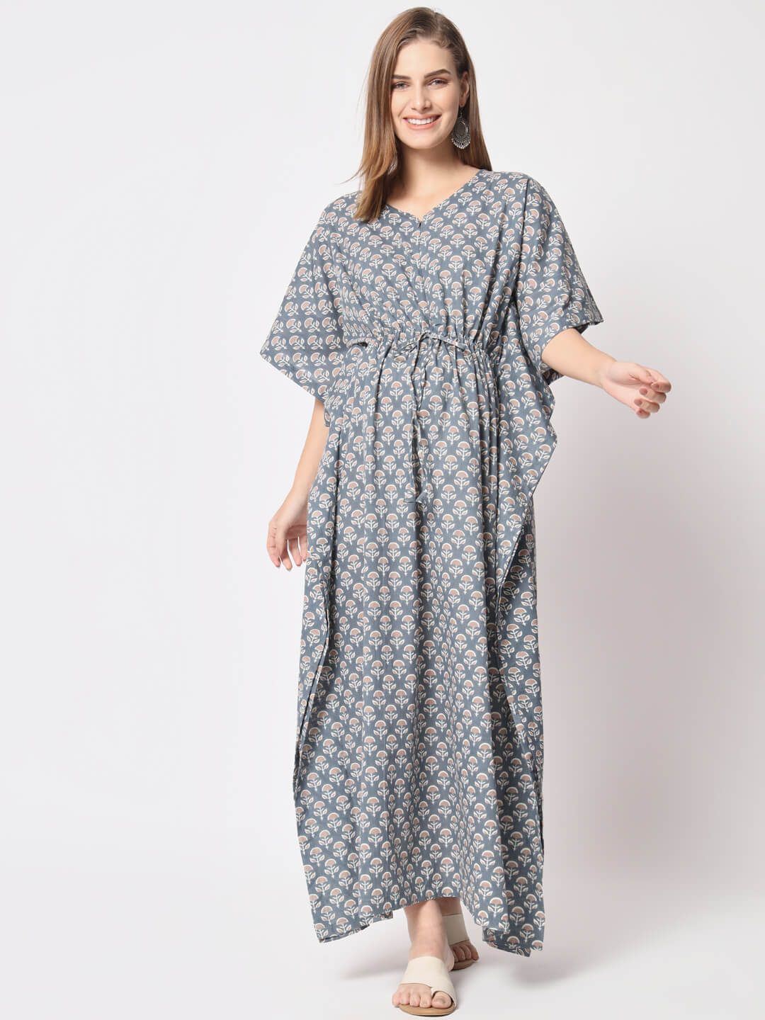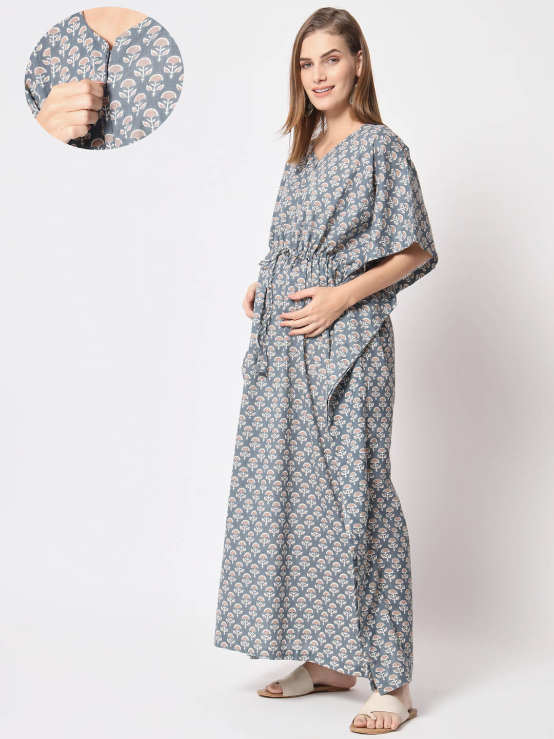 Light Grey Cotton Printed Maternity Front Zipper Feeding Kaftan