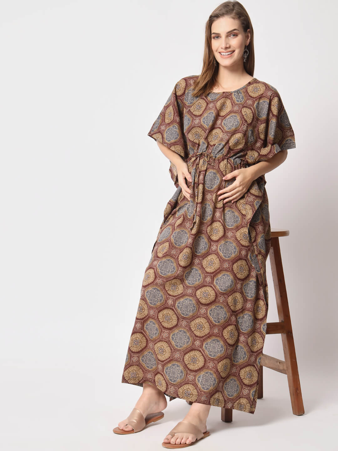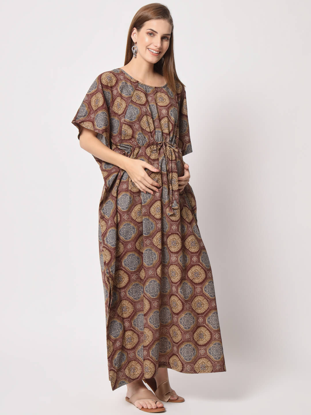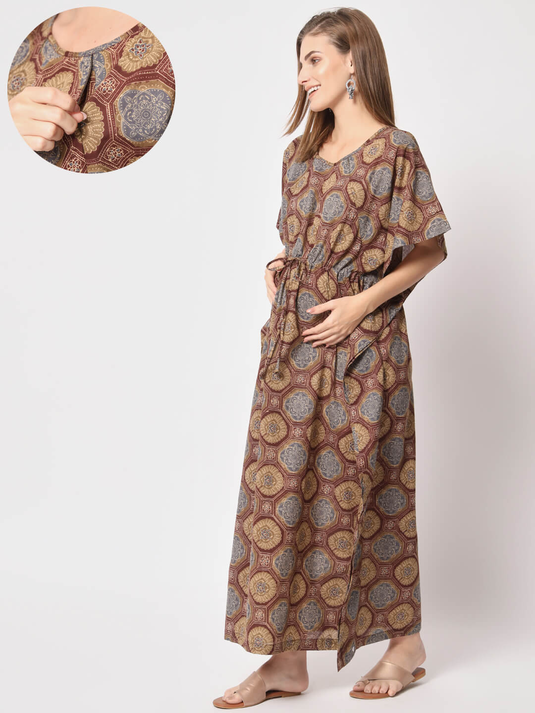 Brown Multi Cotton Printed Maternity Front Zipper Feeding Kaftan
