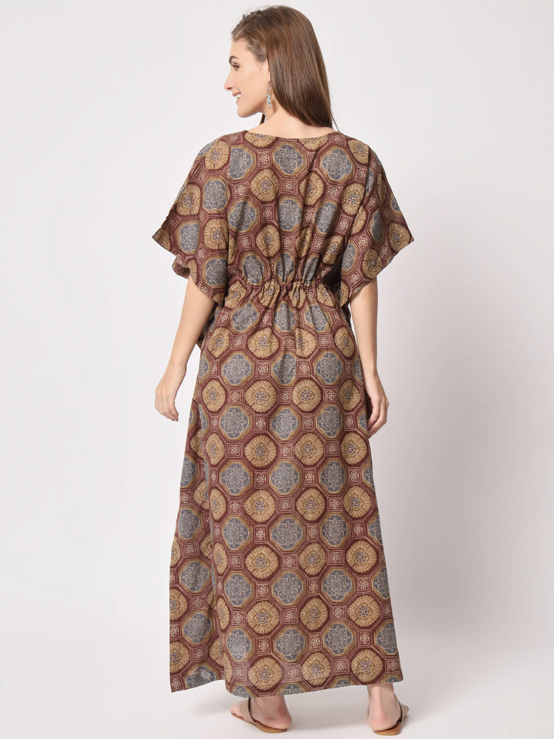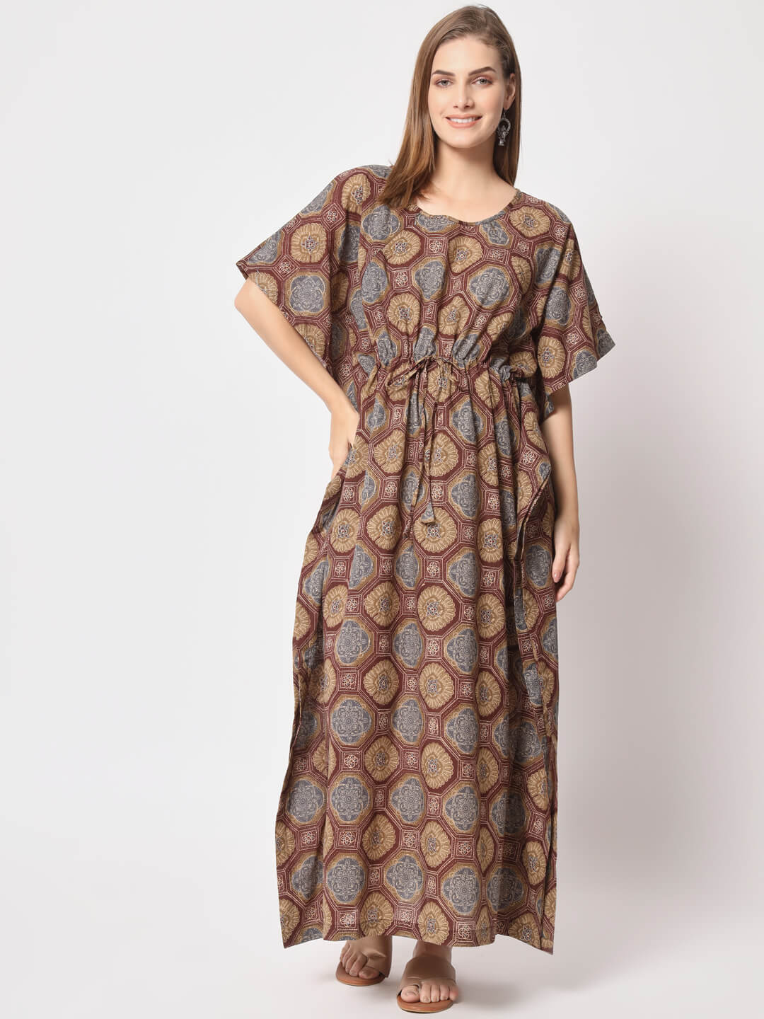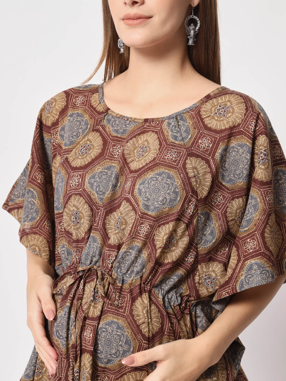 Brown Multi Cotton Printed Maternity Front Zipper Feeding Kaftan