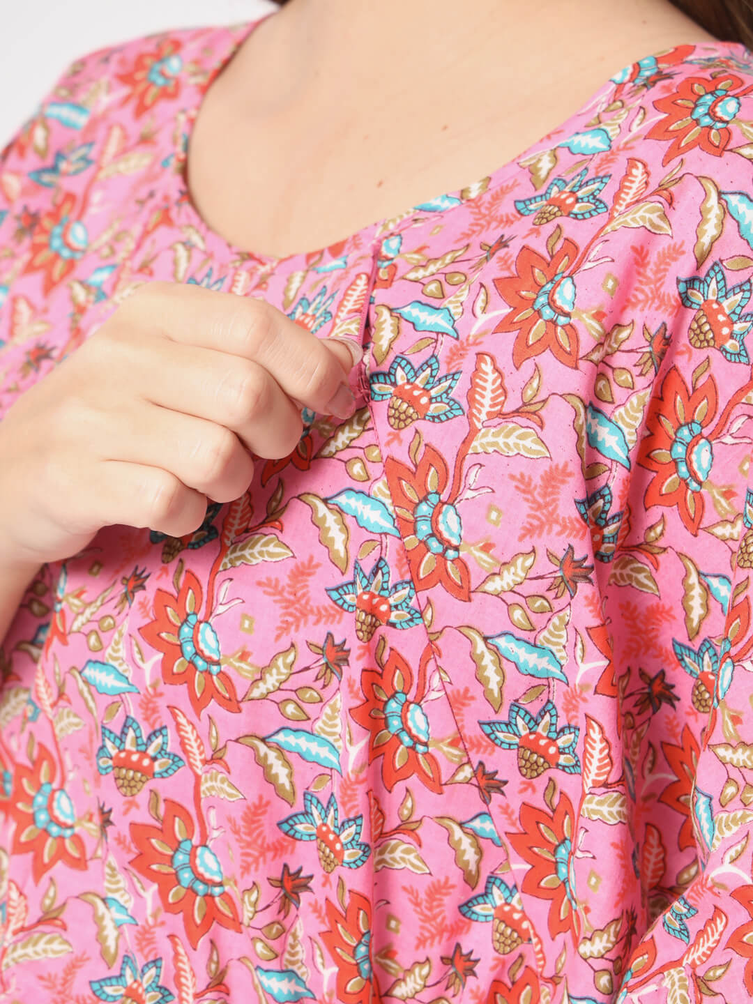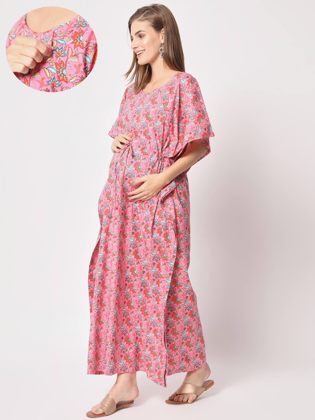 Pink Multi Cotton Printed Maternity Front Zipper Feeding Kaftan