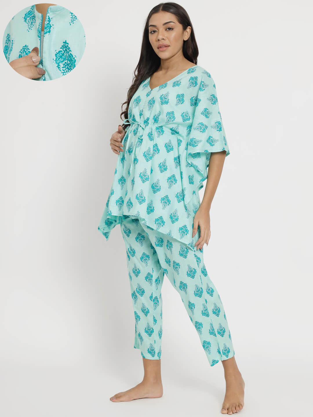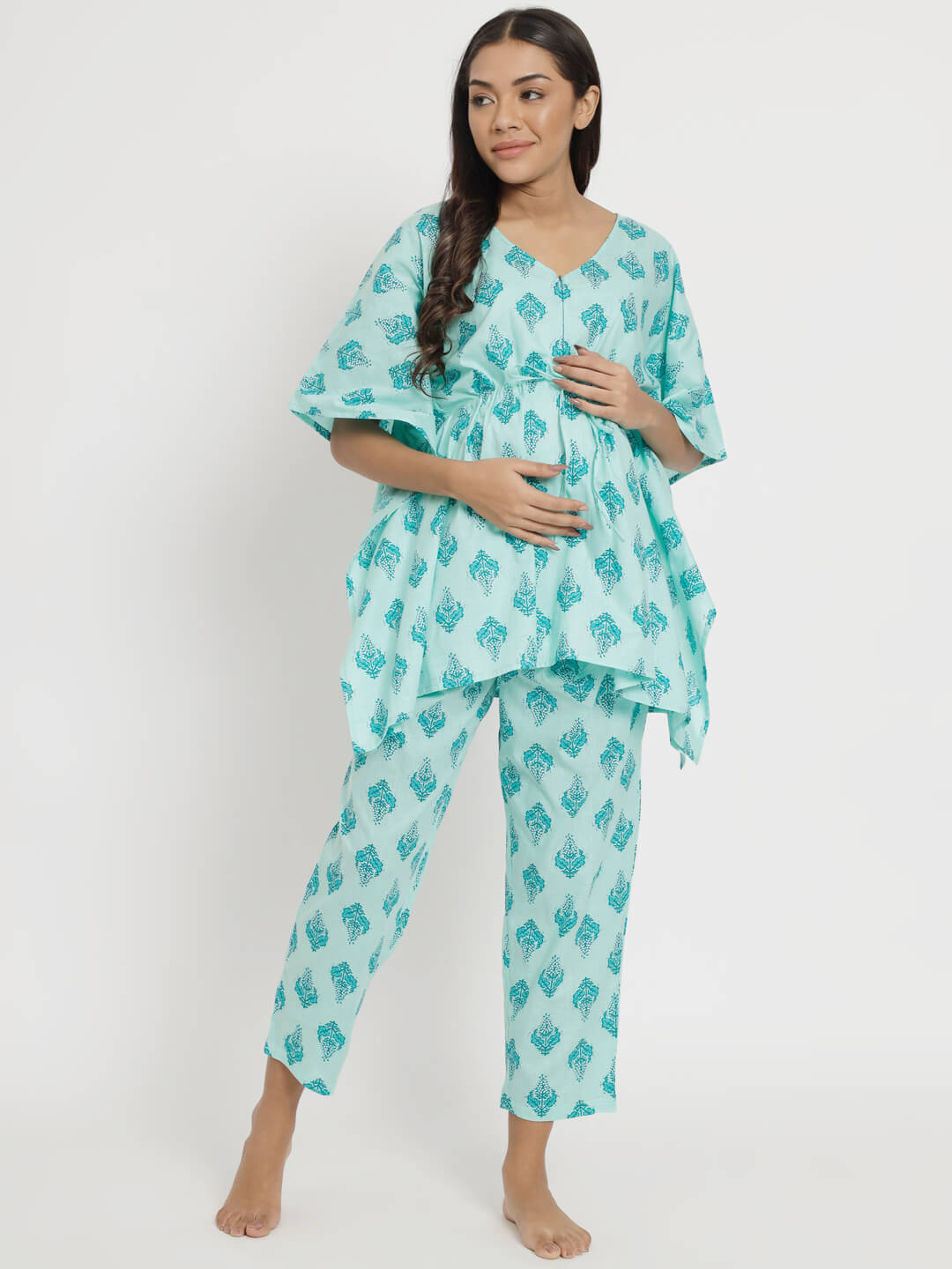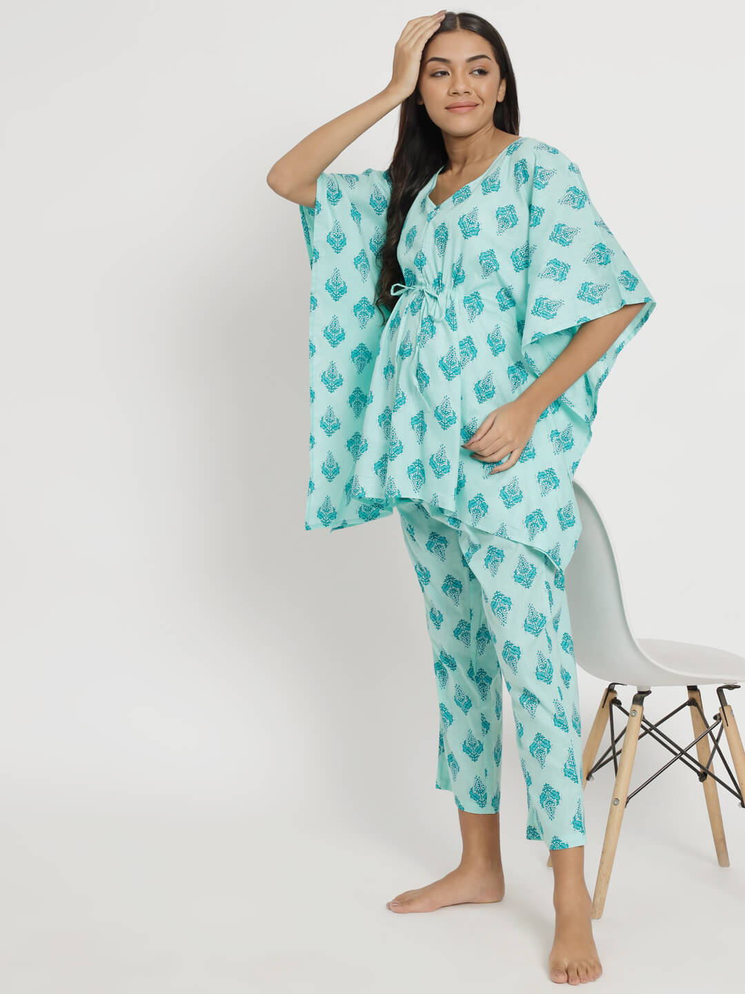 Turquoise Blue Printed Maternity Feeding Kaftan Night Suit