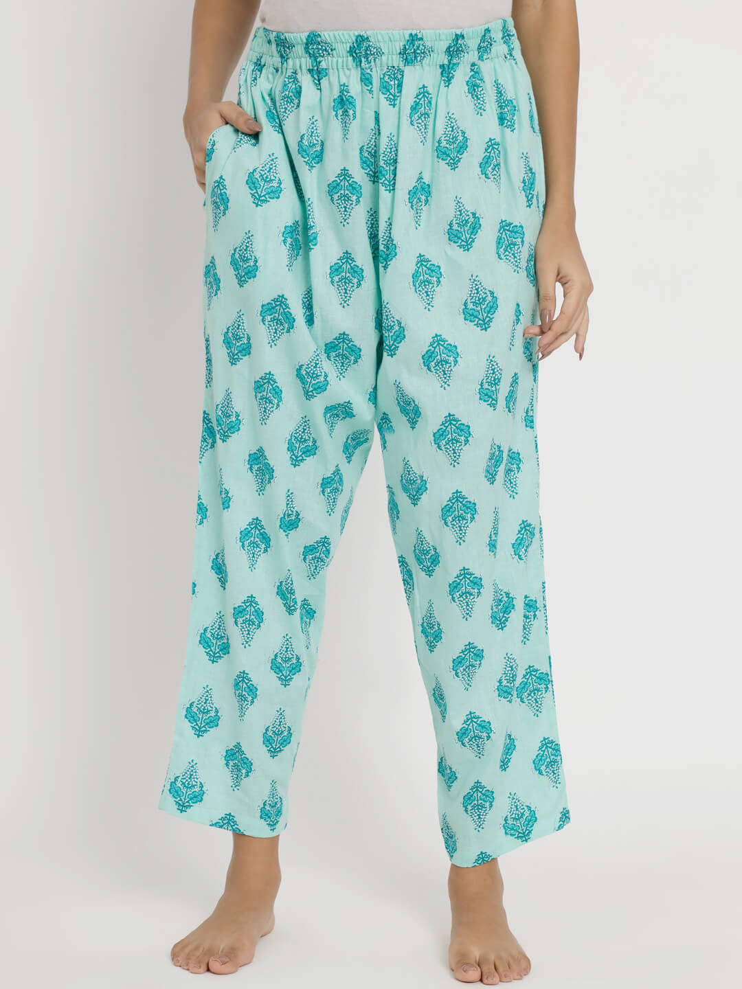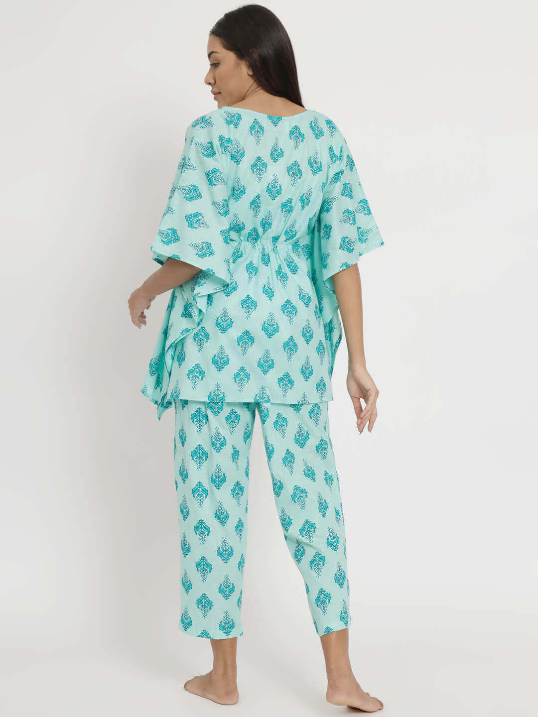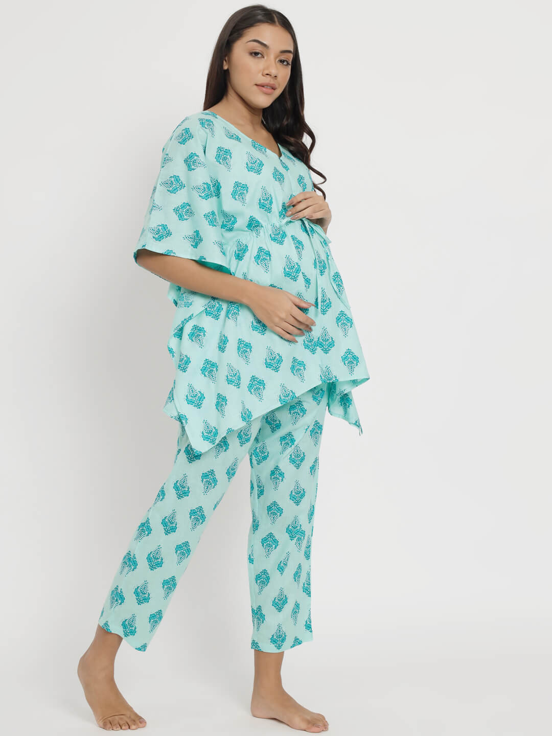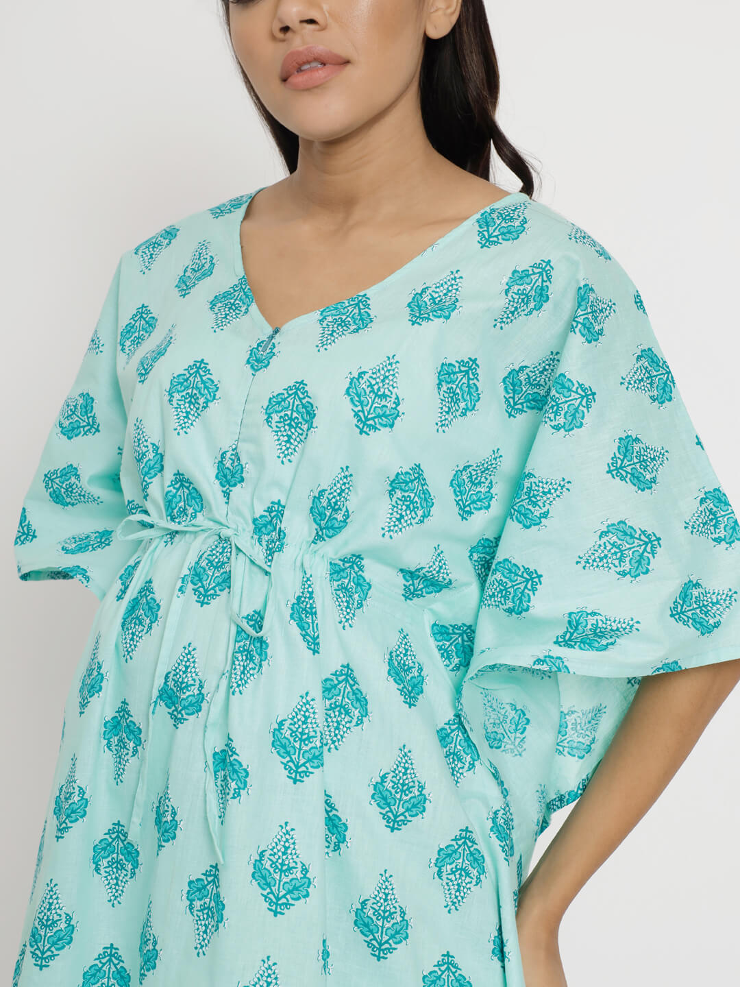 Turquoise Blue Printed Maternity Feeding Kaftan Night Suit