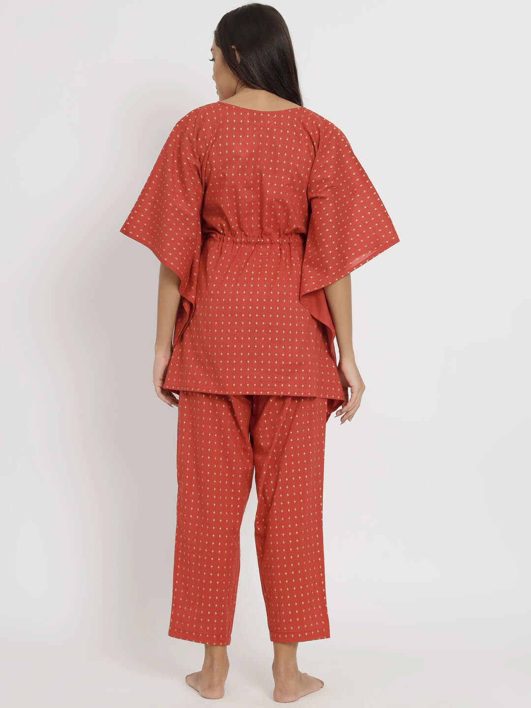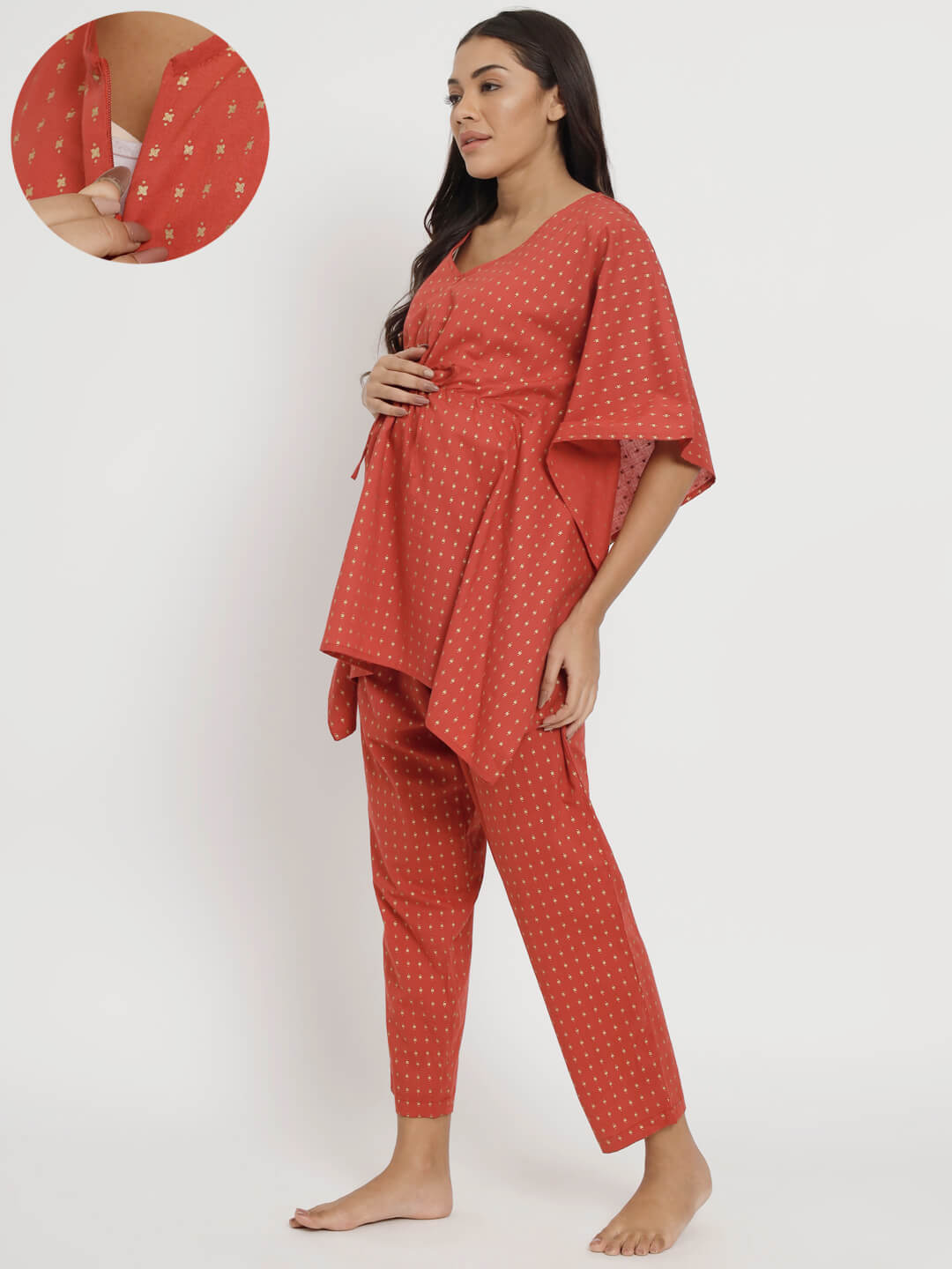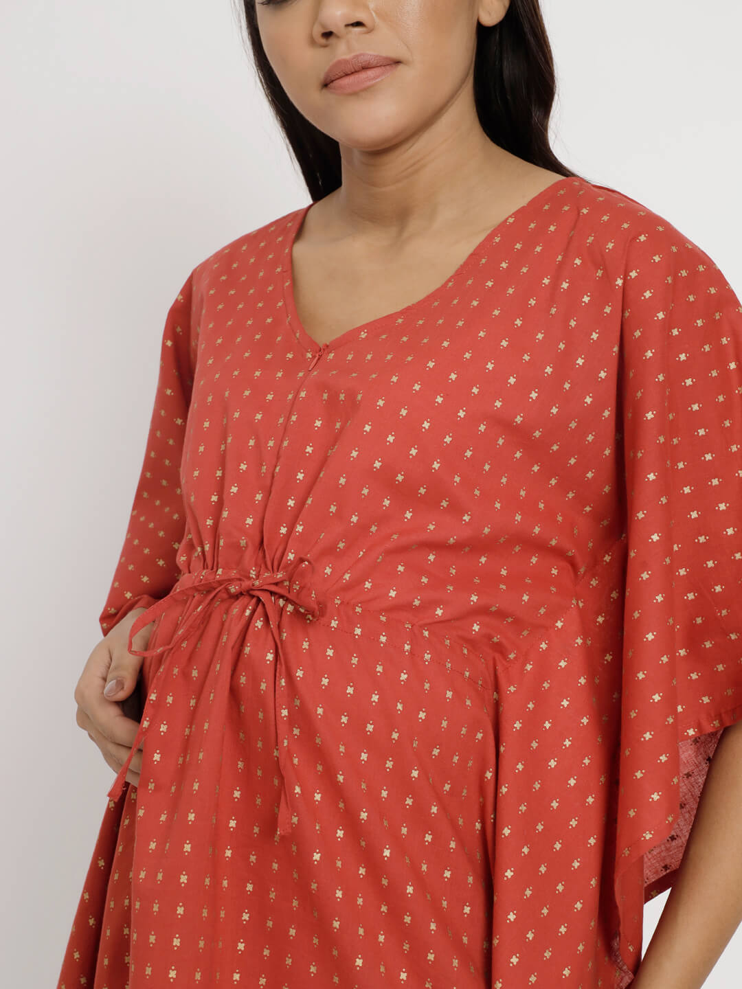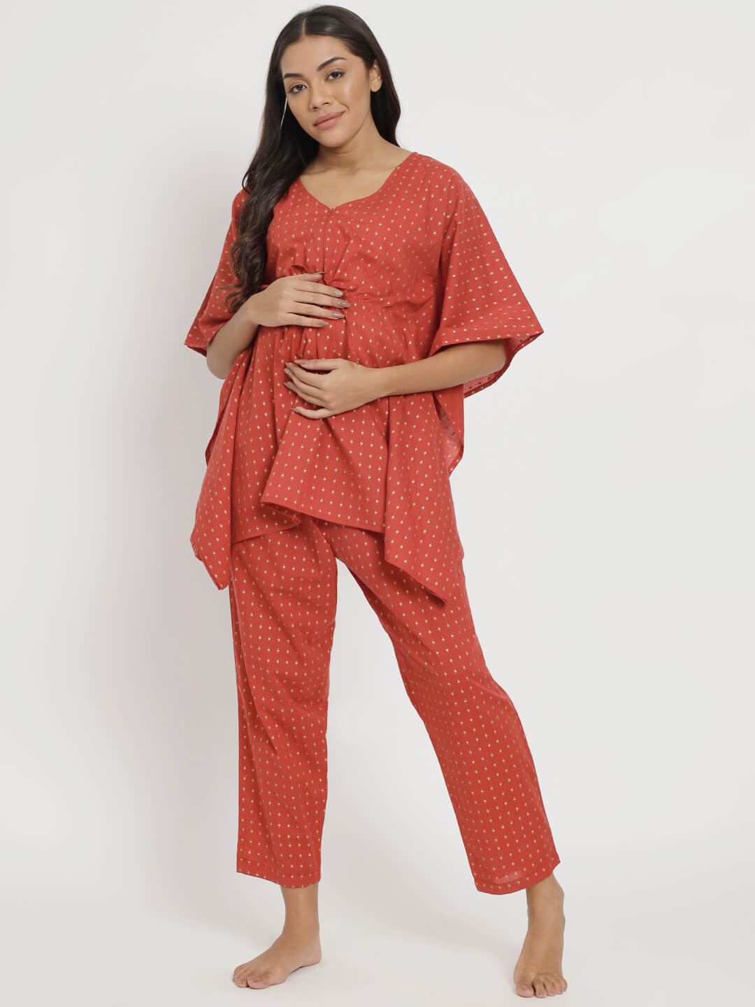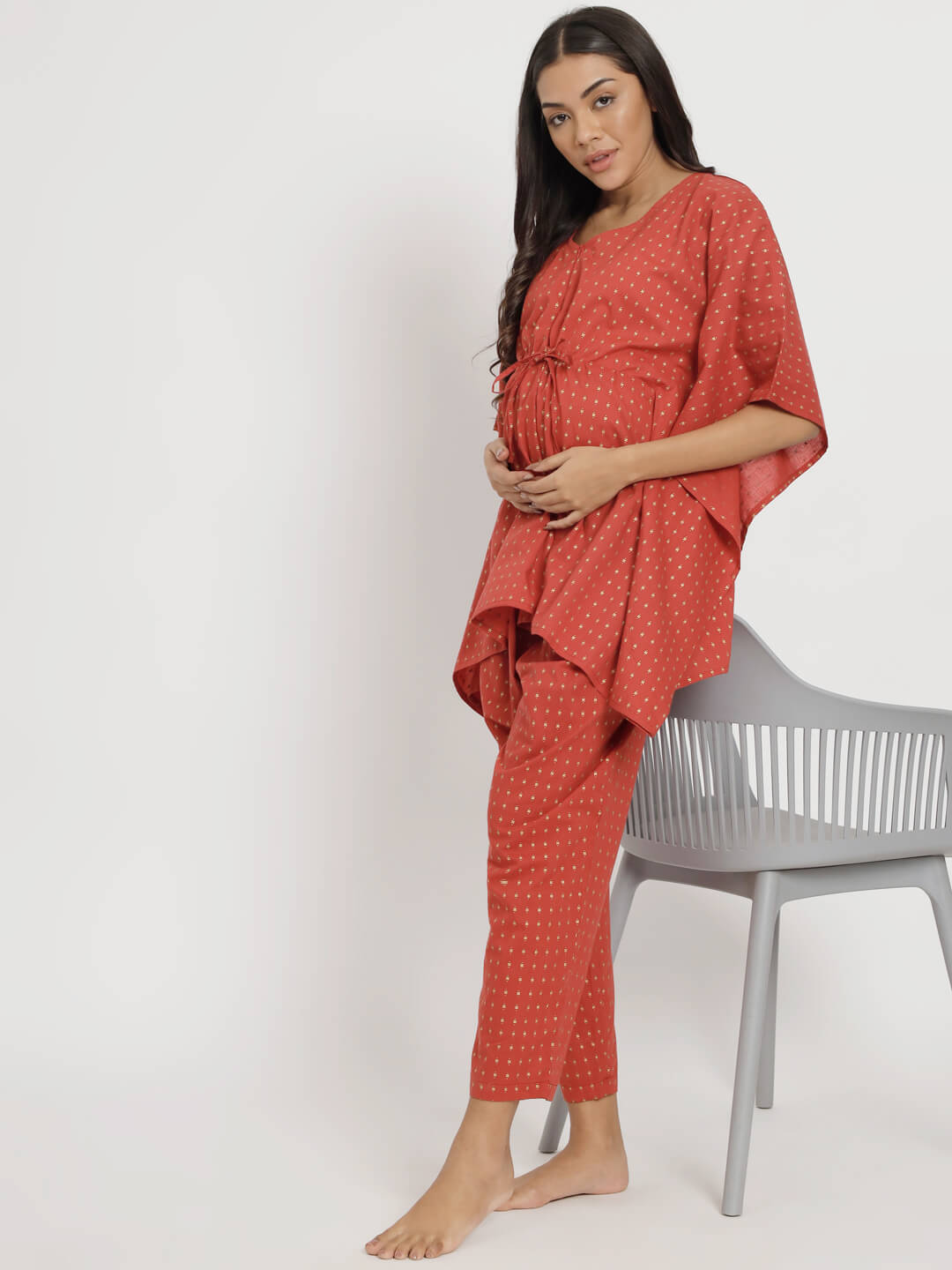 Maroon Printed Maternity Feeding Kaftan Night Suit