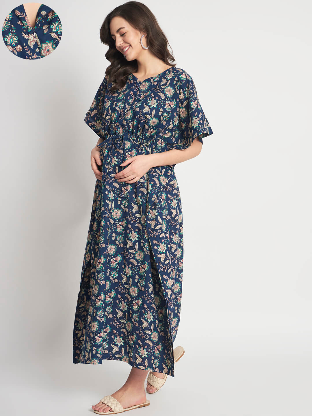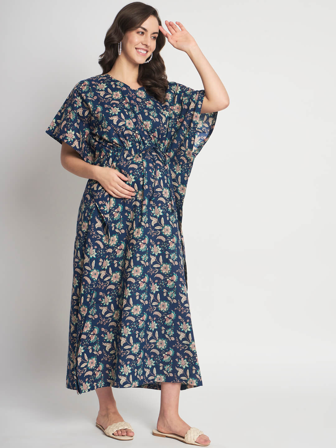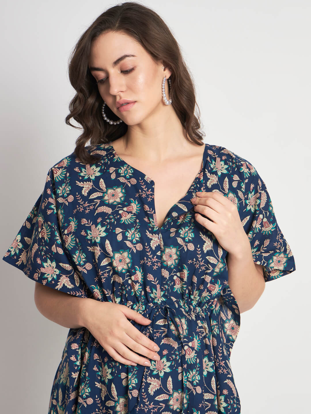 Blue Multi Cotton Printed Front Zipper Maternity Feeding Kaftan