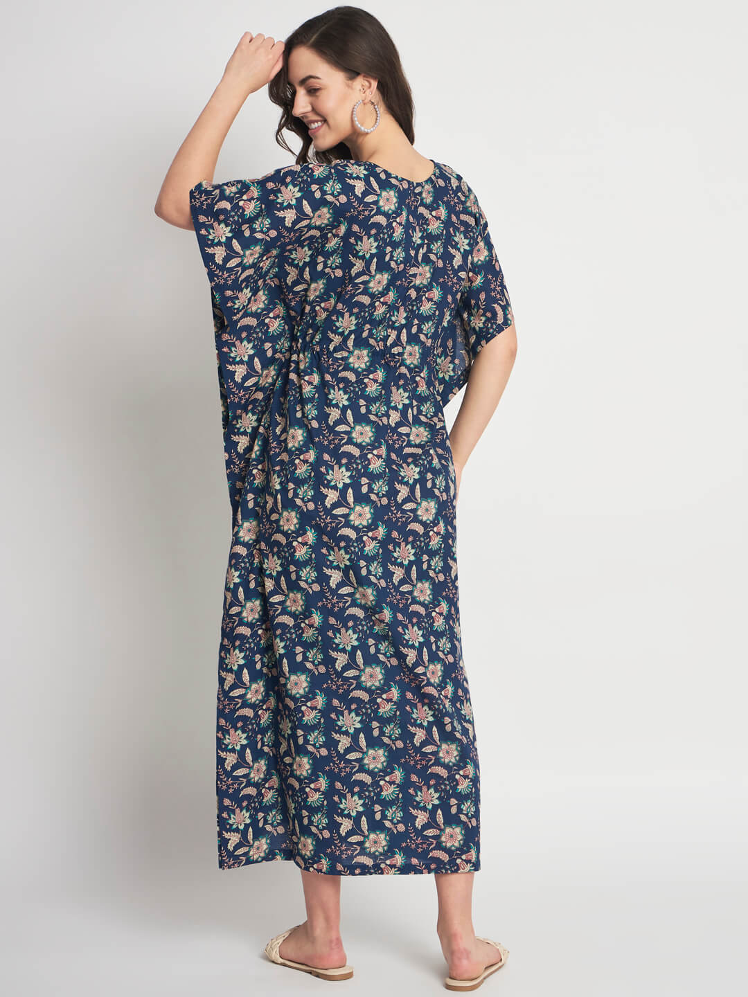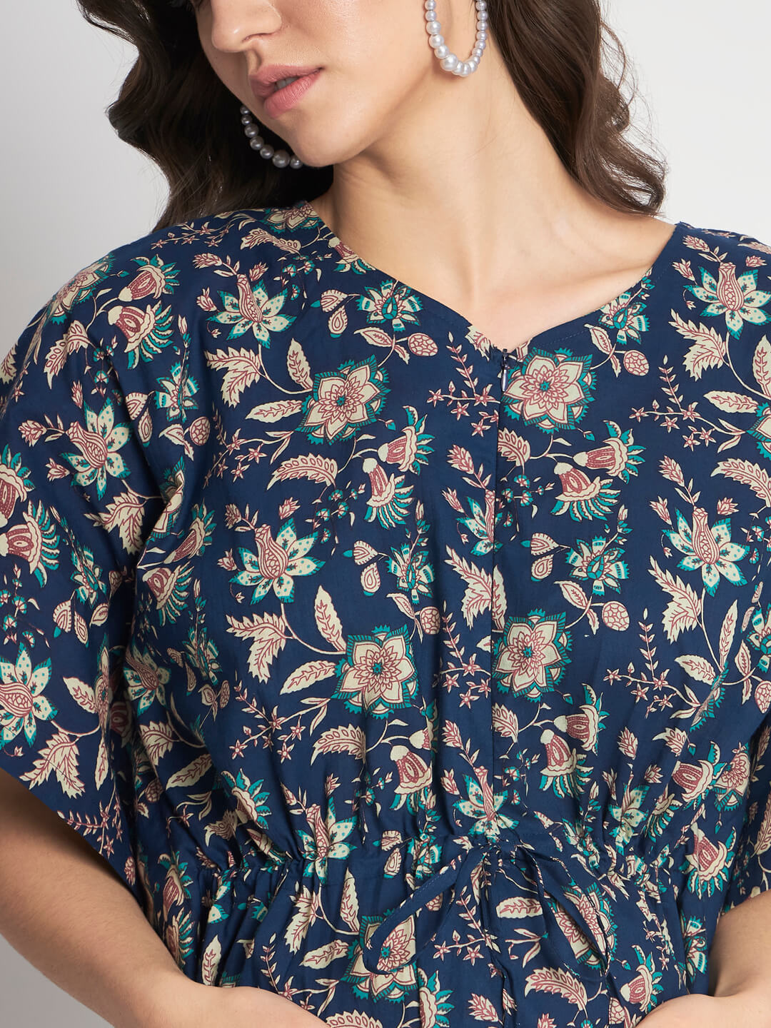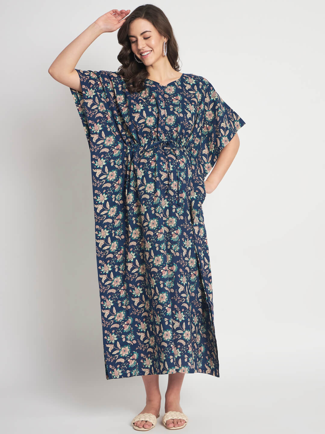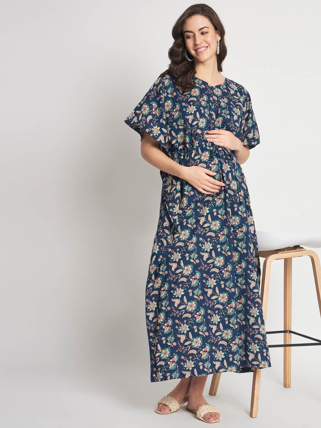 Blue Multi Cotton Printed Front Zipper Maternity Feeding Kaftan