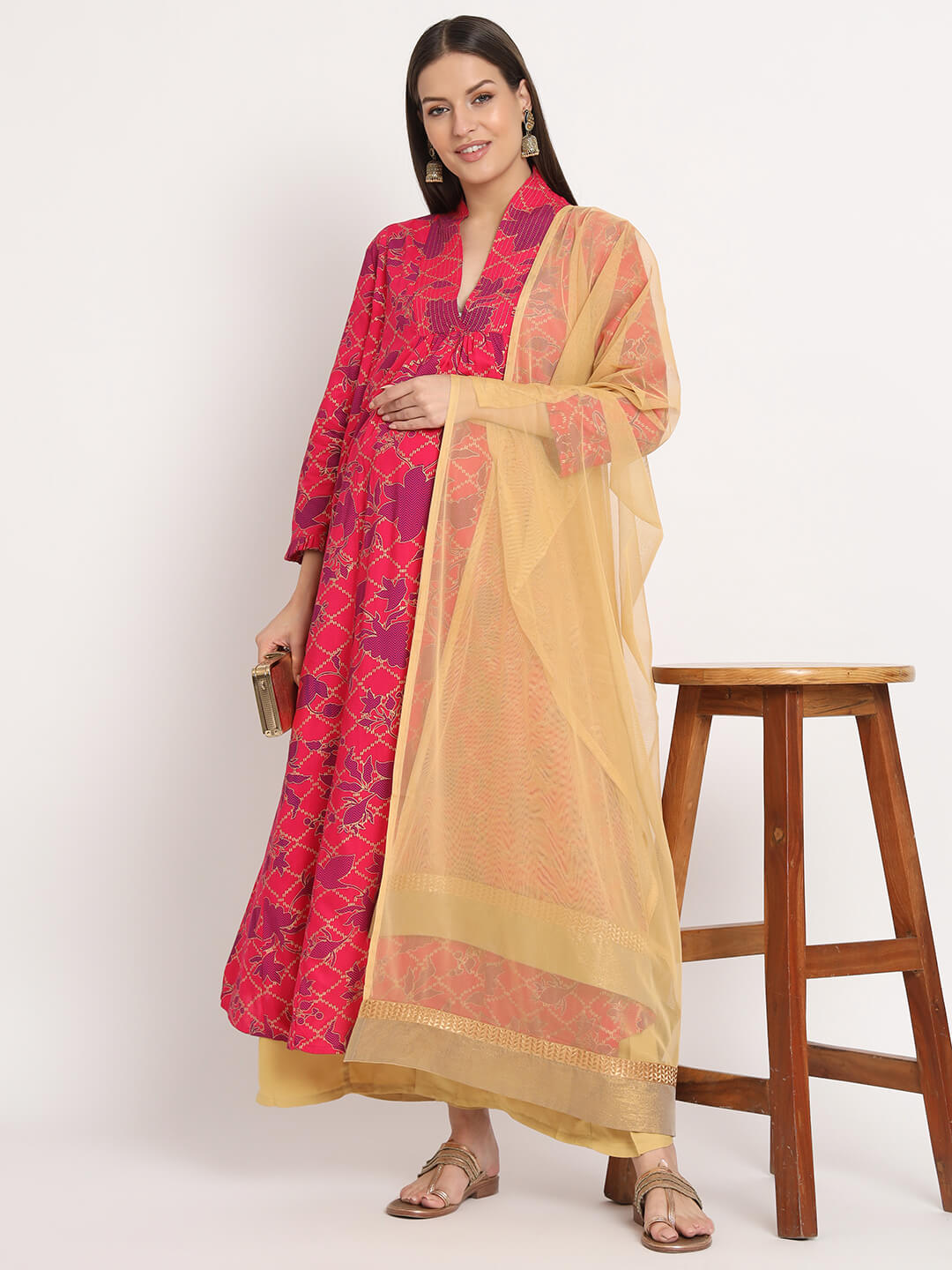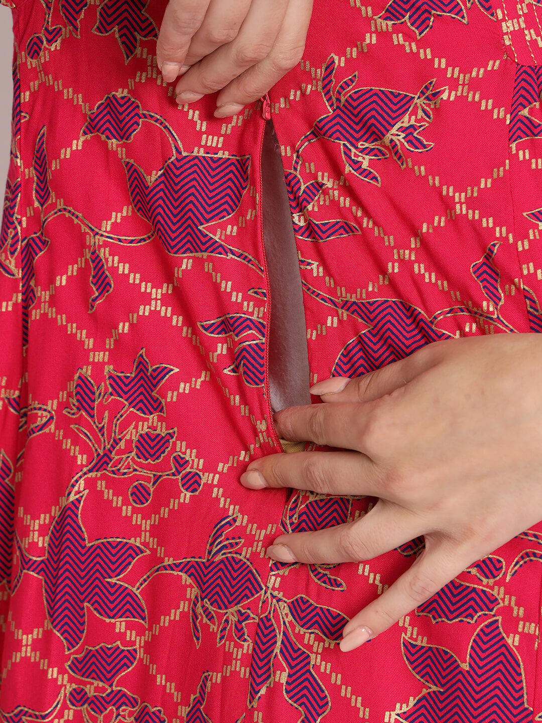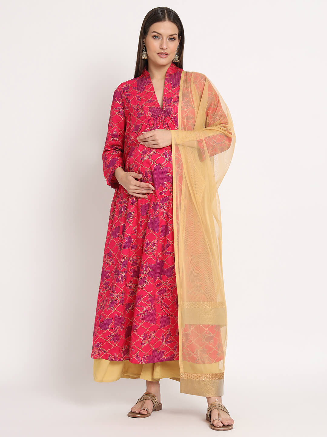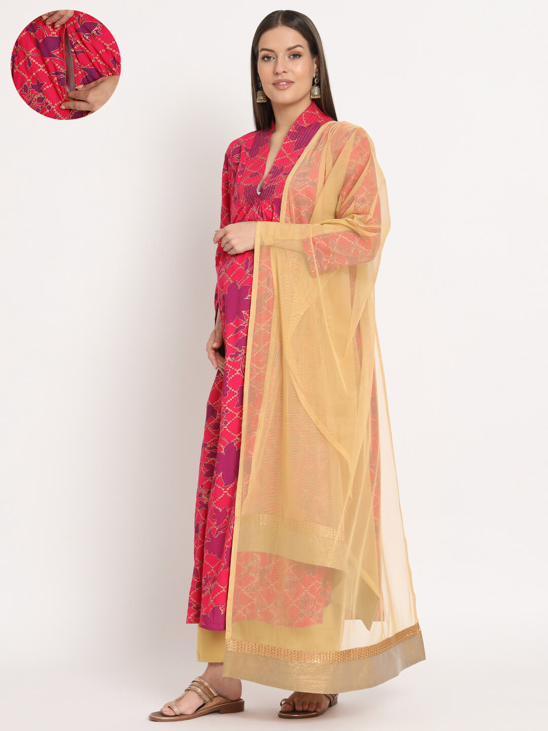 Fuchsia Multi Rayon Printed Maternity Feeding Kurta Set